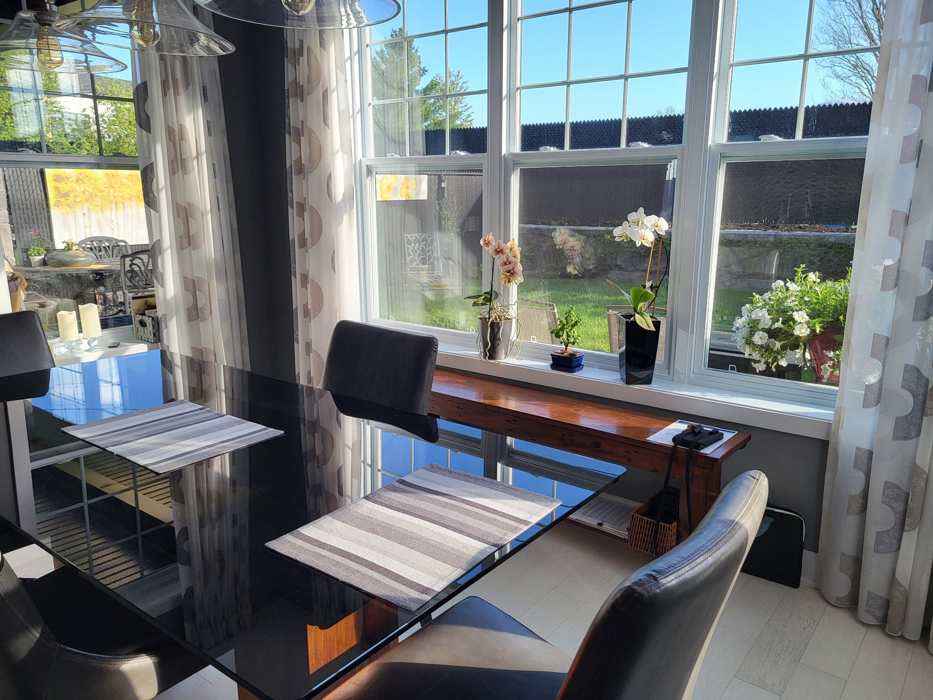 - Habillage des fenêtres de la salle à manger et du salon, les miroirs suspendus, les bouteilles de vin du cellier, tous les meubles et les objets de décoration.