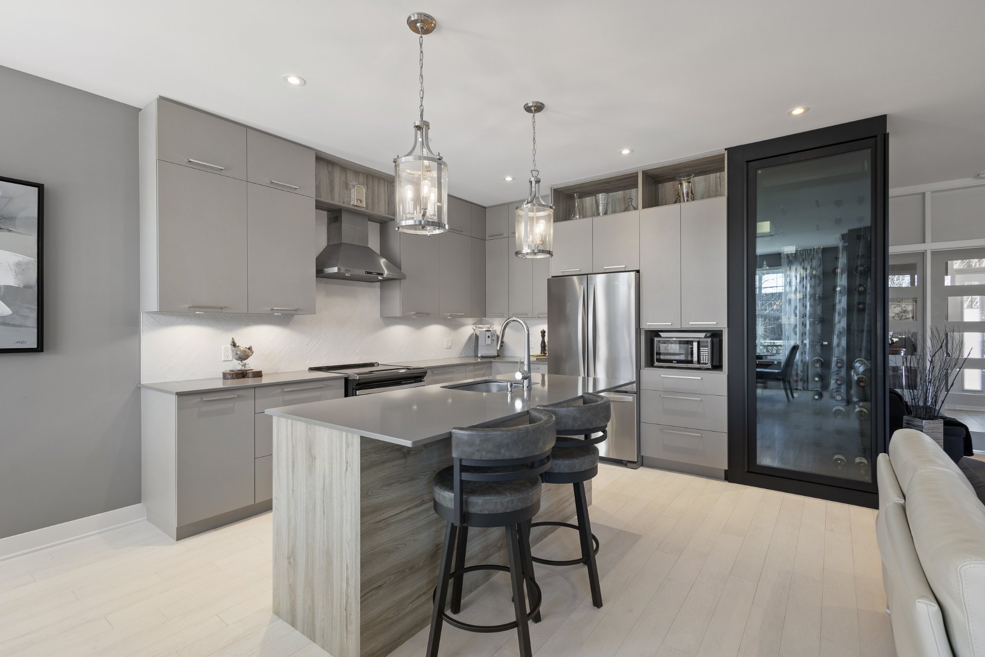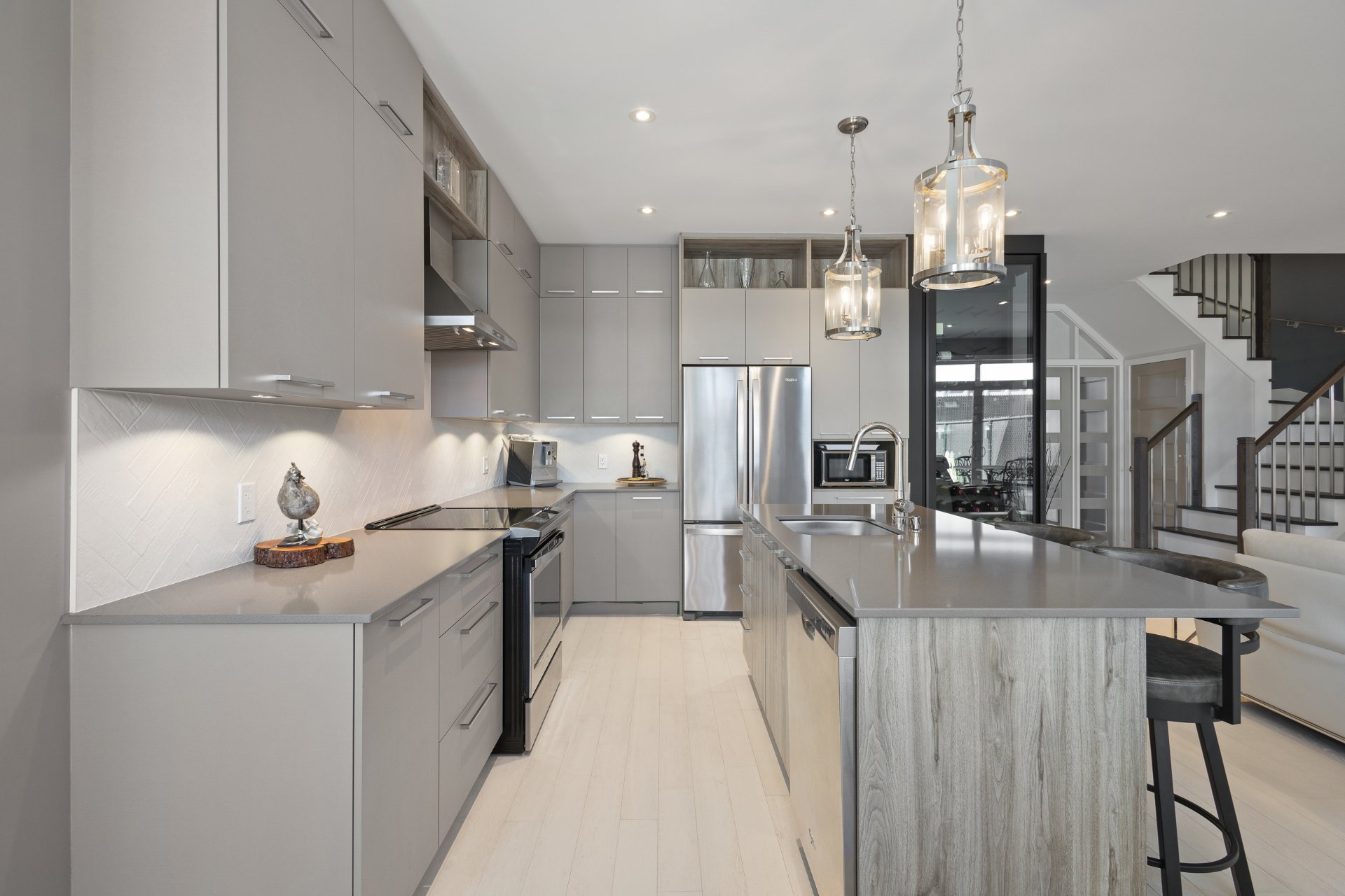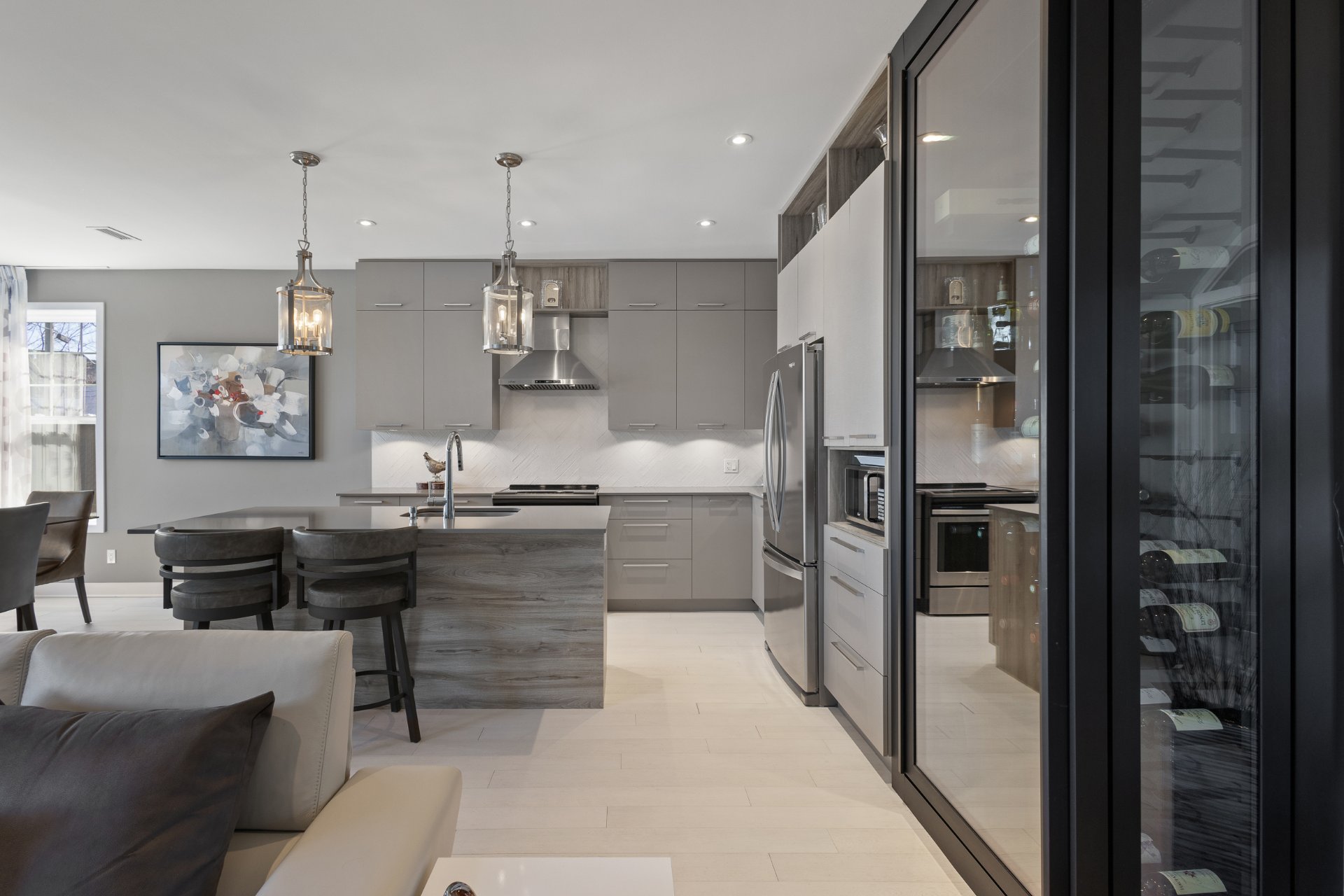 La cuisine moderne, aux tons doux et neutres, allie fonctionnalité et élégance. Son îlot central offre un espace convivial, parfait pour cuisiner ou partager un café. De nombreuses armoires assurent un rangement optimal, tandis que les matériaux de qualité et les finitions haut de gamme témoignent d'une conception soignée. Adjacent, la salle à manger permet de profiter d'un espace fluide et accueillant.