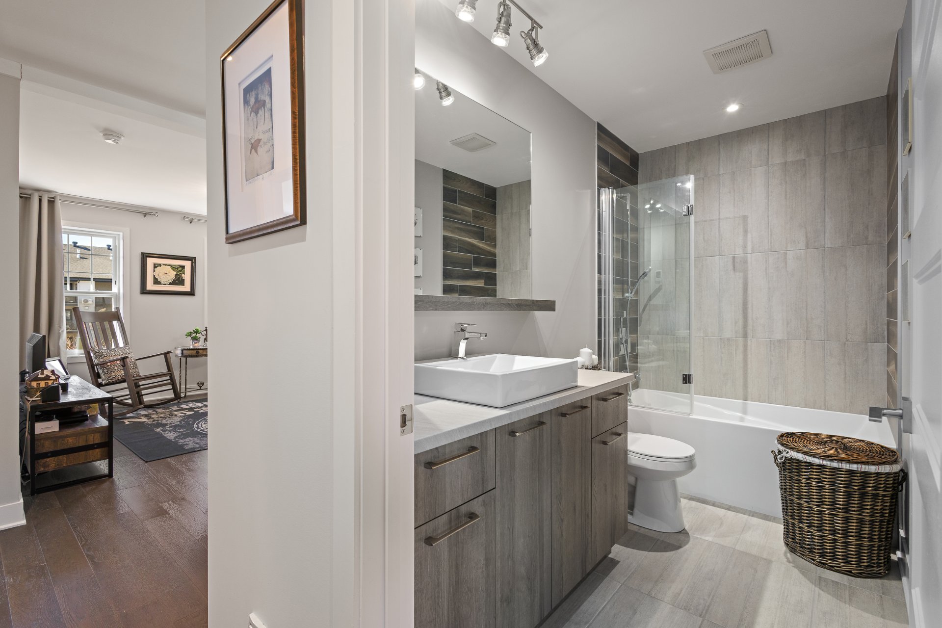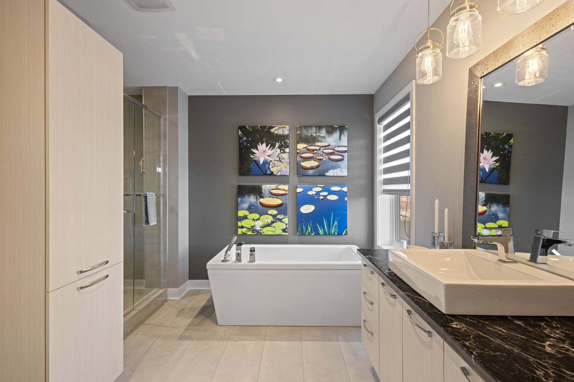 Une seconde salle de bain complète, intégrant un espace pour laveuse et sécheuse, est conçue pour répondre aux besoins de la famille et des invités.