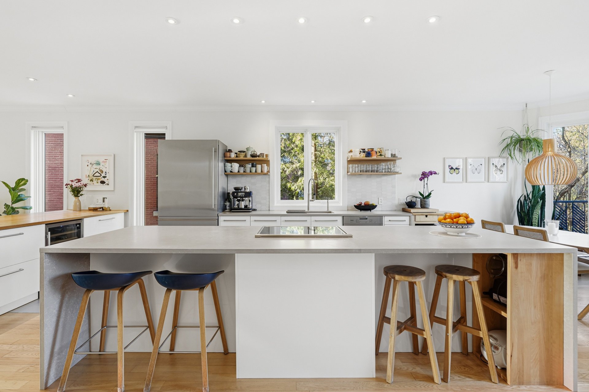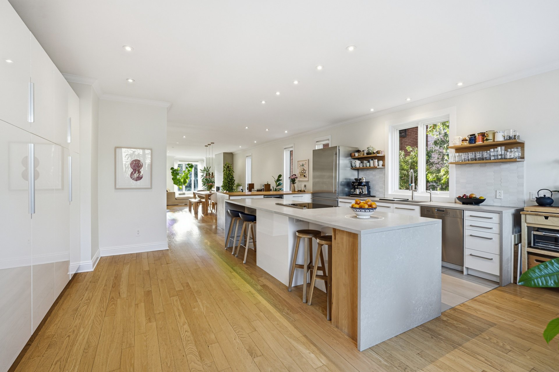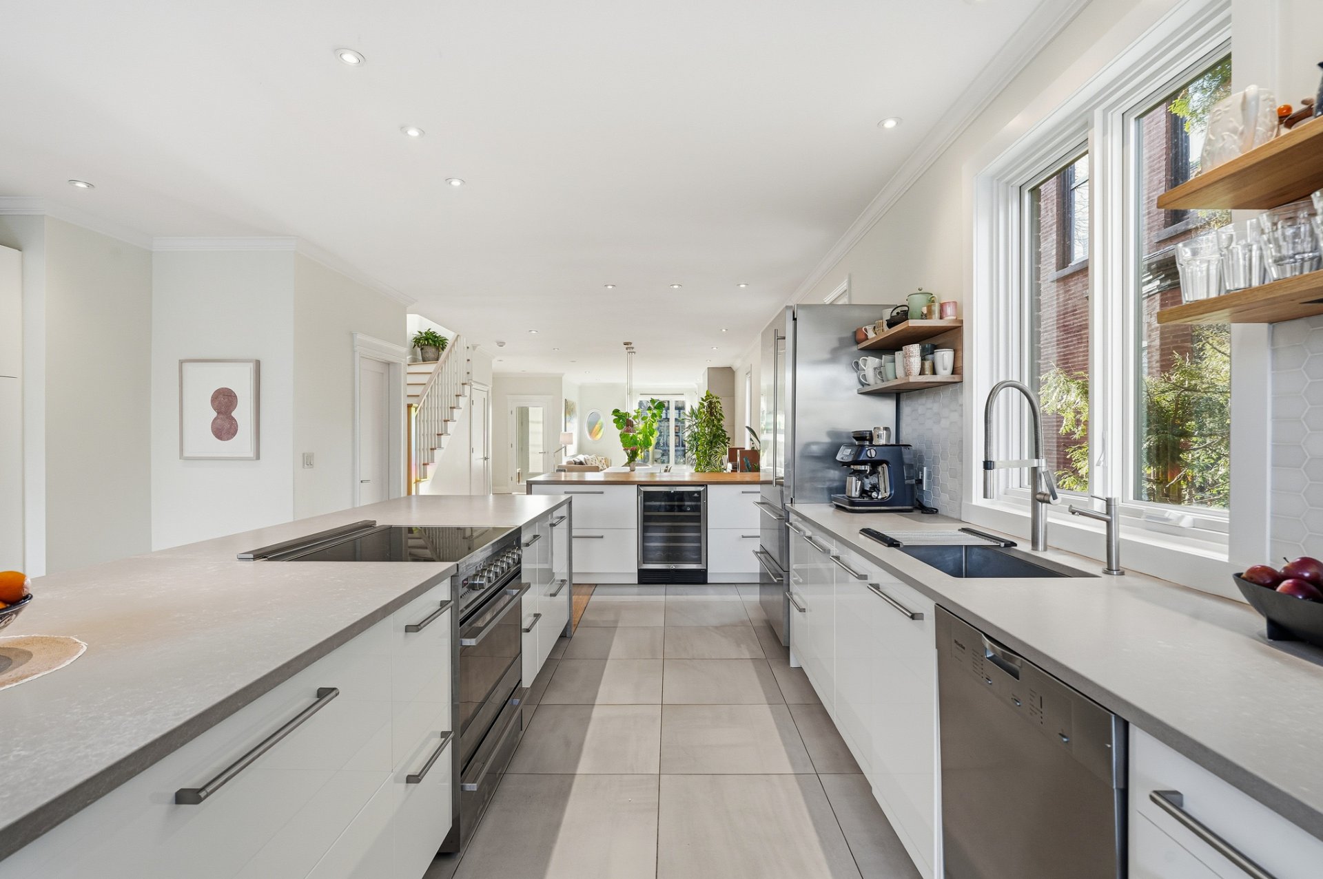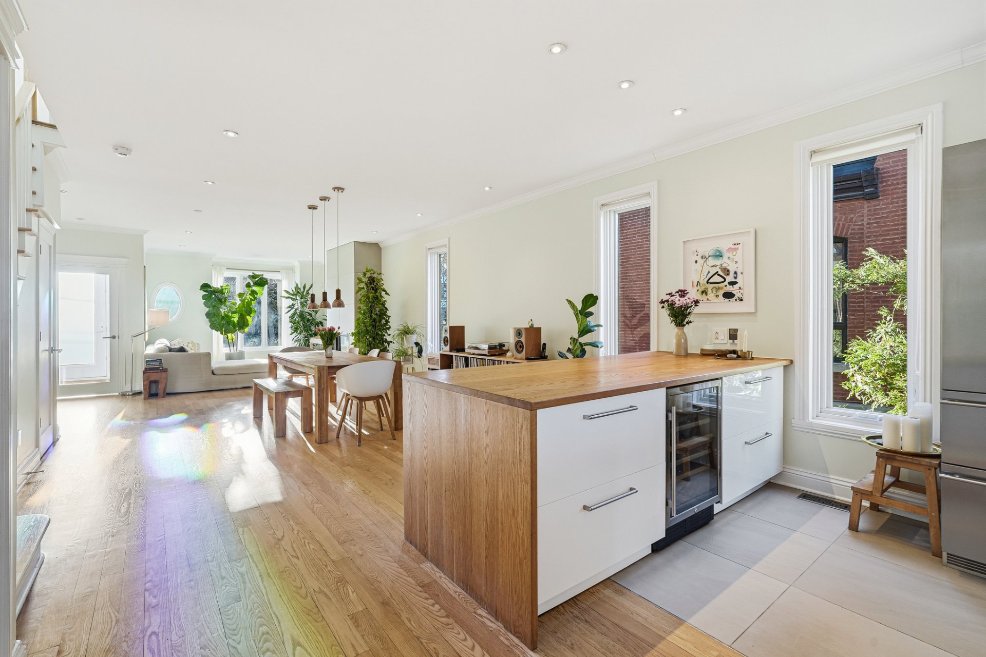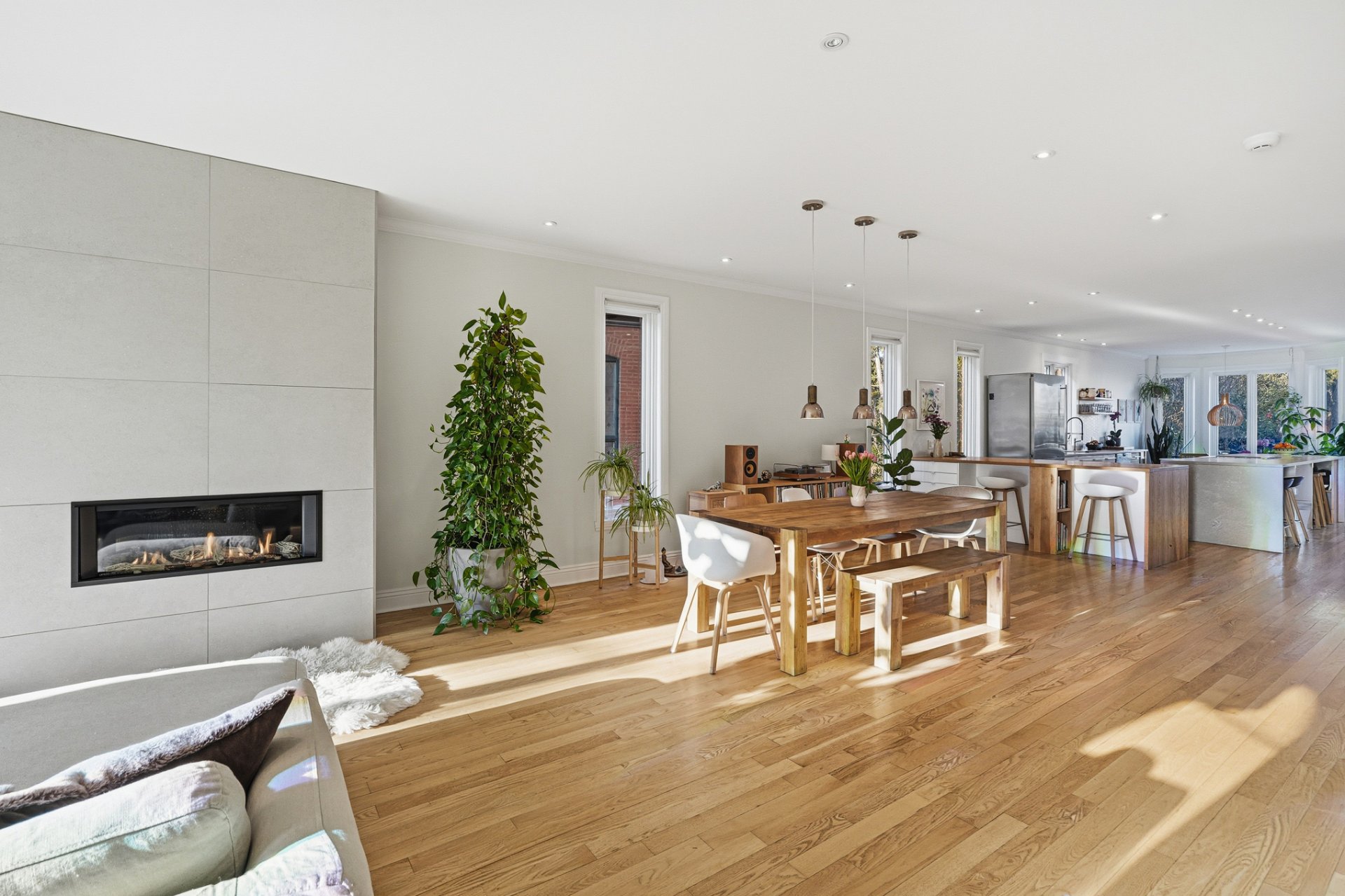 Propriété méticuleusement et harmonieusement rénovée au fil des années mettant en valeur une fenestration abondante, une chaleureuse cheminée au gaz et une continuité élégante. Cuisine vaste et professionnelle incluant un immense îlot central, électroménagers haut de gamme, cellier, comptoirs de quartz, multiples espaces de rangement intégrés et coin dinette enveloppé de baies vitrées donnant sur la cour.