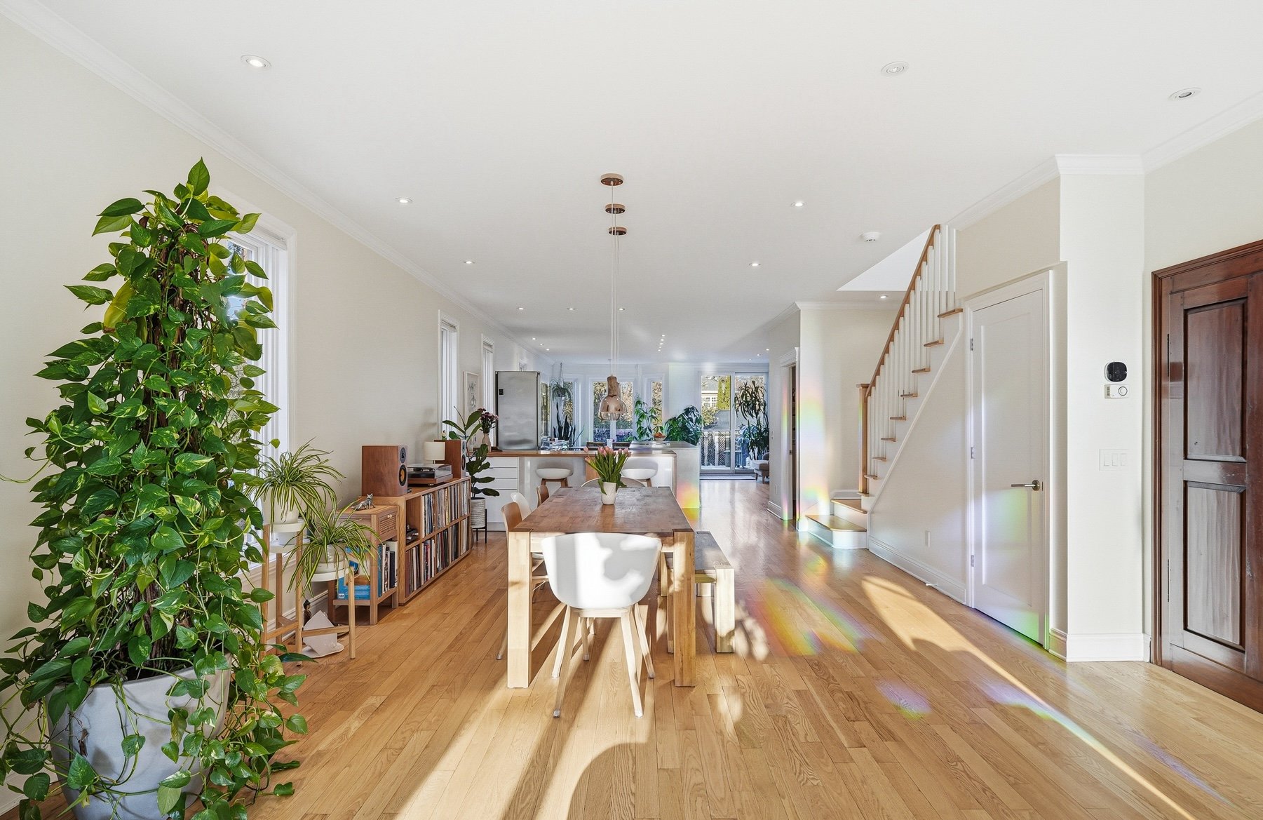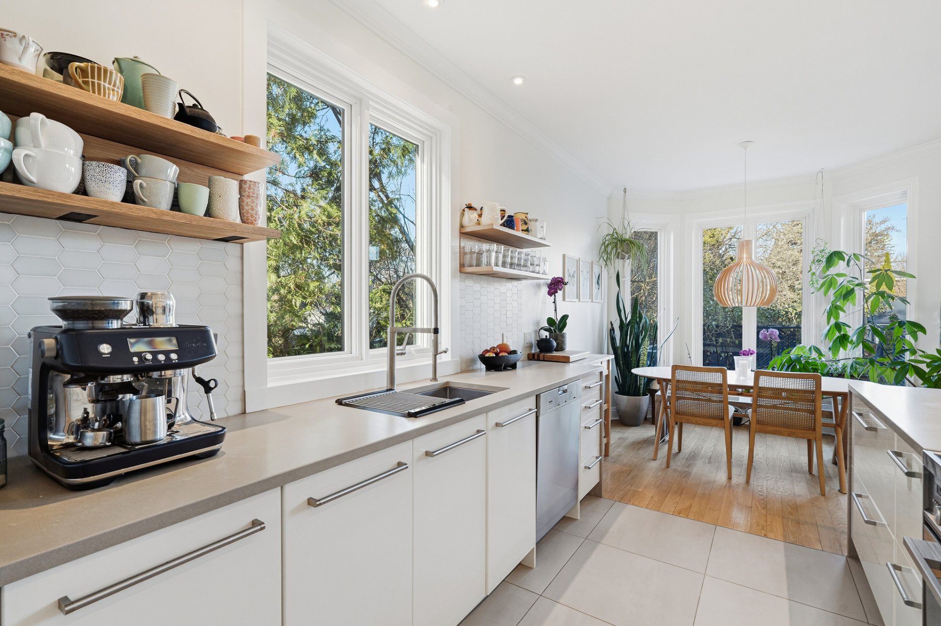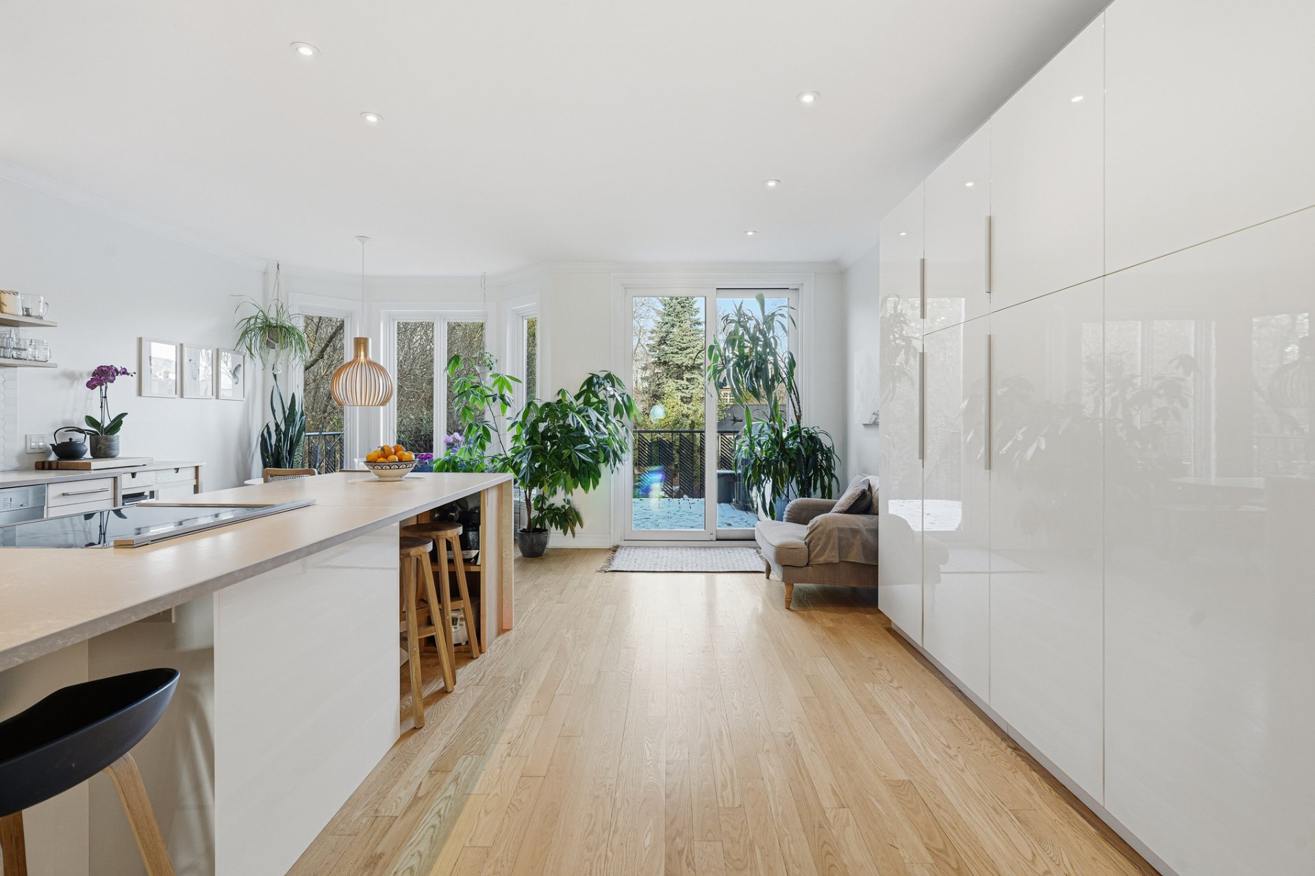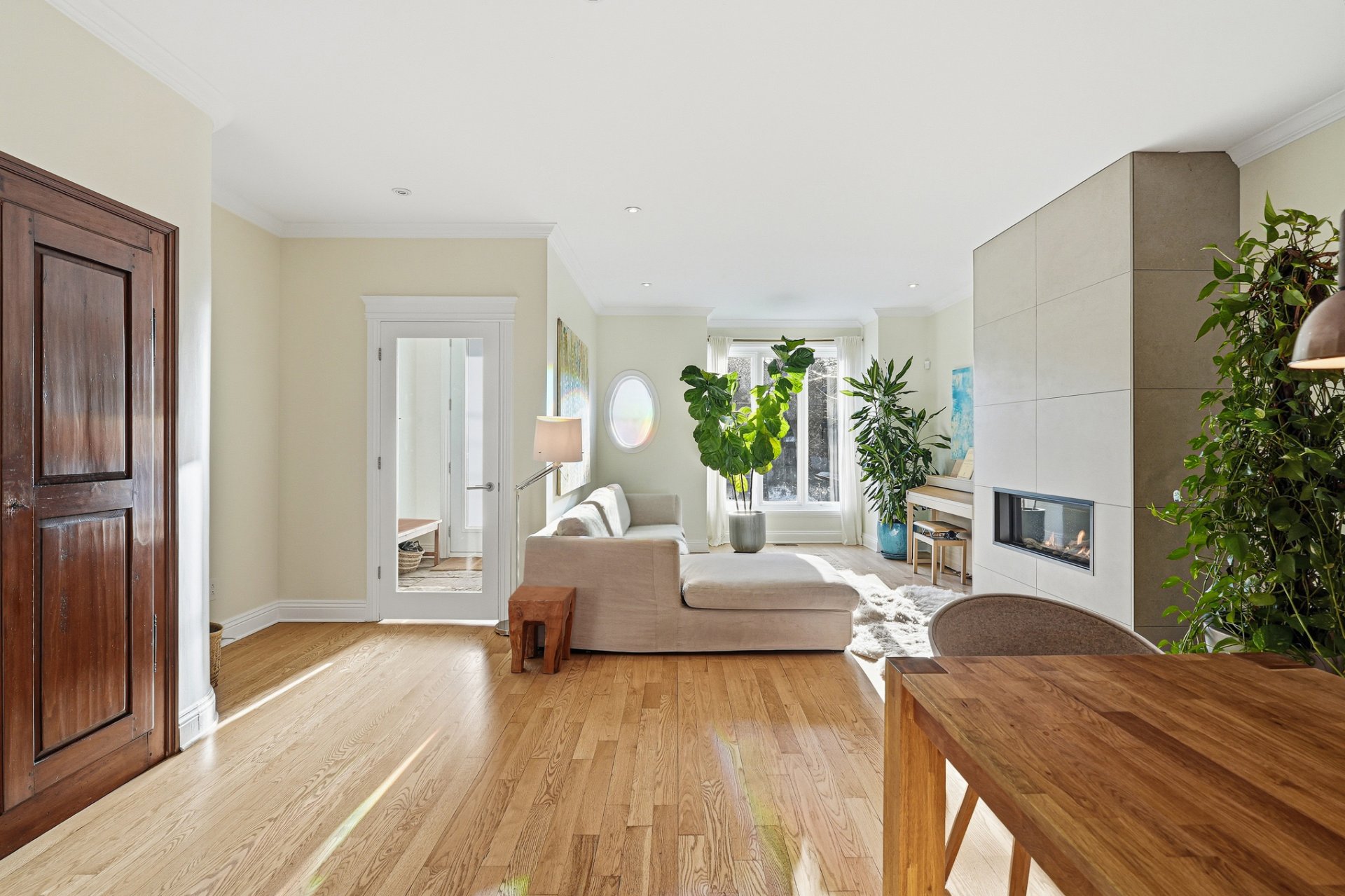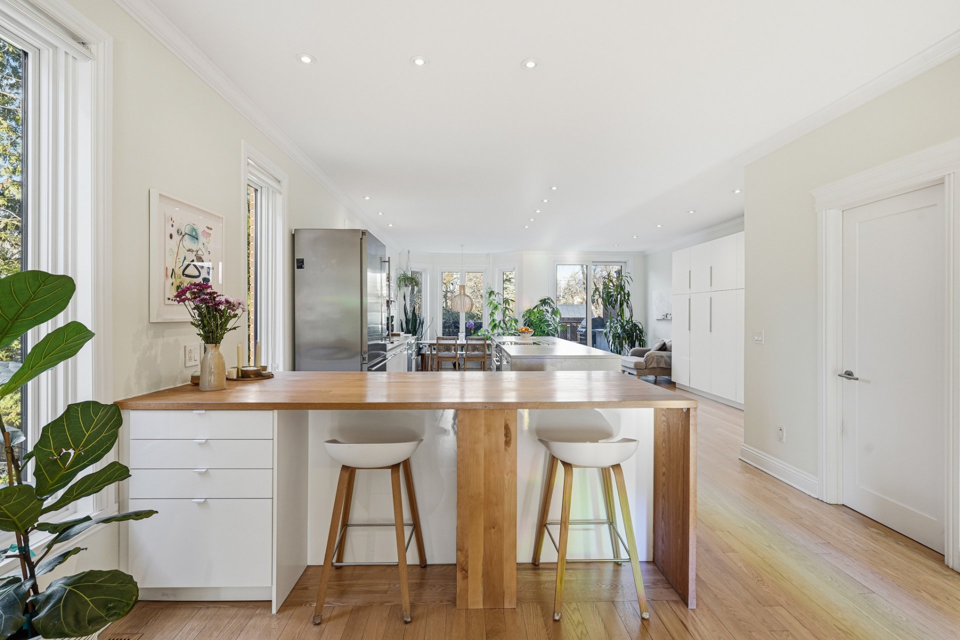 Propriété méticuleusement et harmonieusement rénovée au fil des années mettant en valeur une fenestration abondante, une chaleureuse cheminée au gaz et une continuité élégante. Cuisine vaste et professionnelle incluant un immense îlot central, électroménagers haut de gamme, cellier, comptoirs de quartz, multiples espaces de rangement intégrés et coin dinette enveloppé de baies vitrées donnant sur la cour.