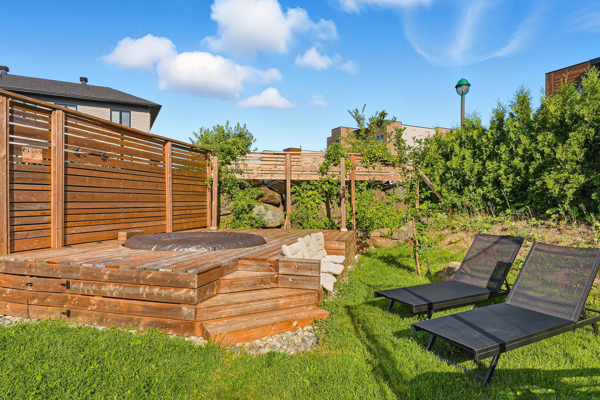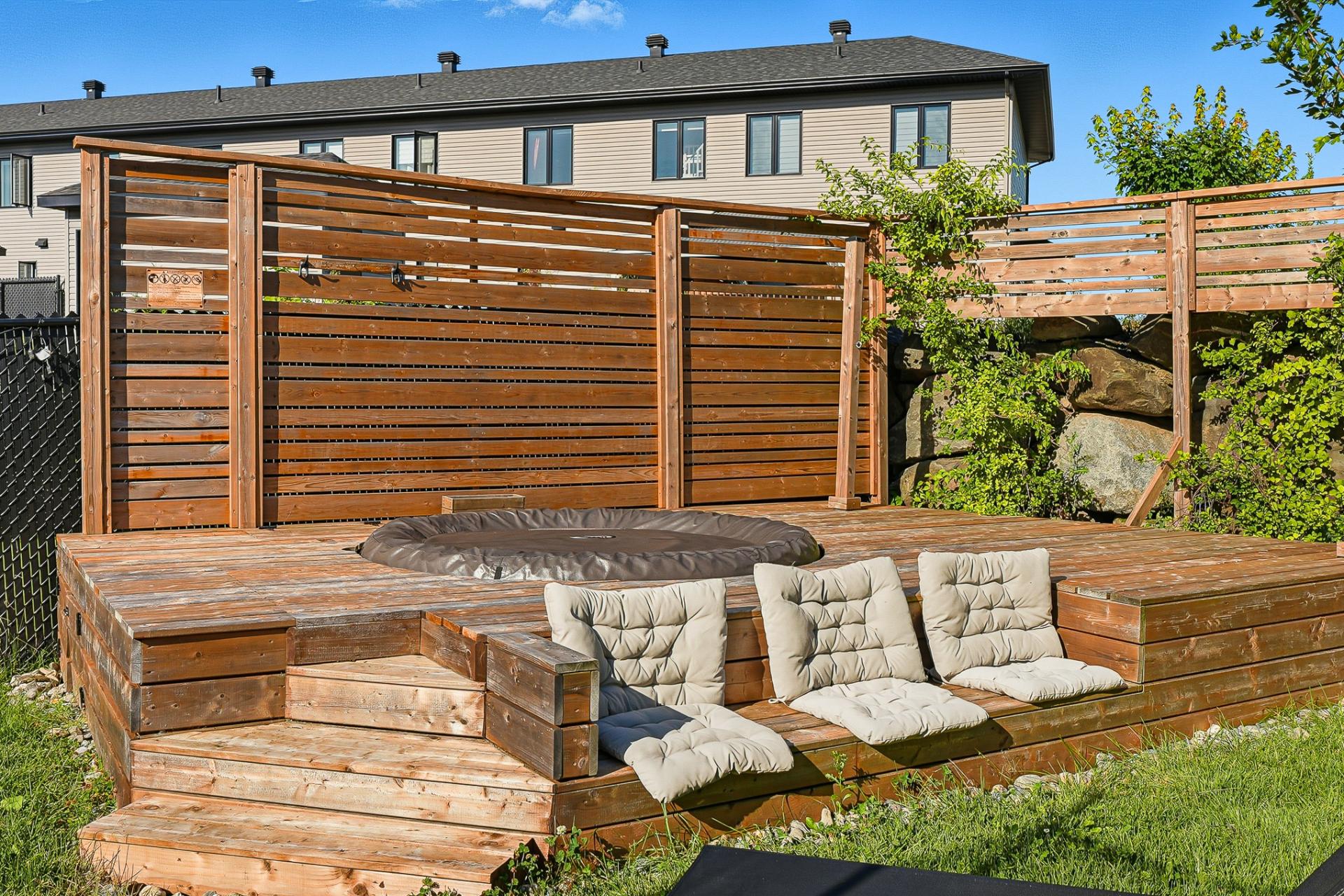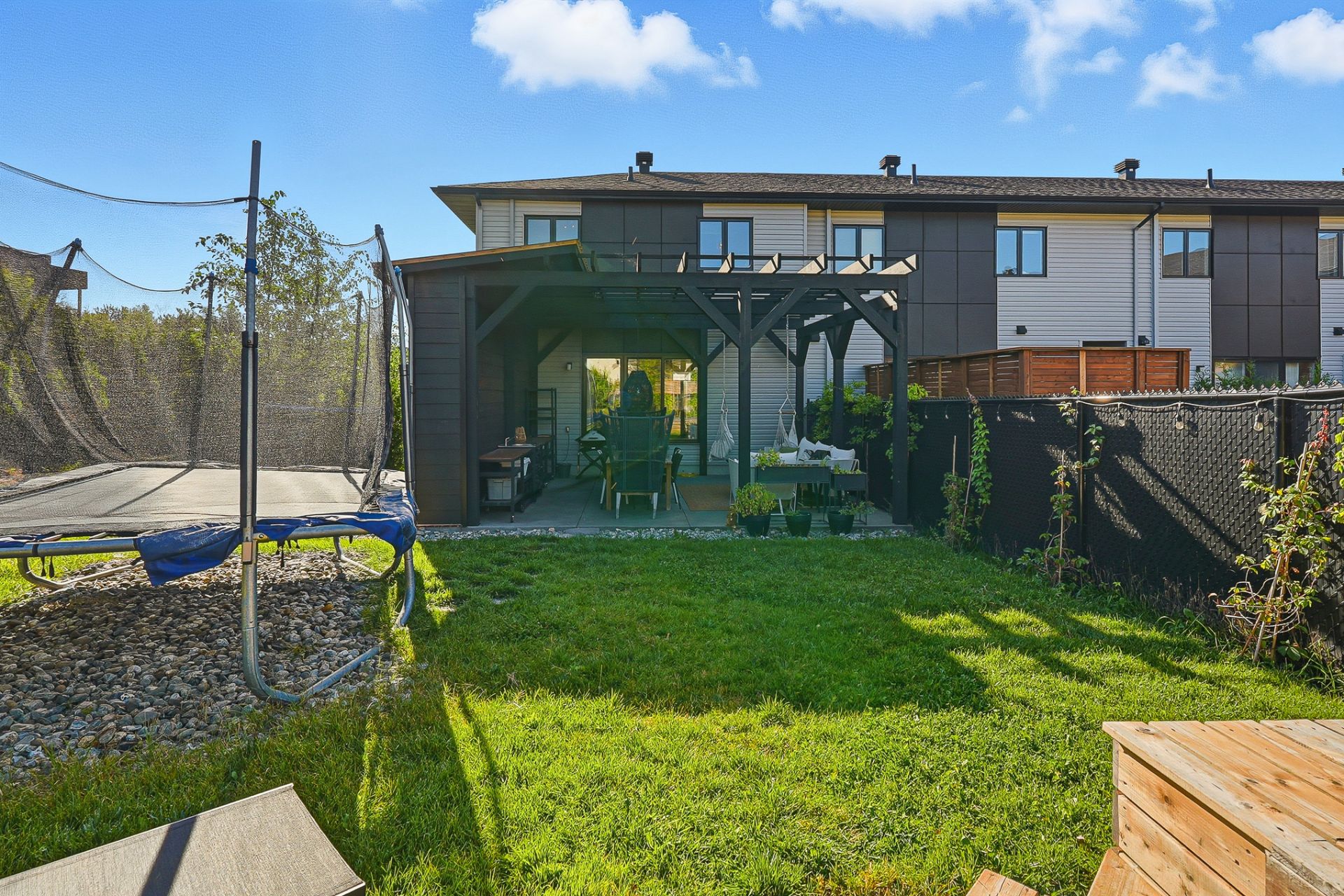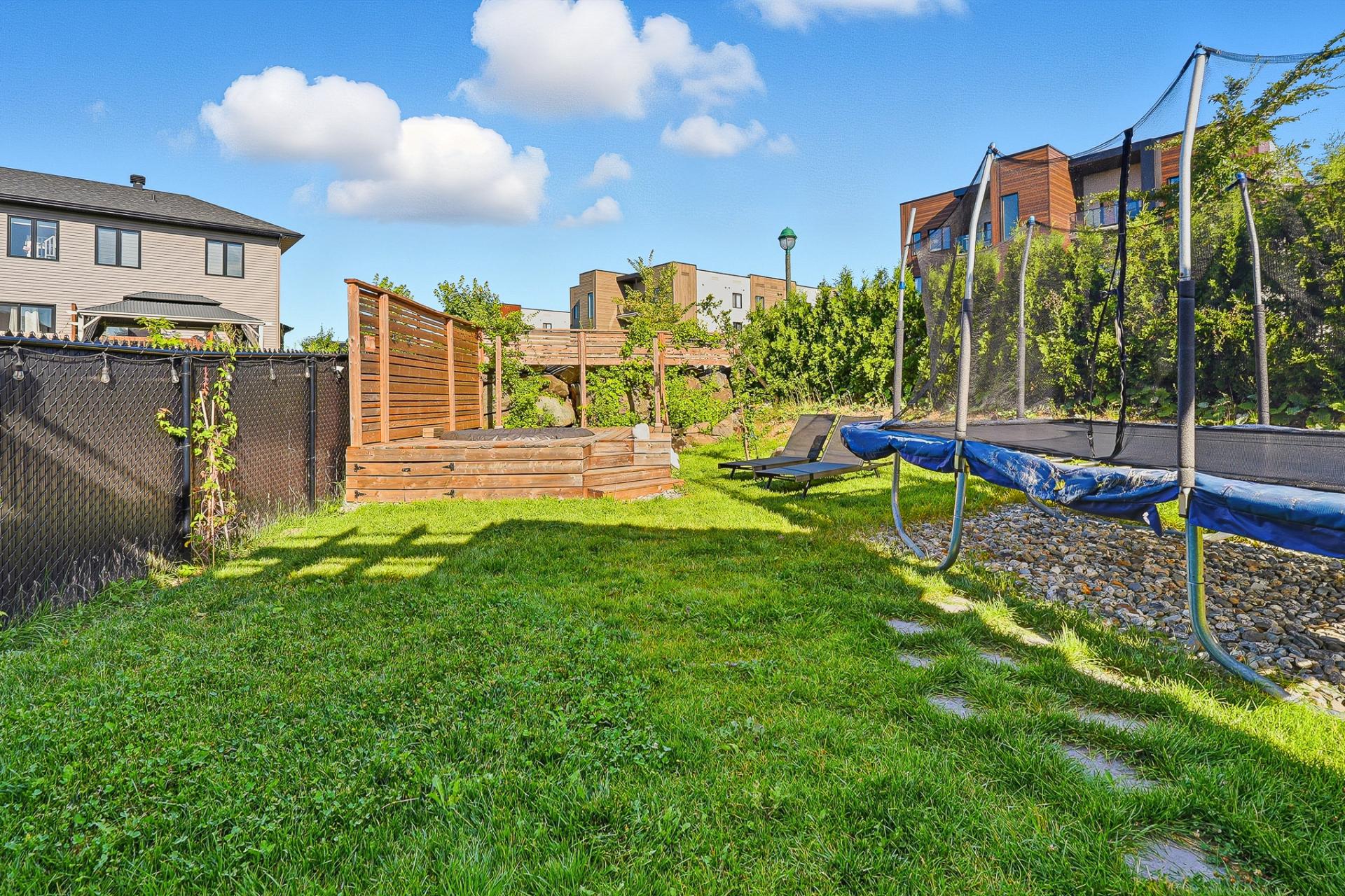 À l'extérieur, la cour arrière, véritable coup de coeur, propose un aménagement complet et soigné. On y retrouve un coin salon avec feu, des chaises suspendues, une salle à manger extérieure avec cuisine d'été, de la végétation grimpante ainsi qu'une terrasse arrière aménagée avec spa gonflable et chaises longues pour la détente. Un trampoline vient compléter l'espace pour le plaisir des enfants.