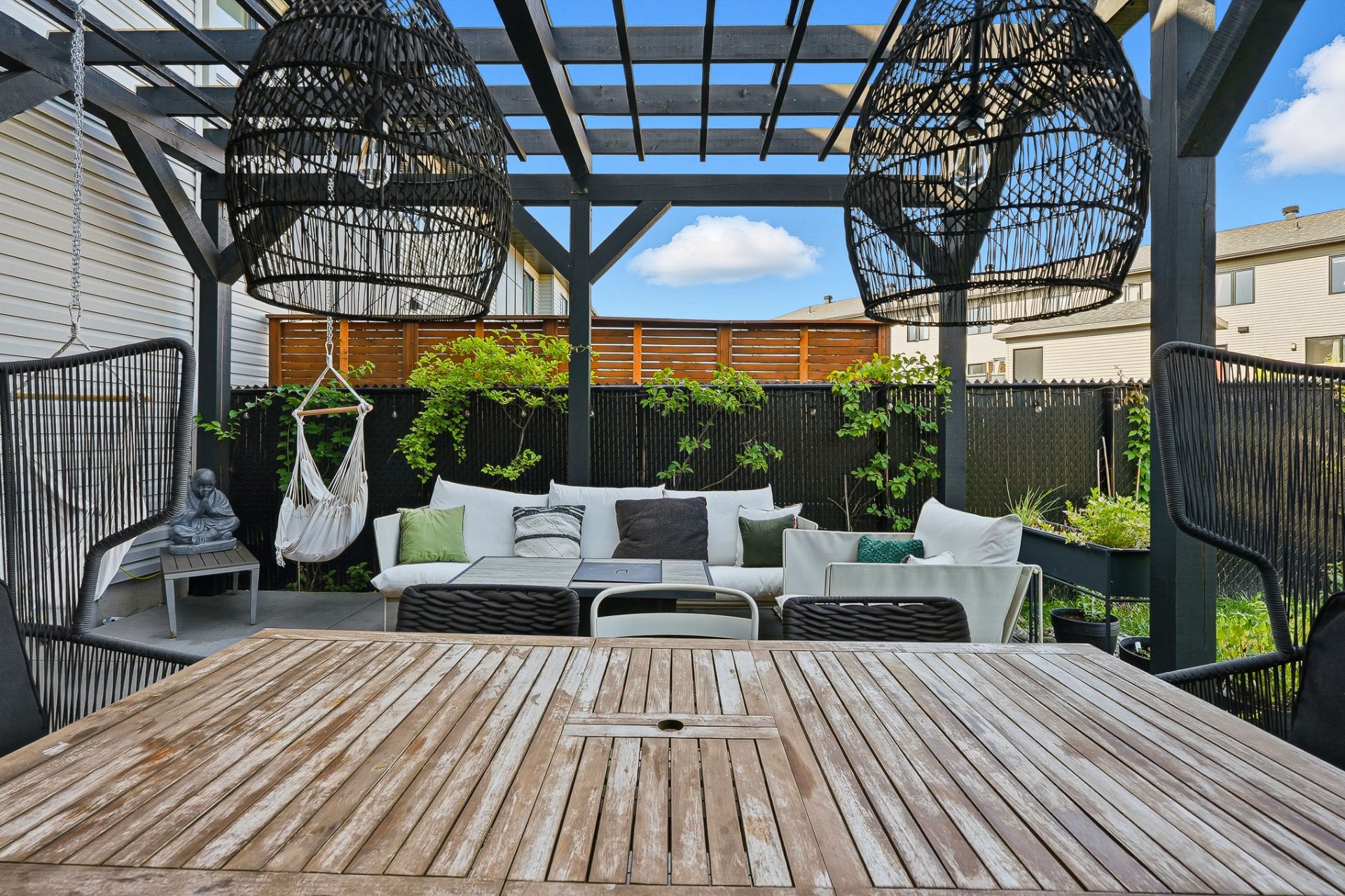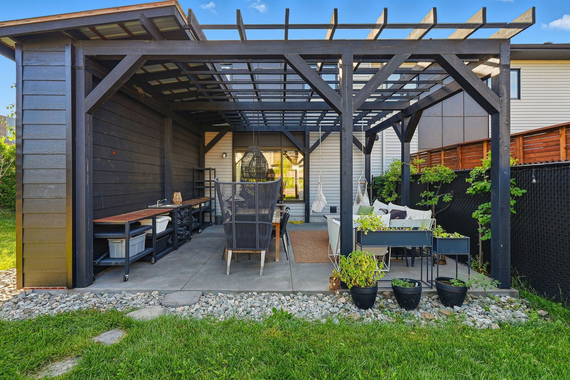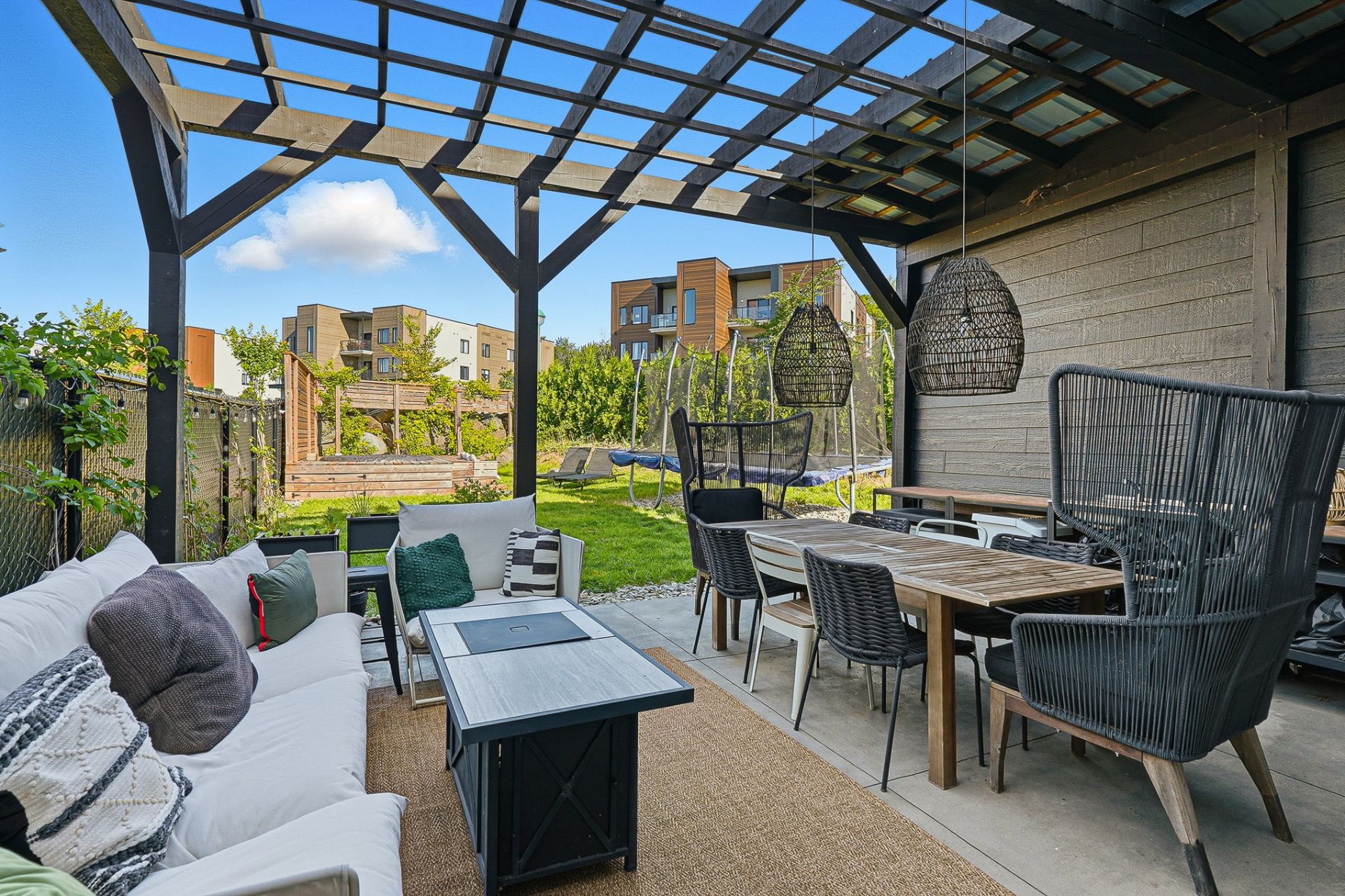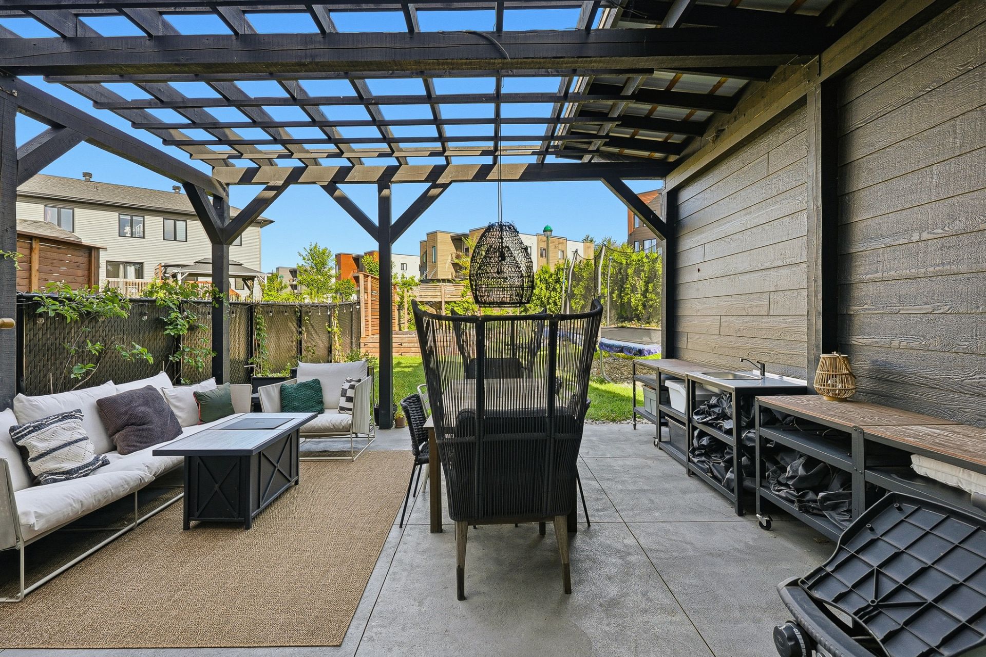 À l'extérieur, la cour arrière, véritable coup de coeur, propose un aménagement complet et soigné. On y retrouve un coin salon avec feu, des chaises suspendues, une salle à manger extérieure avec cuisine d'été, de la végétation grimpante ainsi qu'une terrasse arrière aménagée avec spa gonflable et chaises longues pour la détente. Un trampoline vient compléter l'espace pour le plaisir des enfants.