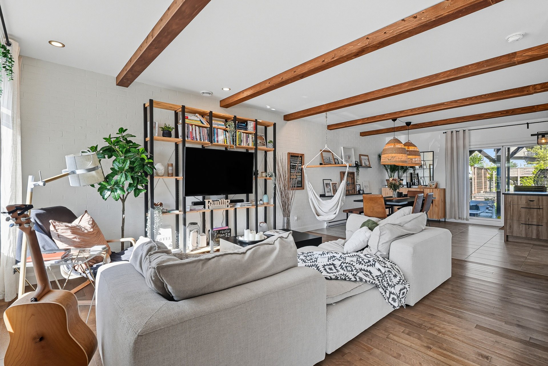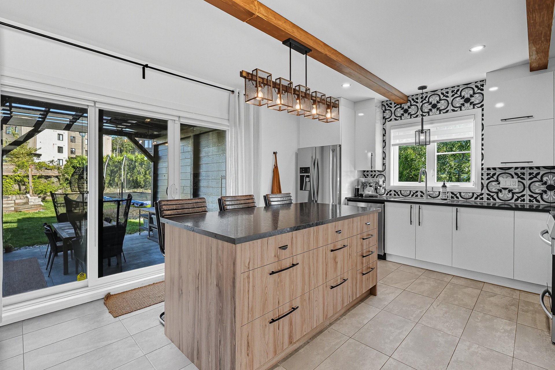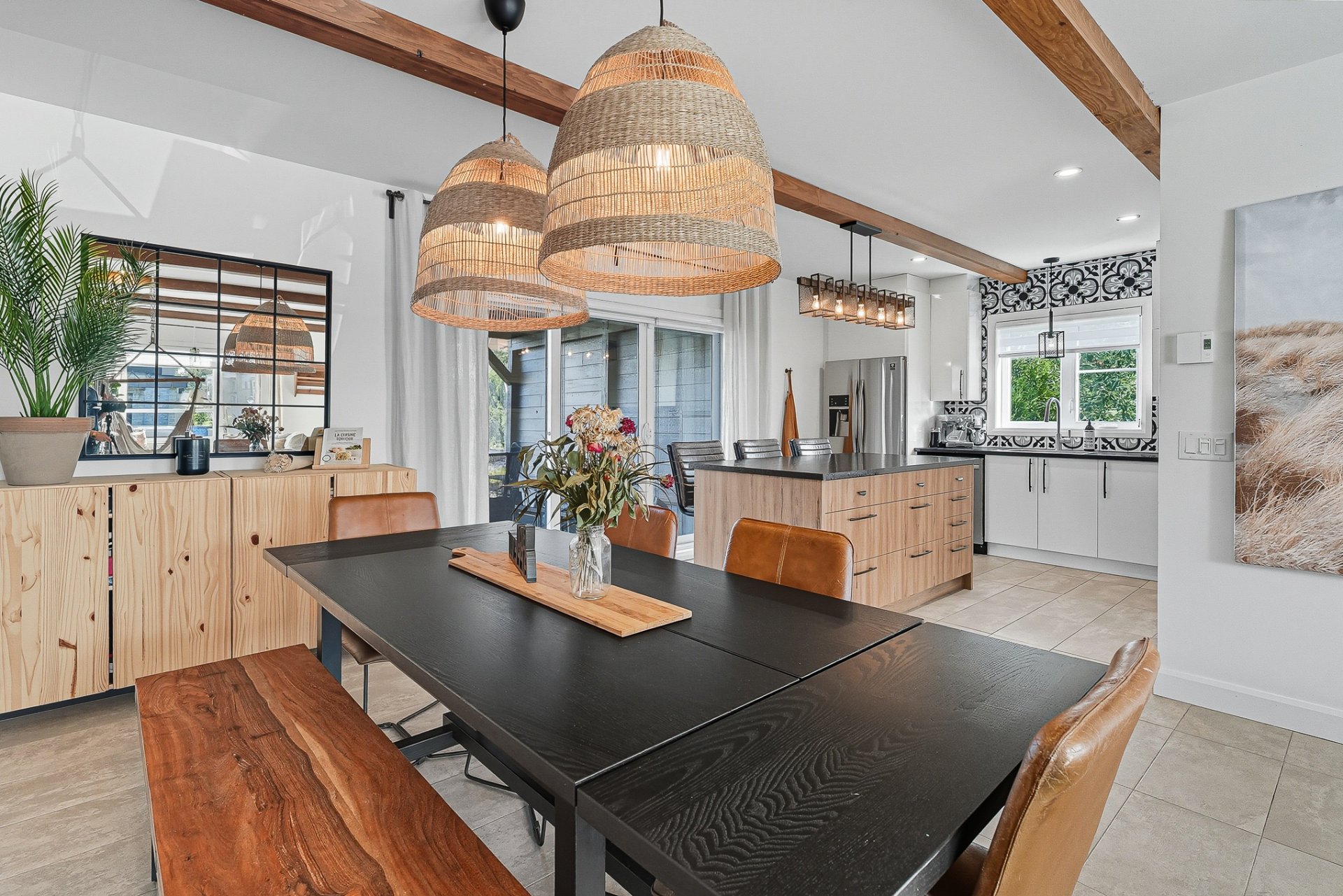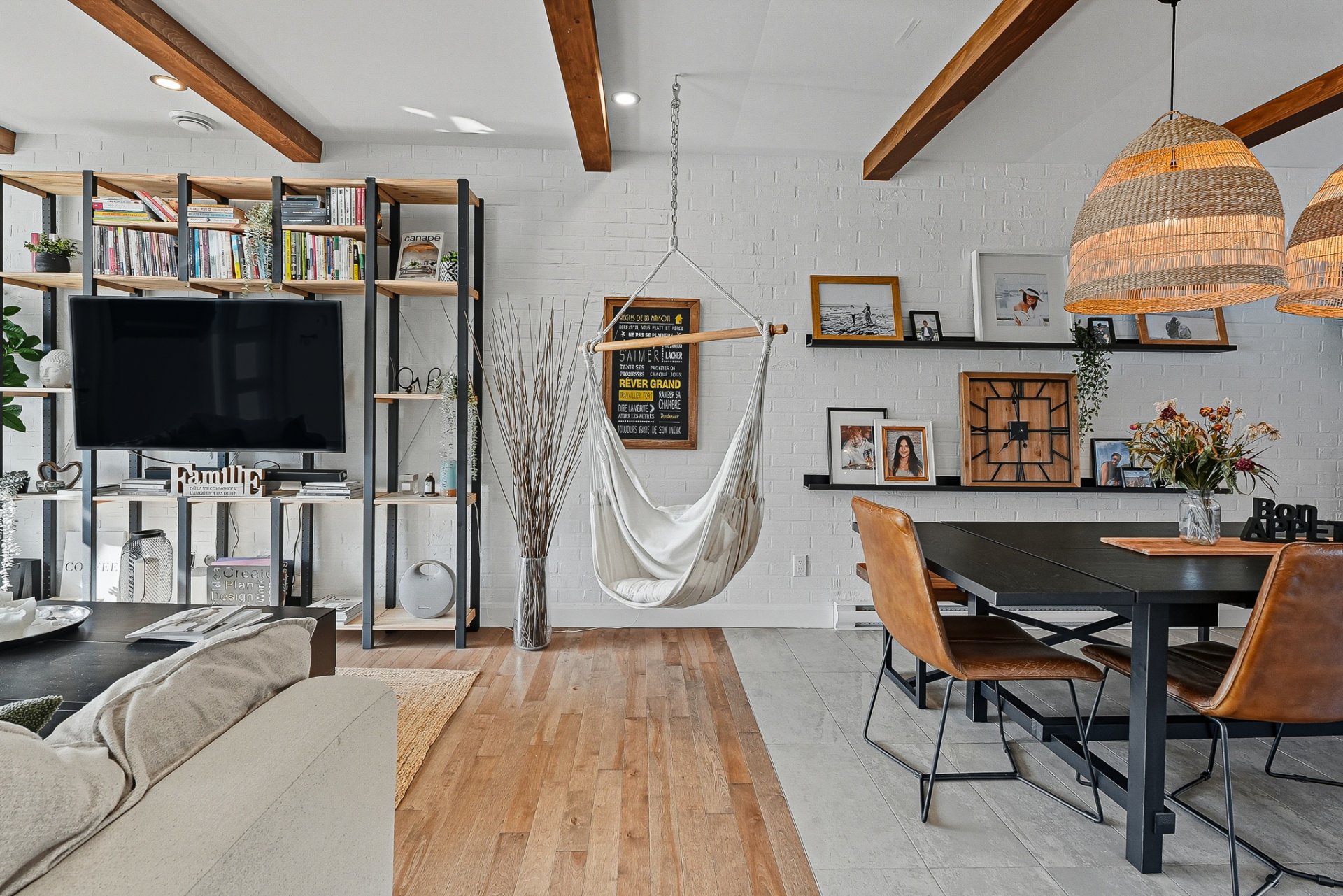 À l'extérieur, la cour arrière, véritable coup de coeur, propose un aménagement complet et soigné. On y retrouve un coin salon avec feu, des chaises suspendues, une salle à manger extérieure avec cuisine d'été, de la végétation grimpante ainsi qu'une terrasse arrière aménagée avec spa gonflable et chaises longues pour la détente. Un trampoline vient compléter l'espace pour le plaisir des enfants.