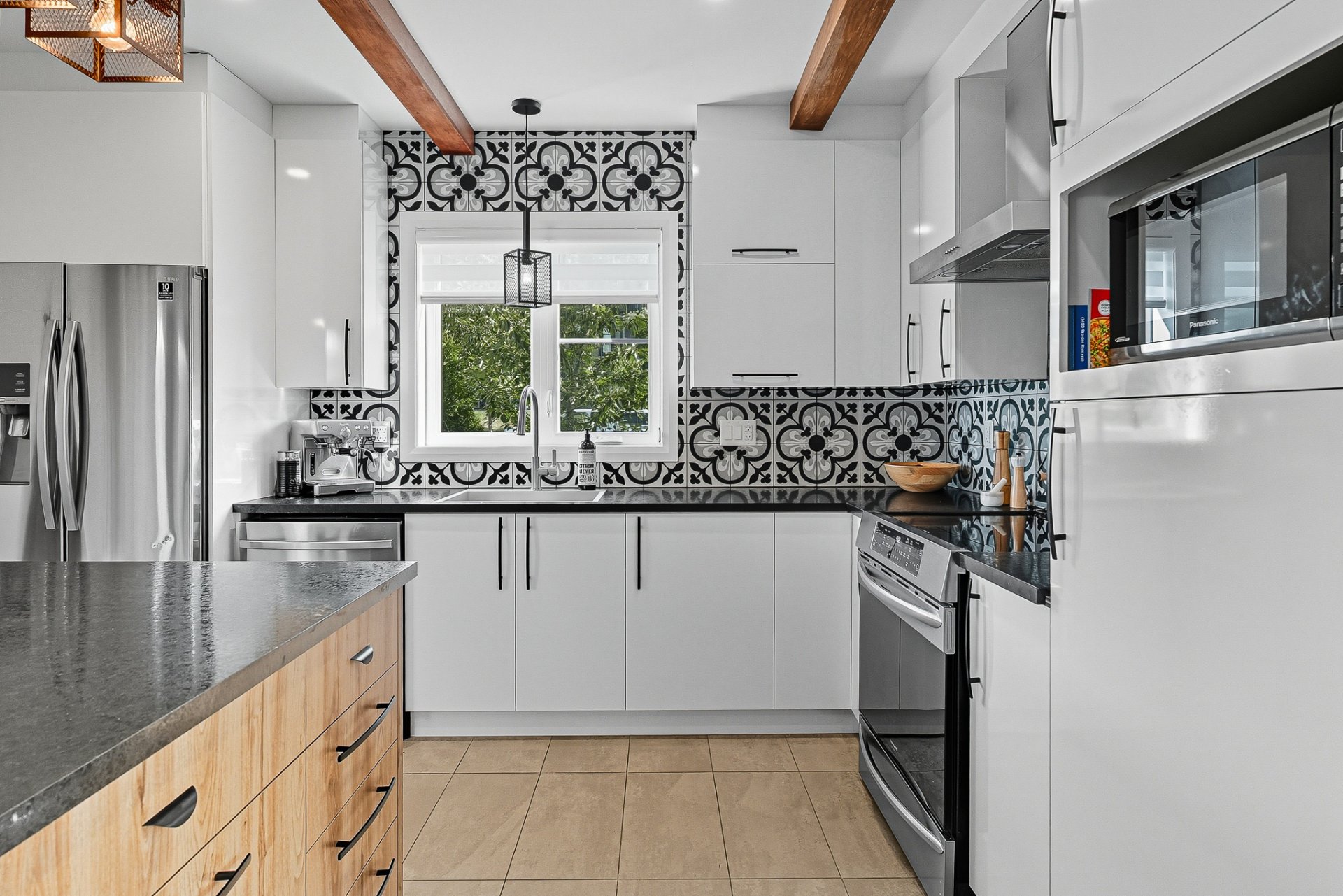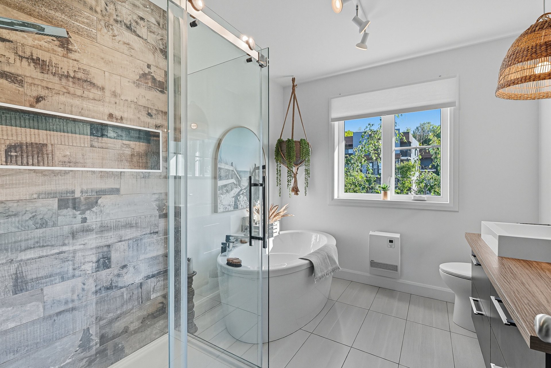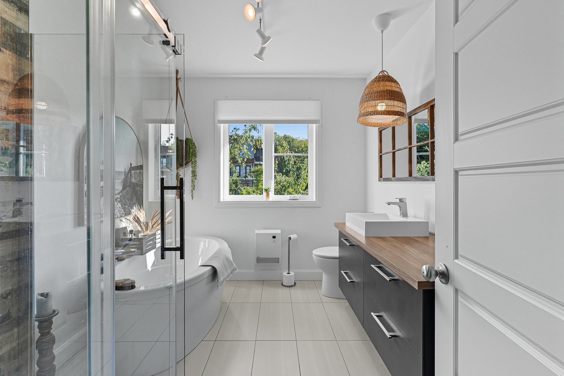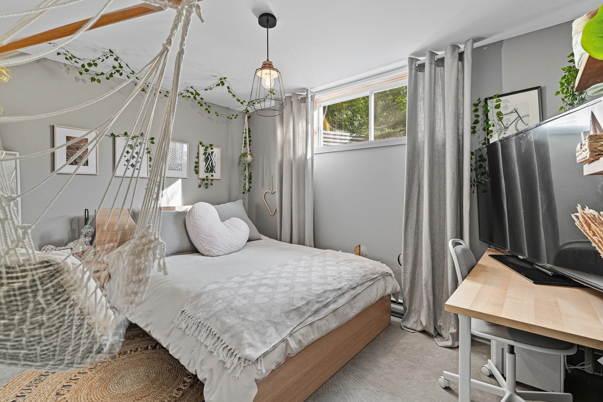 À l'extérieur, la cour arrière, véritable coup de coeur, propose un aménagement complet et soigné. On y retrouve un coin salon avec feu, des chaises suspendues, une salle à manger extérieure avec cuisine d'été, de la végétation grimpante ainsi qu'une terrasse arrière aménagée avec spa gonflable et chaises longues pour la détente. Un trampoline vient compléter l'espace pour le plaisir des enfants.