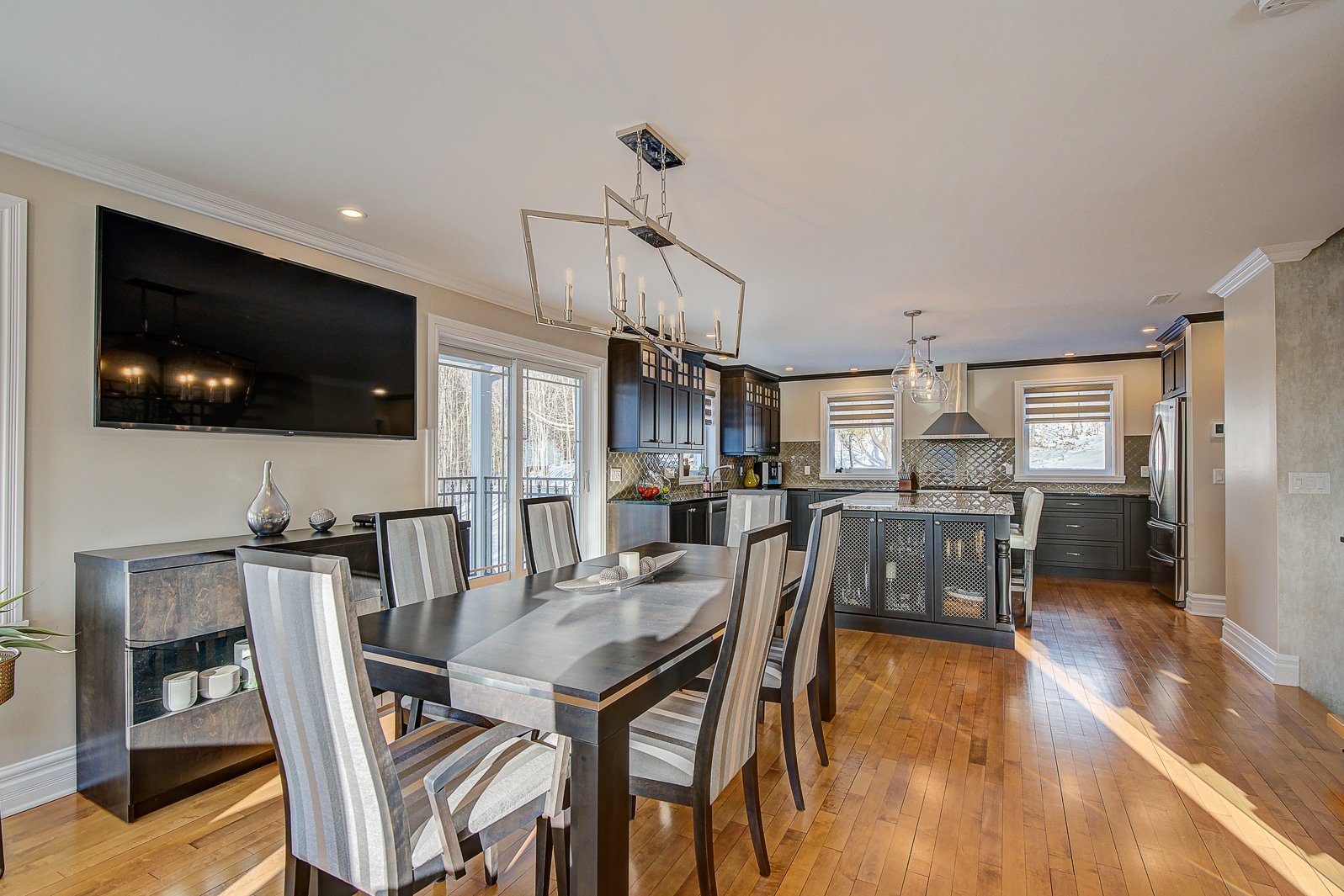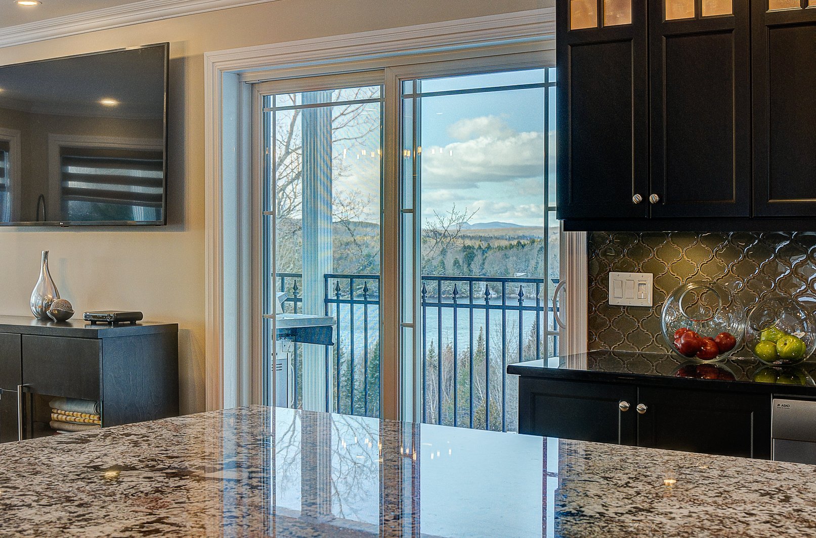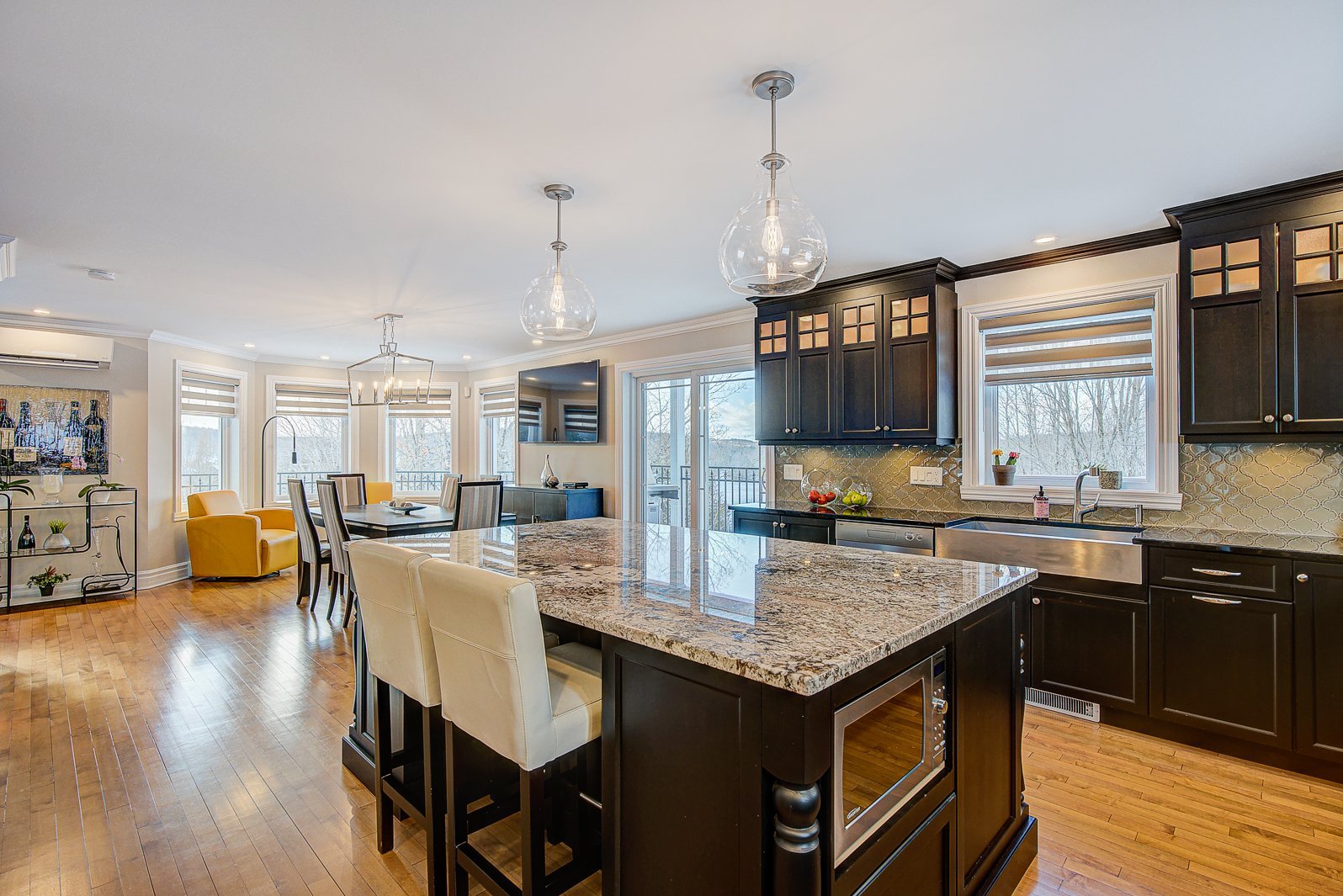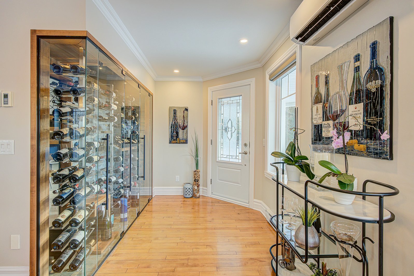 La cuisine haut de gamme séduira les plus exigeants. Elle est équipée de comptoirs en granite, d'un vaste îlot central et d'électroménagers de qualité supérieure. Un cellier vitré en verre tempéré complète l'ensemble, ajoutant une touche sophistiquée et pratique pour les amateurs de vin.