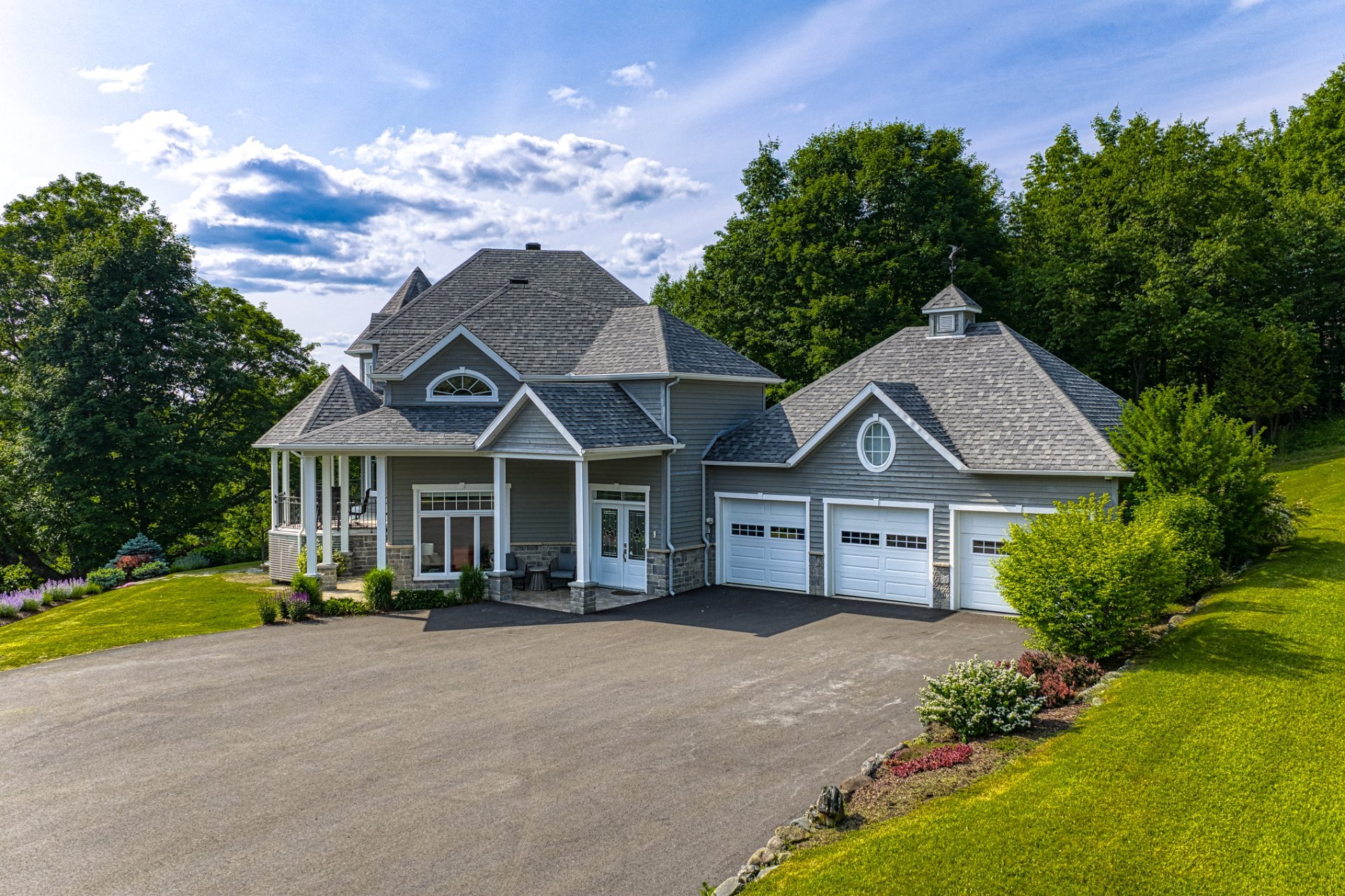 La propriété dispose d'un garage triple attaché à la maison, en plus d'un second garage triple détaché. Ce dernier constitue un atout rare, idéal pour les collectionneurs de véhicules, les amateurs de plein air ou les projets nécessitant des espaces polyvalents. Un espace de rangement additionnel à l'étage du garage détaché vient bonifier encore davantage la fonctionnalité du site.