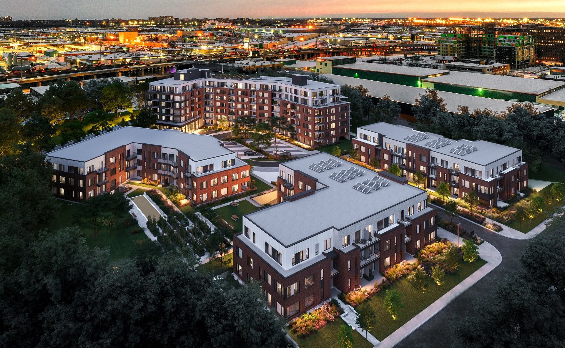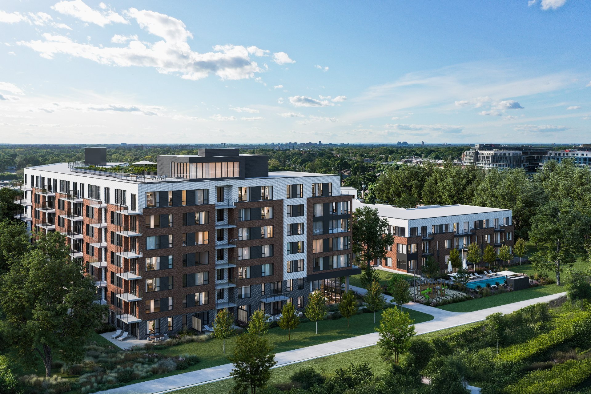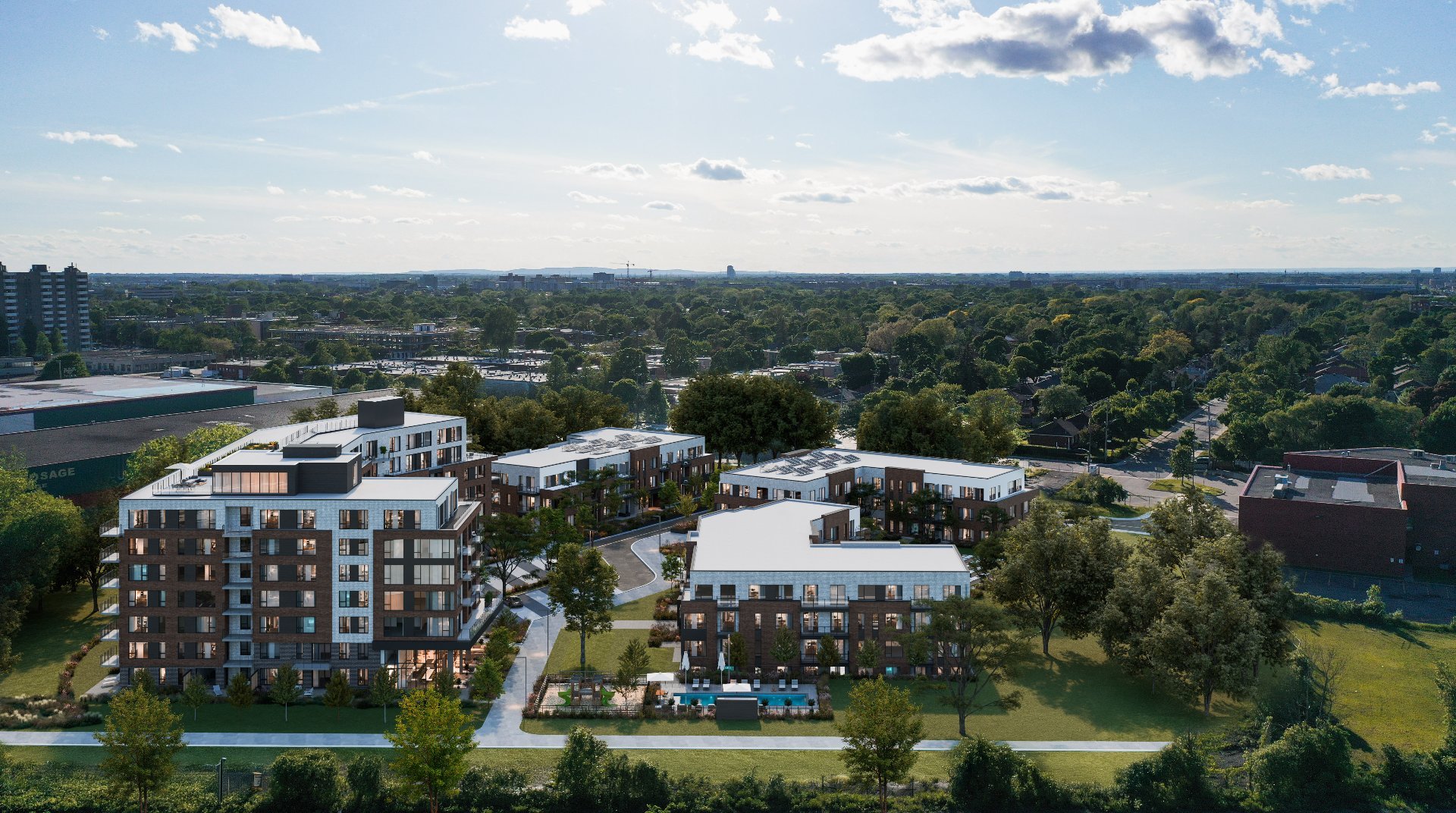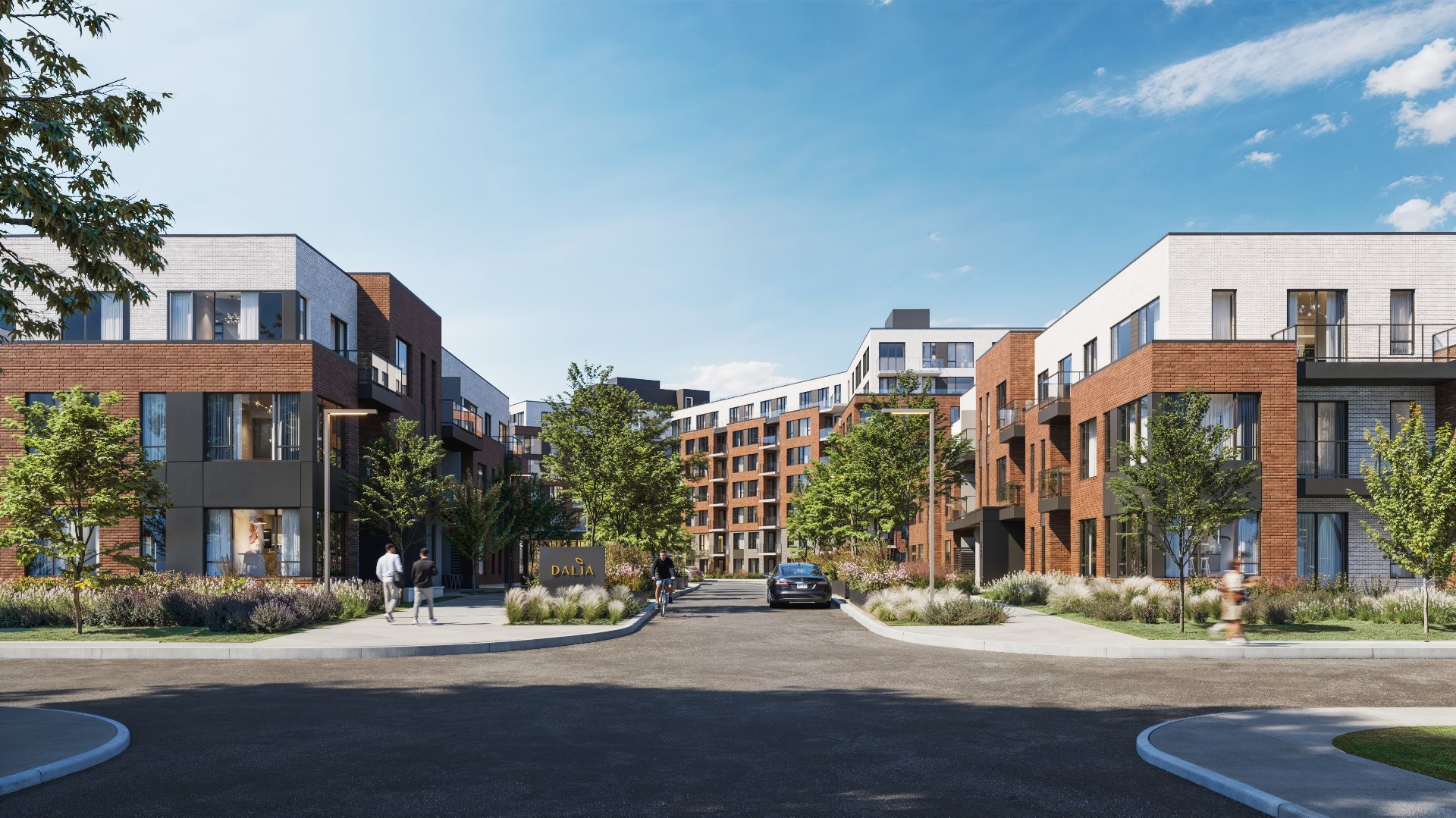 Le Quartier Dalia offre également des espaces communs conviviaux, tels qu'un lobby lumineux, un gym moderne, des espaces de télétravail, une salle de réception et une grande terrasse extérieure. La cour intérieure verdoyante, véritable coeur du projet, invite à la détente et aux rencontres sociales. Les installations extérieures comprennent piscine, aire de jeux pour enfants, parc à chiens, sentiers et jardins communautaires, favorisant un mode de vie actif et enrichissant.