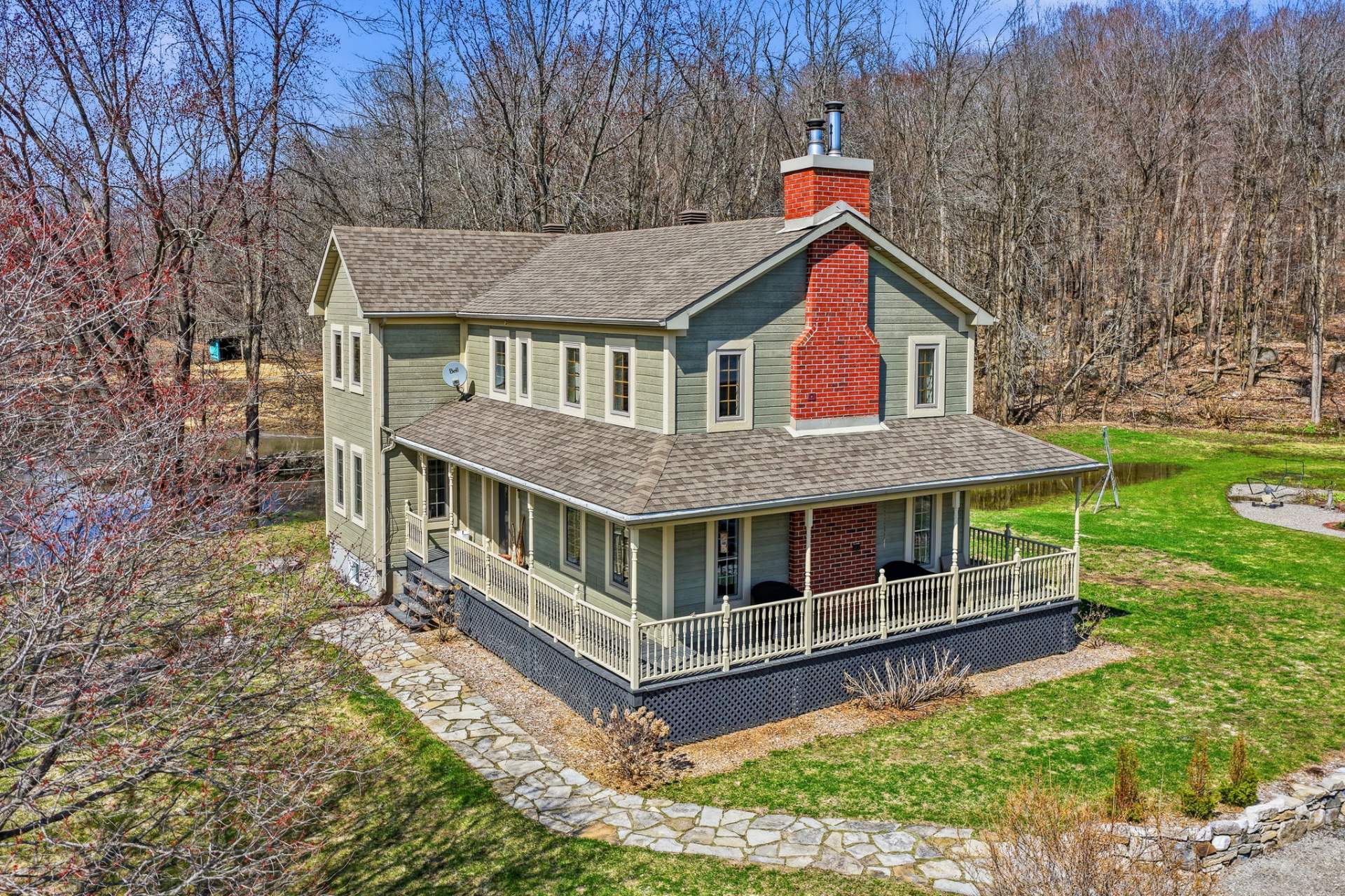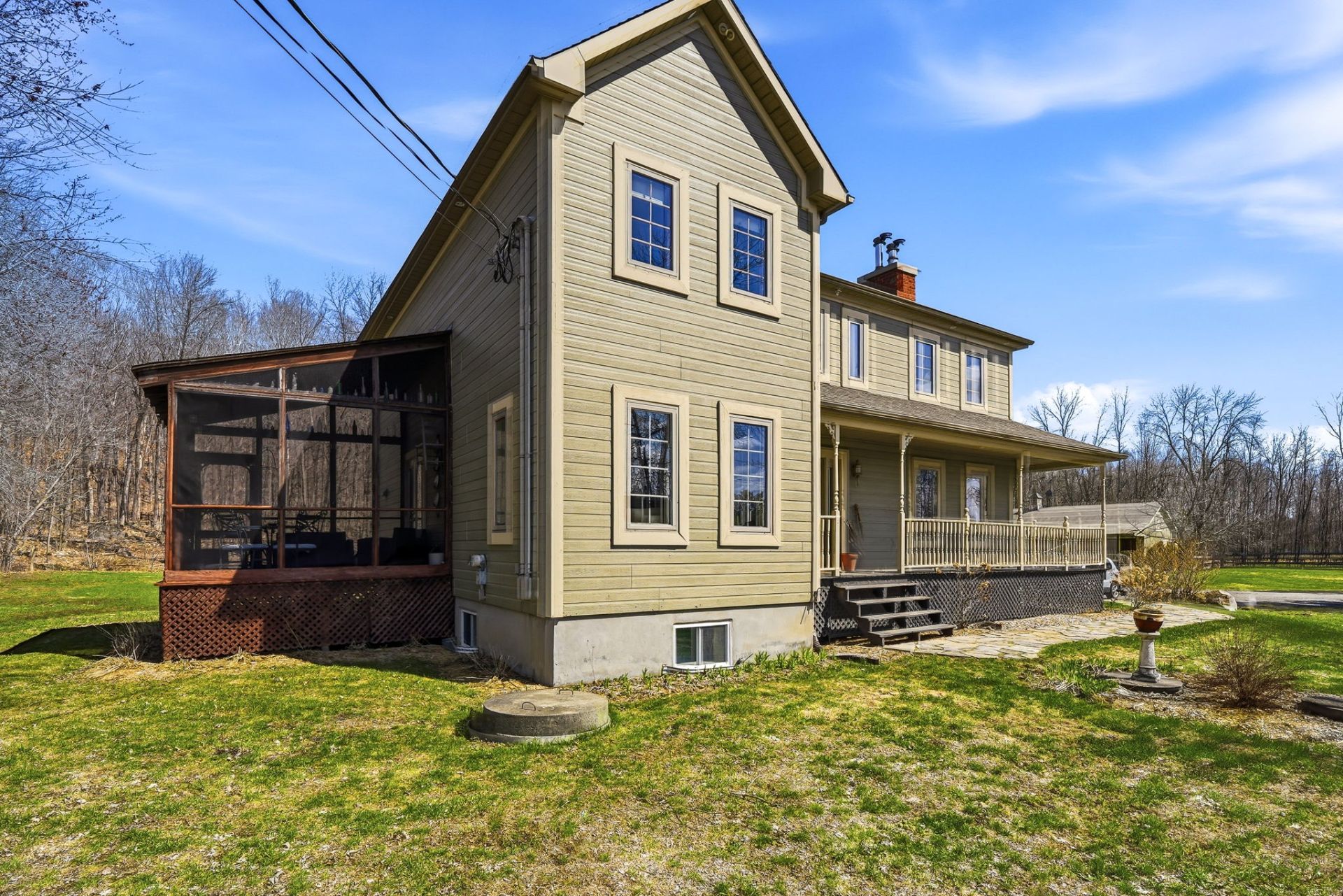 Une superbe véranda avec plafond cathédrale complète l'espace de vie, tandis qu'une galerie enveloppante sur trois côtés de la maison vous permet de profiter pleinement du panorama environnant.