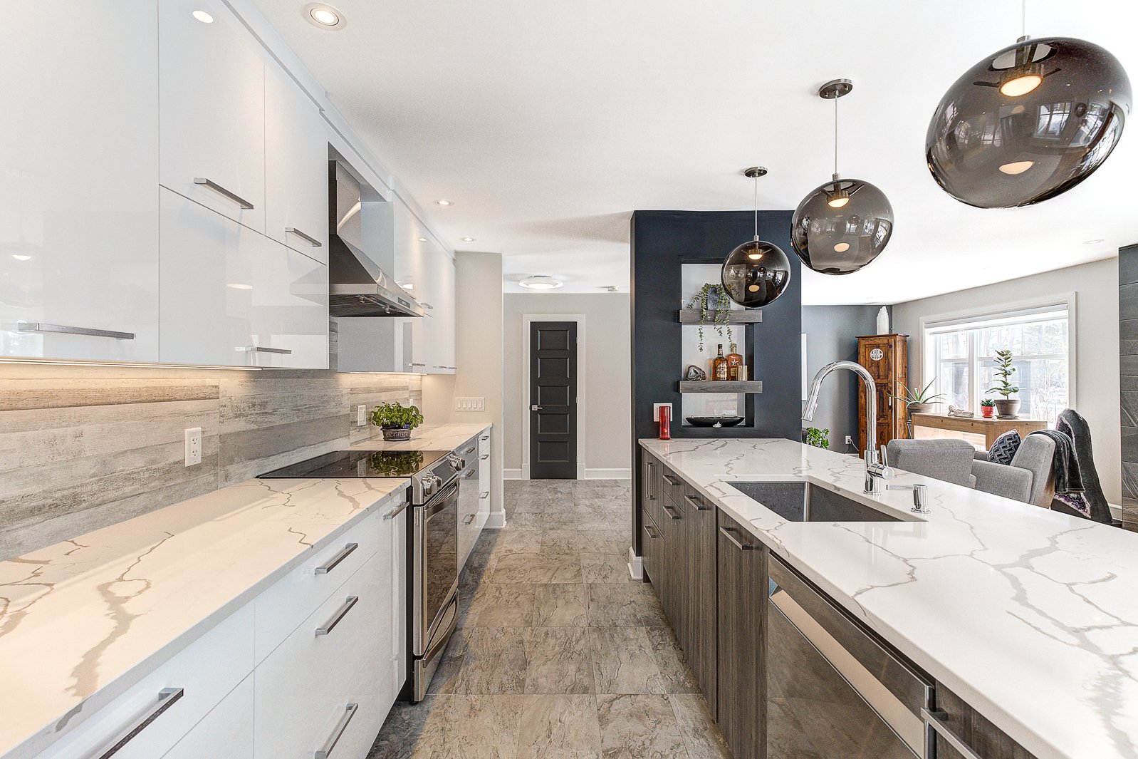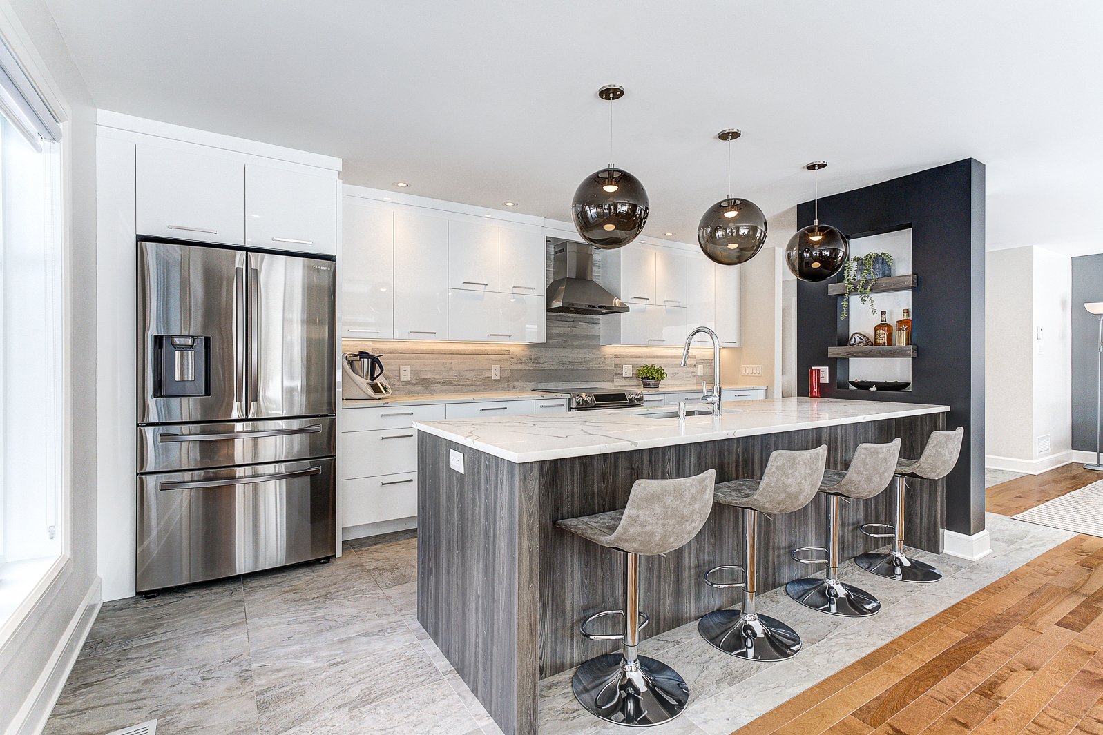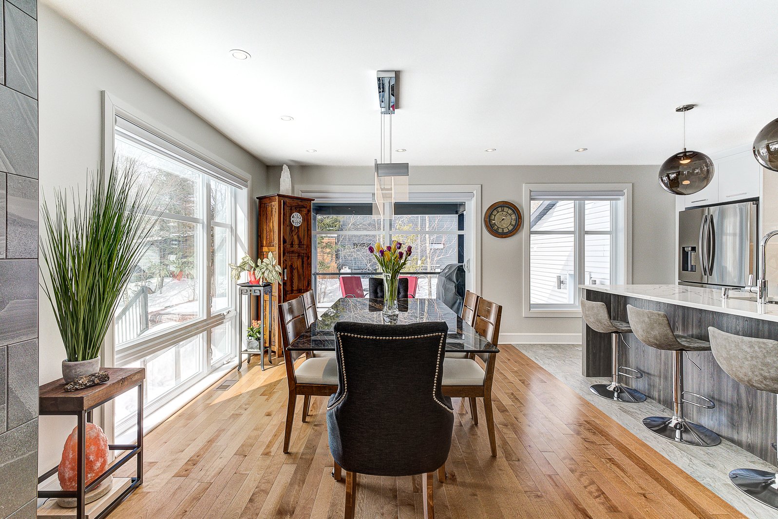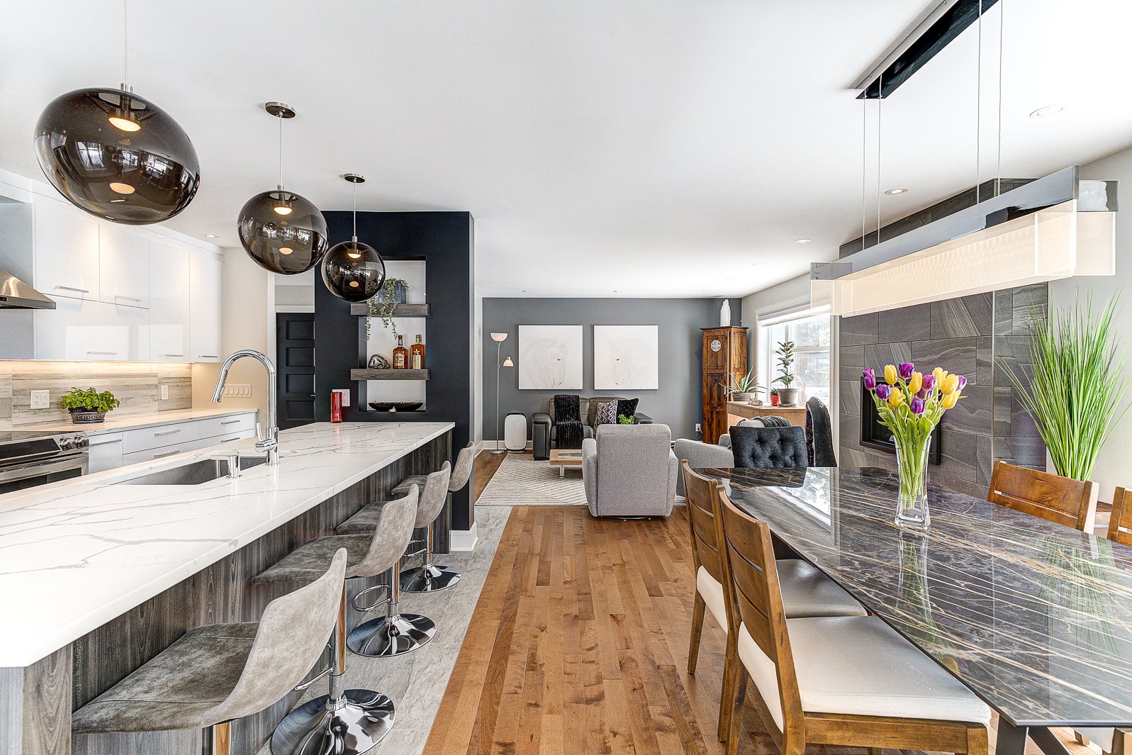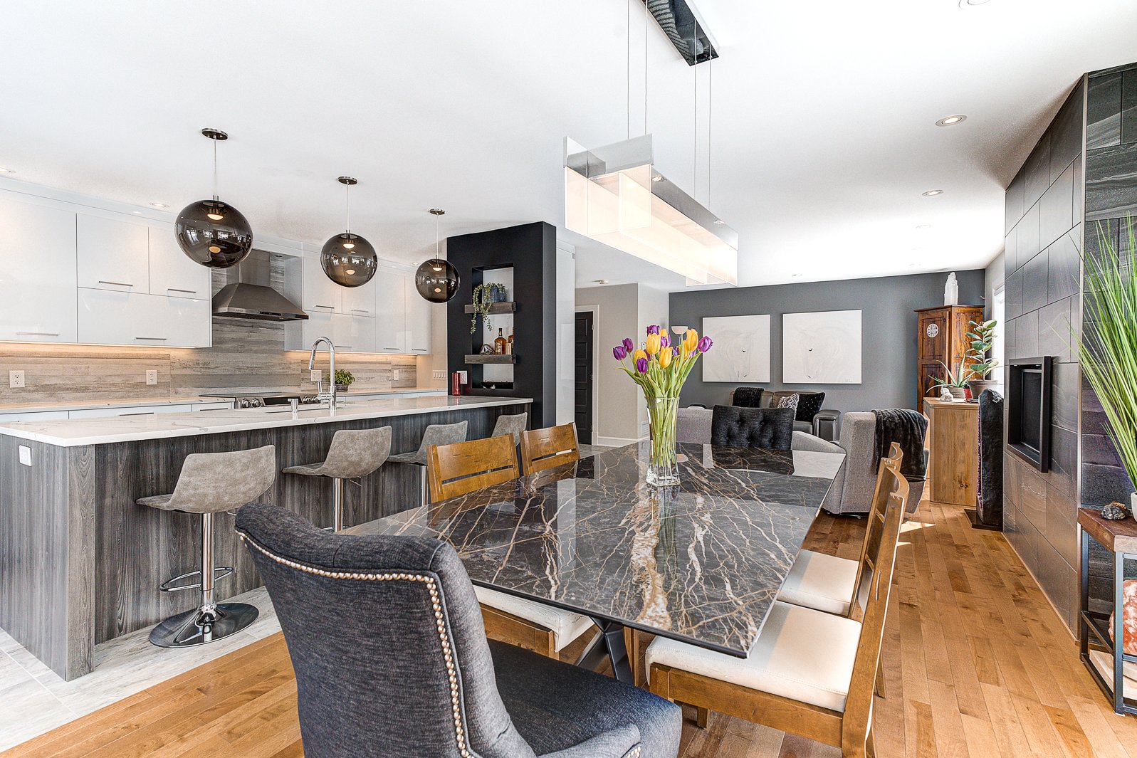 La cuisine spacieuse, équipée de comptoirs en quartz et d'armoires atteignant le plafond, est un véritable chef-d'oeuvre. Un grand îlot central et un garde-manger Walk-In bien aménagé ajoutent une touche de luxe et de praticité. La salle à manger et le salon à aire ouverte, avec foyer au gaz, l'endroit est parfaits pour recevoir famille et amis dans une ambiance conviviale.
