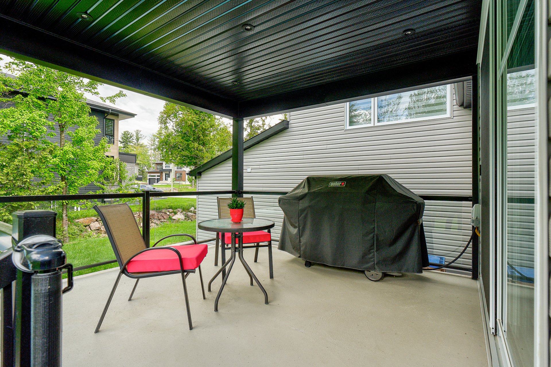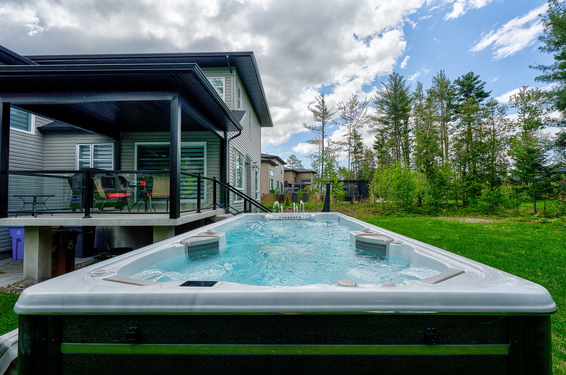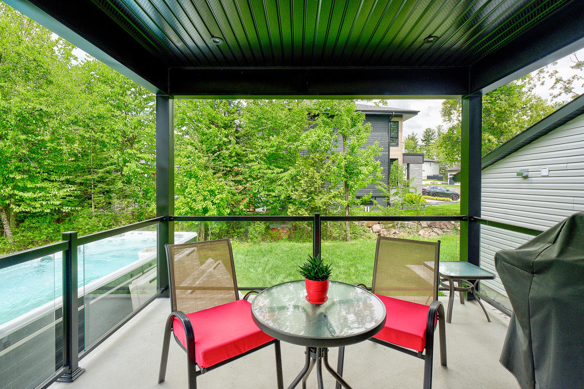 La cour arrière avec une galerie en béton couverte et rampes en verre, un spa de nage de 17 pieds. Dalles de béton de 11,5 x 19,5 pieds pour accueillir un spa, ainsi qu'un espace de 11 x 16 pieds prêt à recevoir un cabanon. Prise de gaz extérieur pour connecter un BBQ.