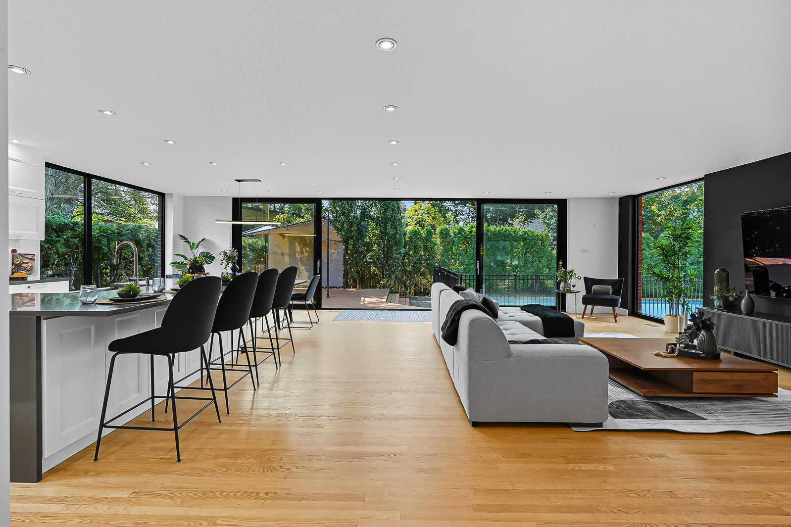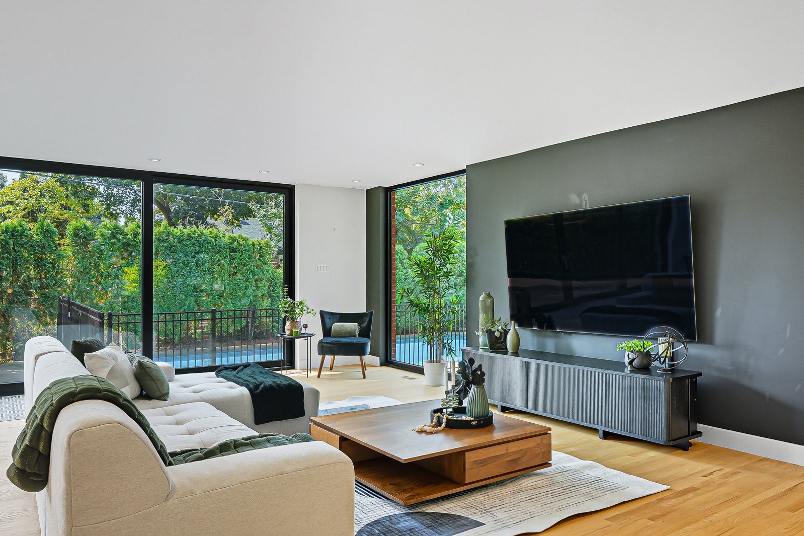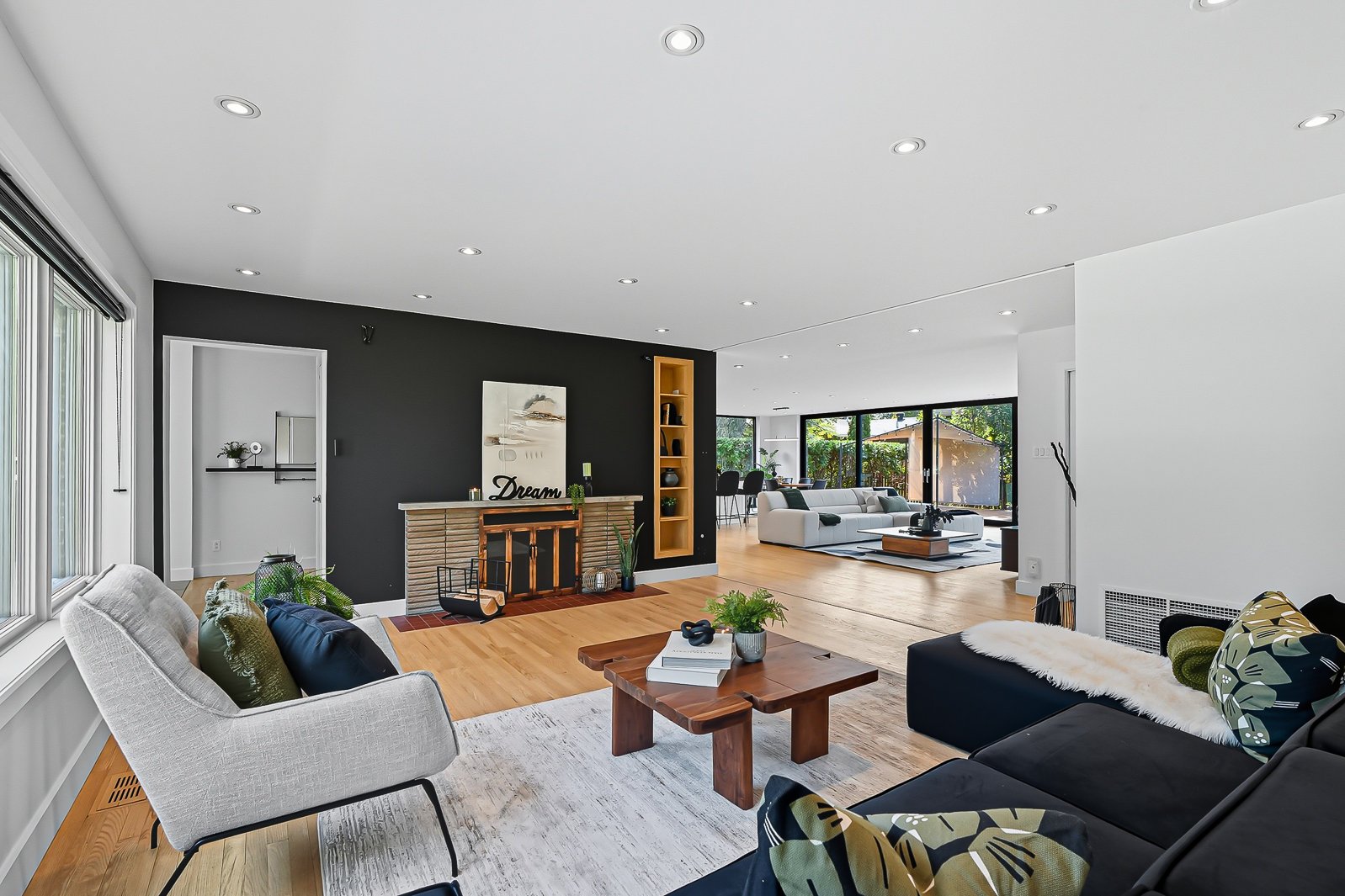 - Une époustouflante aire de vie de ± 1,100 pc avec 2 vastes salons, foyer au bois, fenestration généreuse, où la vie intérieure fusionne harmonieusement avec le magnifique environnement extérieur.