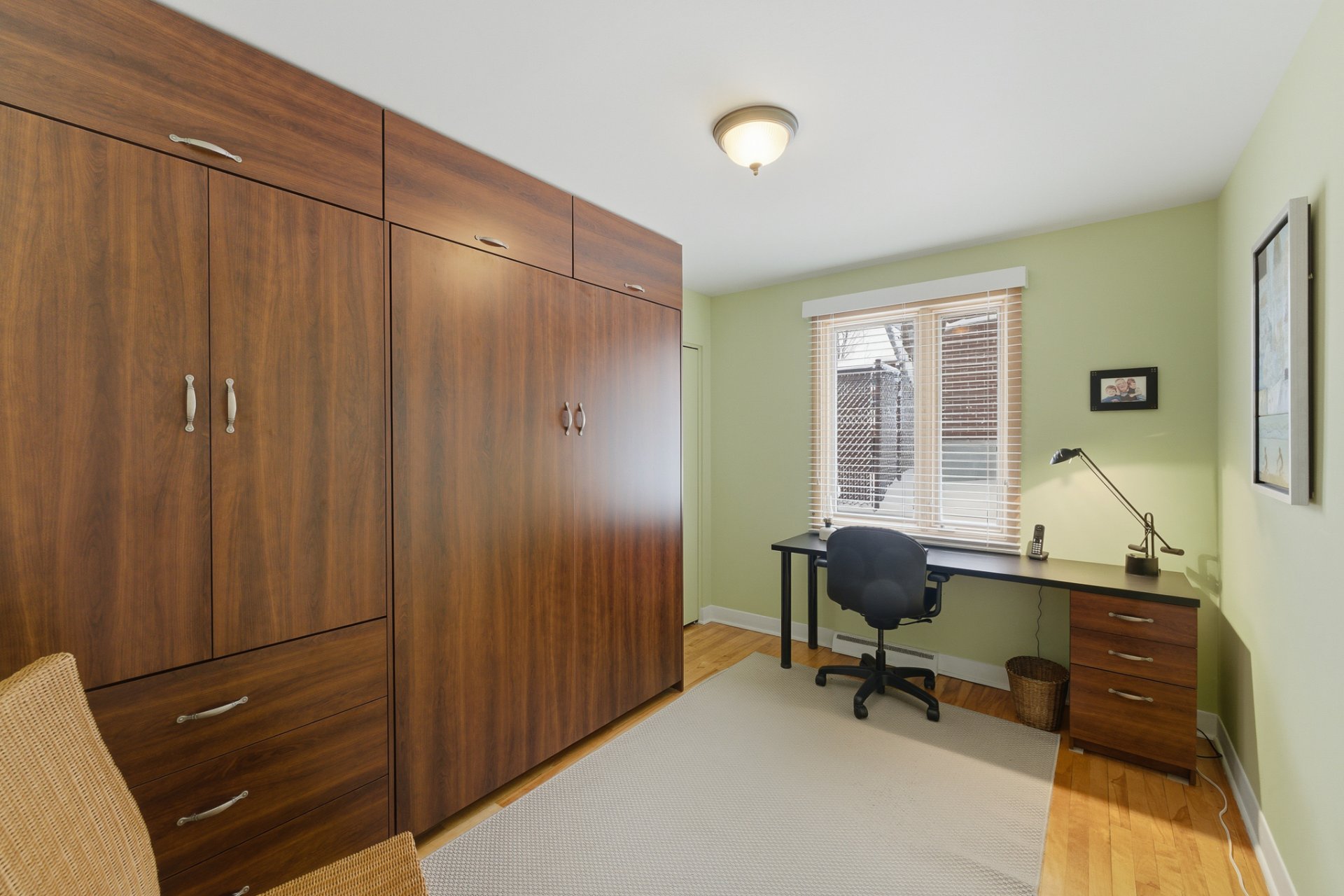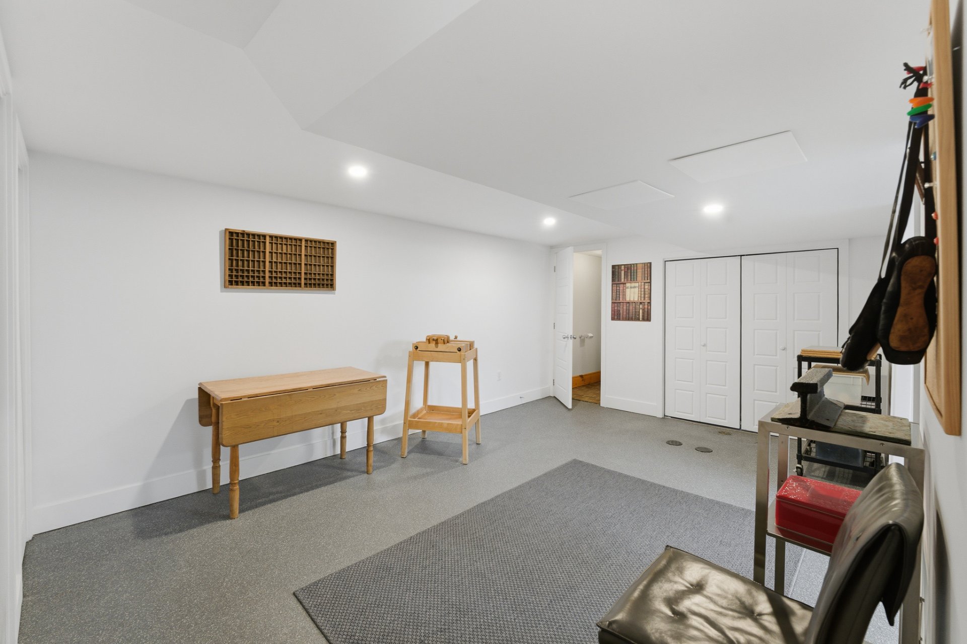 - 2 luminaires fixes (entrée et salle à manger), 1 étagère, tablette métallique et congélateur dans le garde-manger, armoire suspendue en pin dans la cuisine, miroir et support à serviette chauffant dans la salle de bain principale, miroirs muraux dans la chambre principale, lit escamotable dans la chambre du milieu, tablettes métalliques style 'industriel' et support de toiles dans le sous-sol.