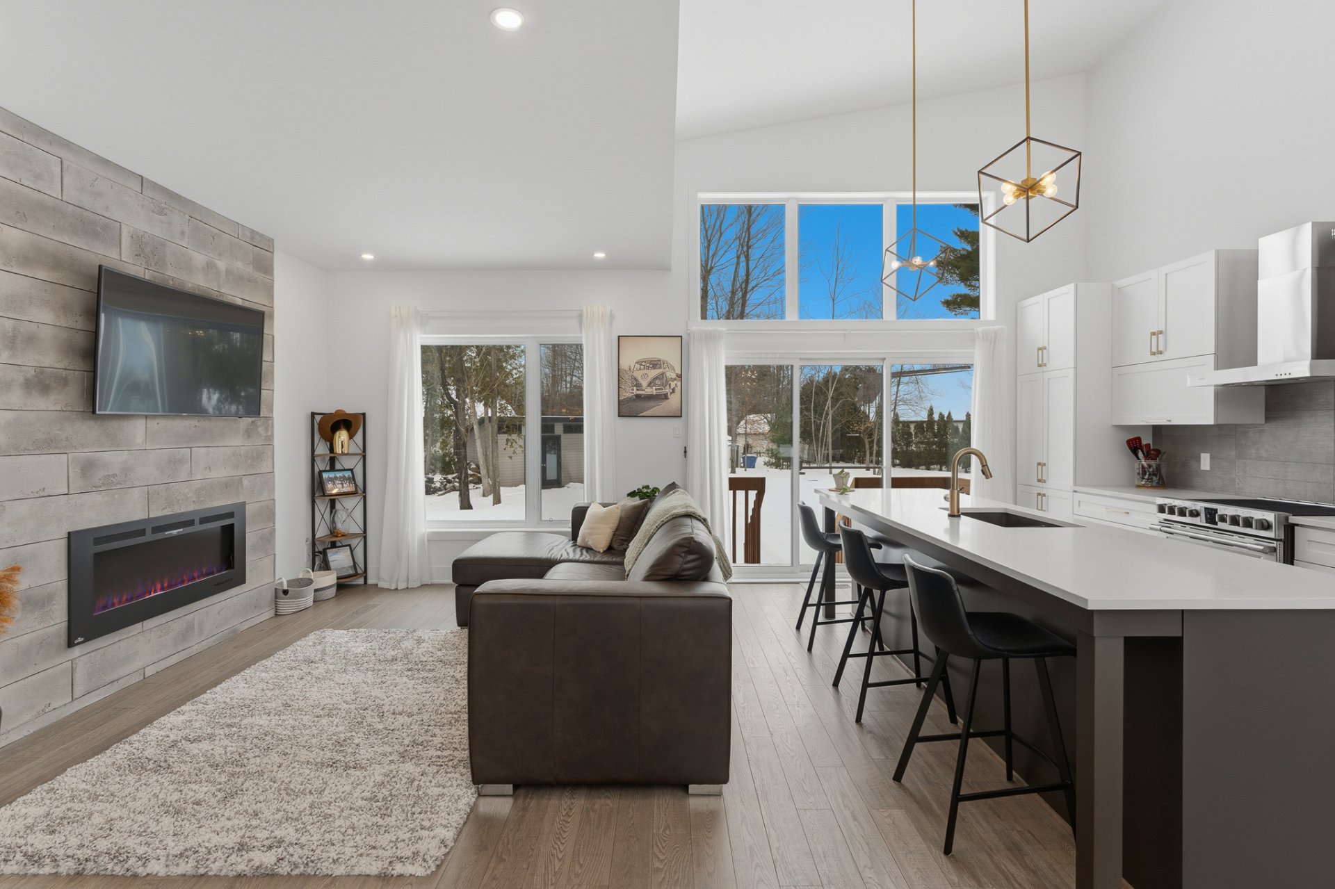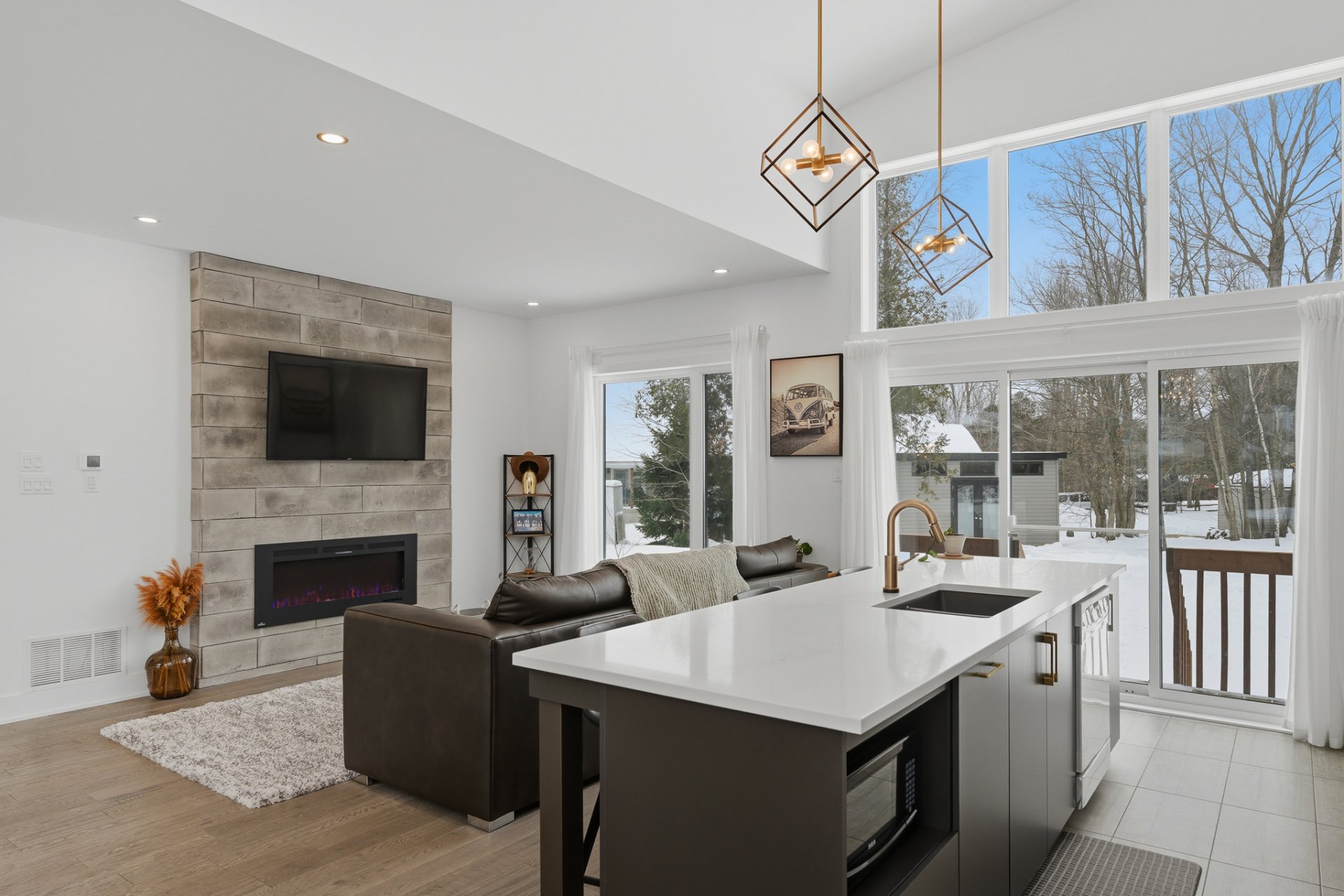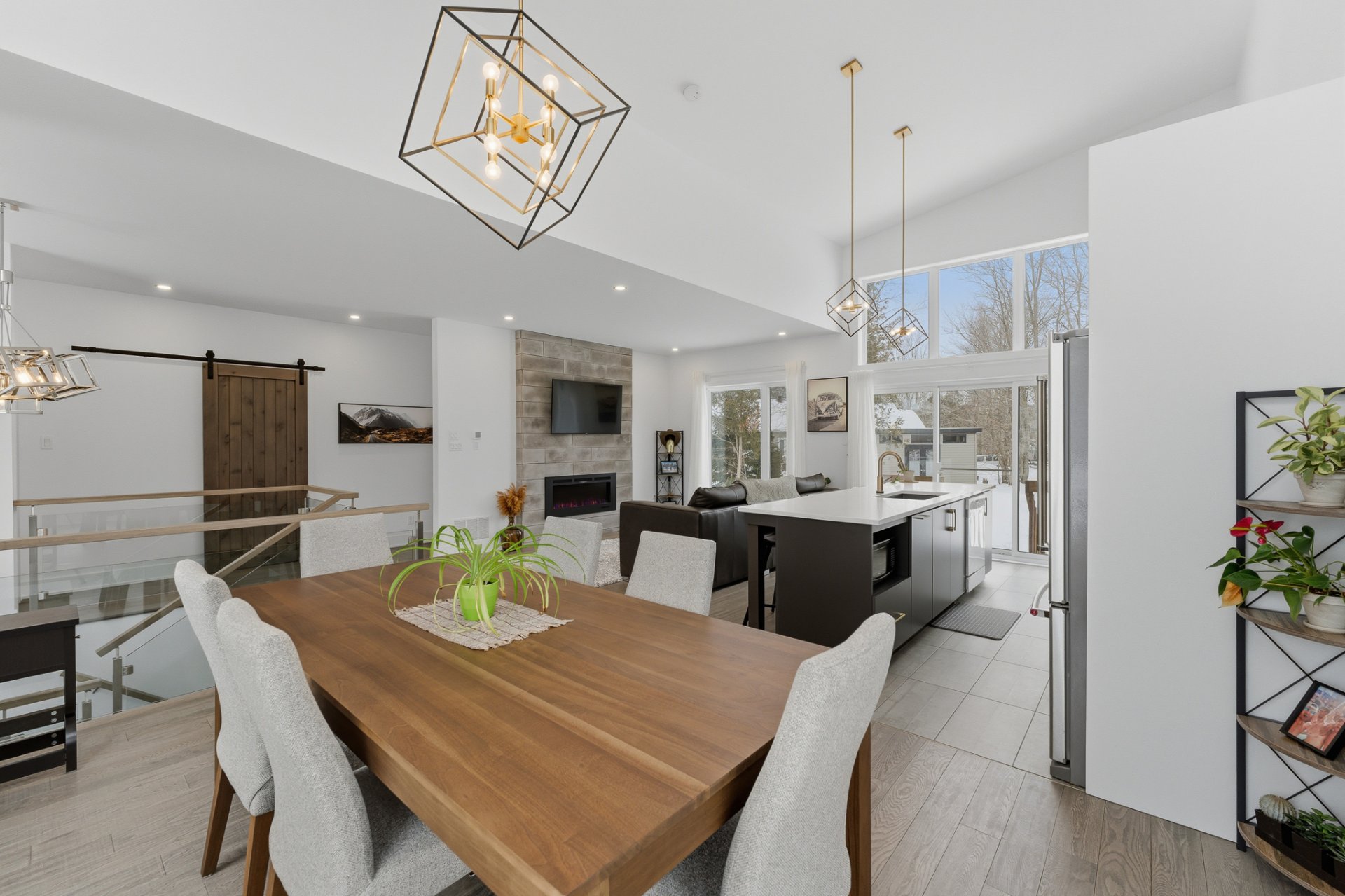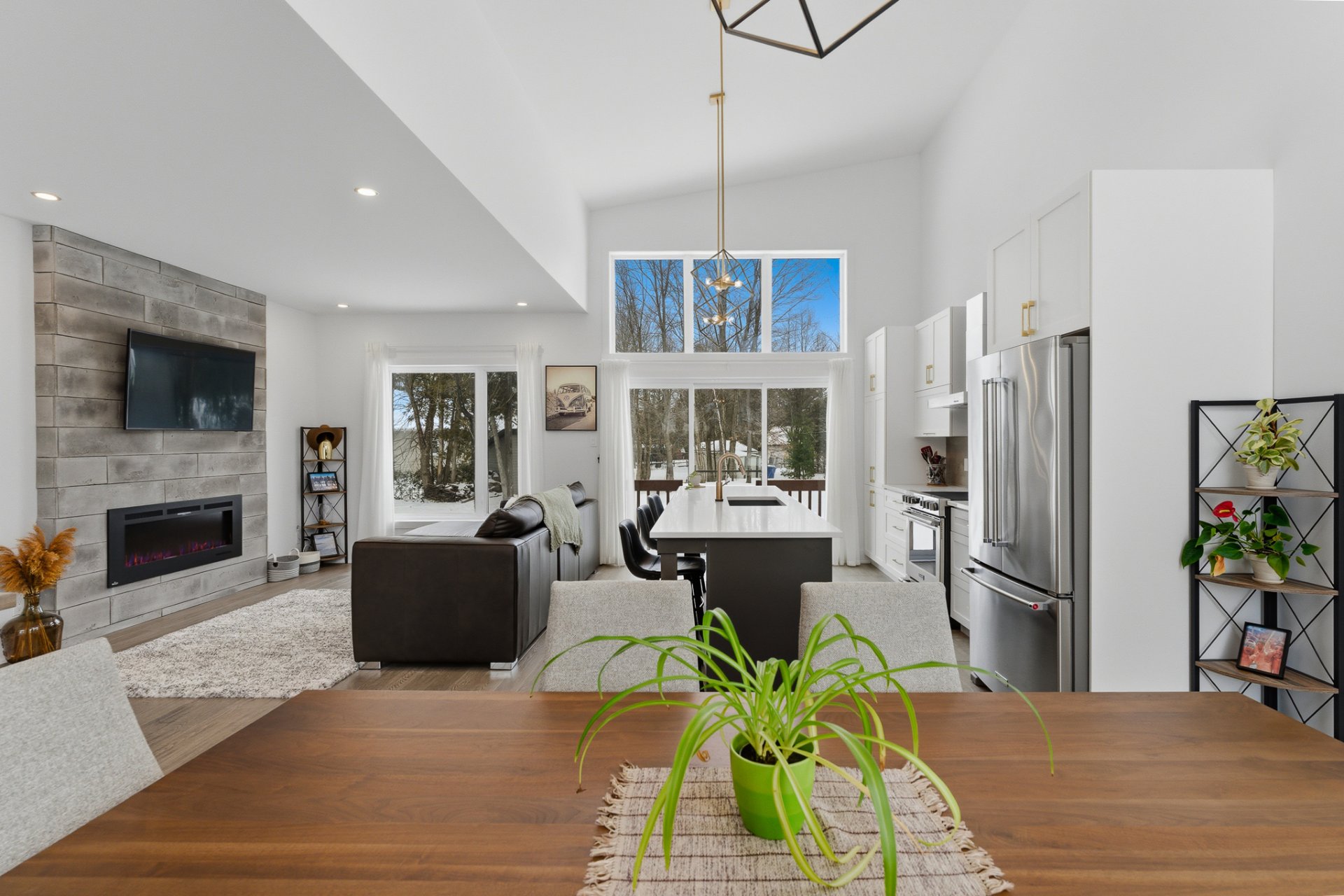 Le salon séduit par son ambiance chaleureuse, rehaussée par un foyer électrique Napoléon et une montée de cheminée au style brique bétonnée, offrant un accent décoratif distinctif. L'aire de vie, entièrement ouverte, s'harmonise parfaitement avec la cuisine et la salle à manger, toutes deux mises en valeur par le plafond cathédrale, qui confère un look chic et raffiné à ces espaces. La cuisine, avec ses poignées dorées et sa robinetterie soignée, est dotée d'un magnifique comptoir de quartz au fini marbré.