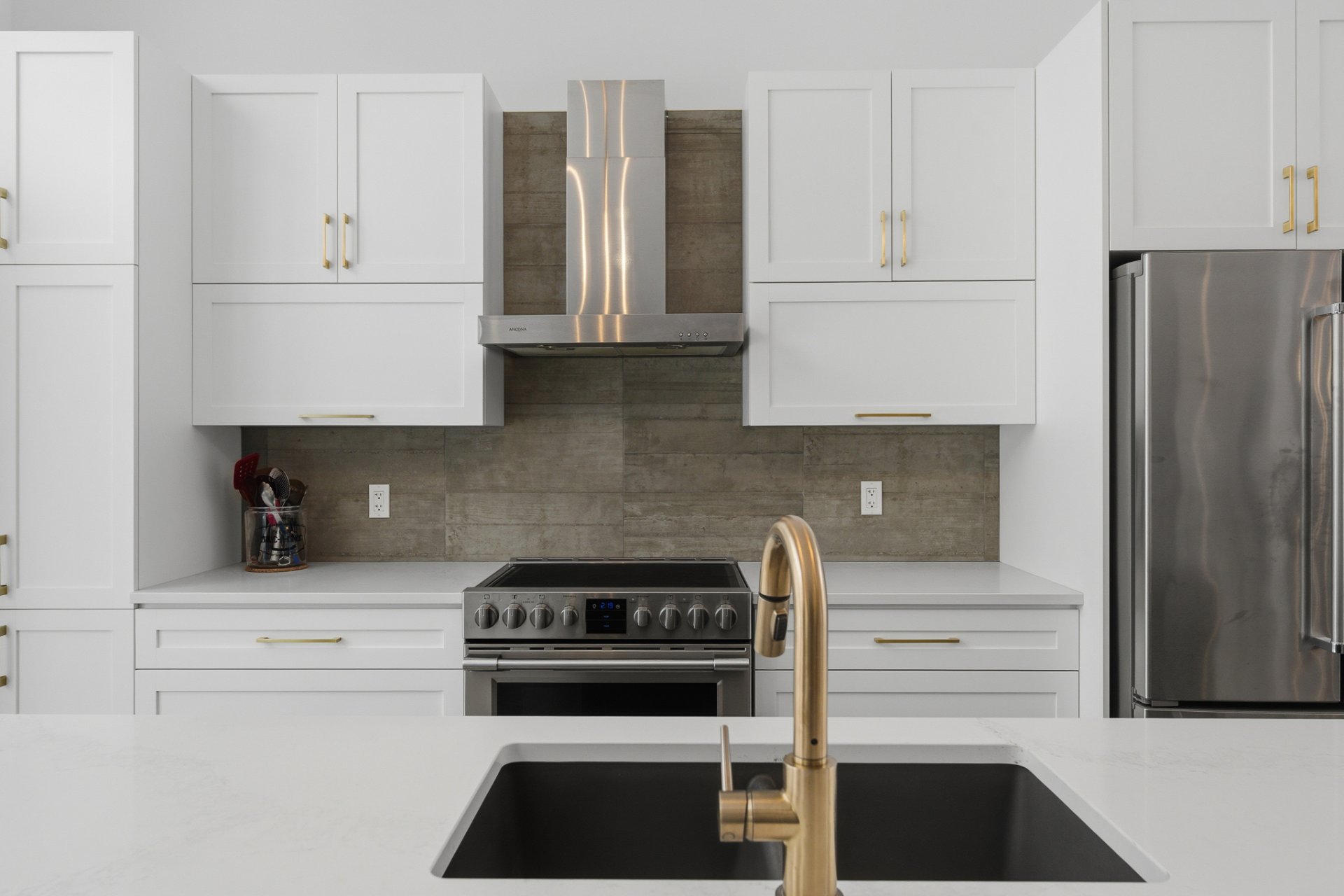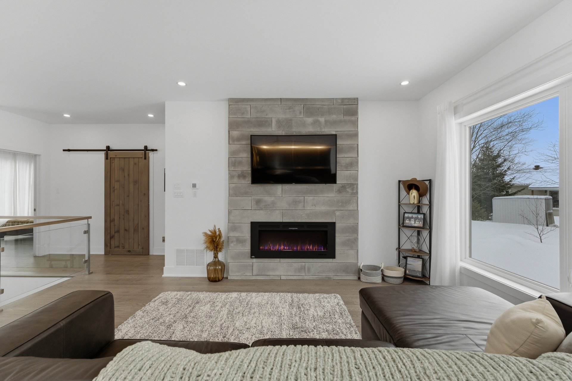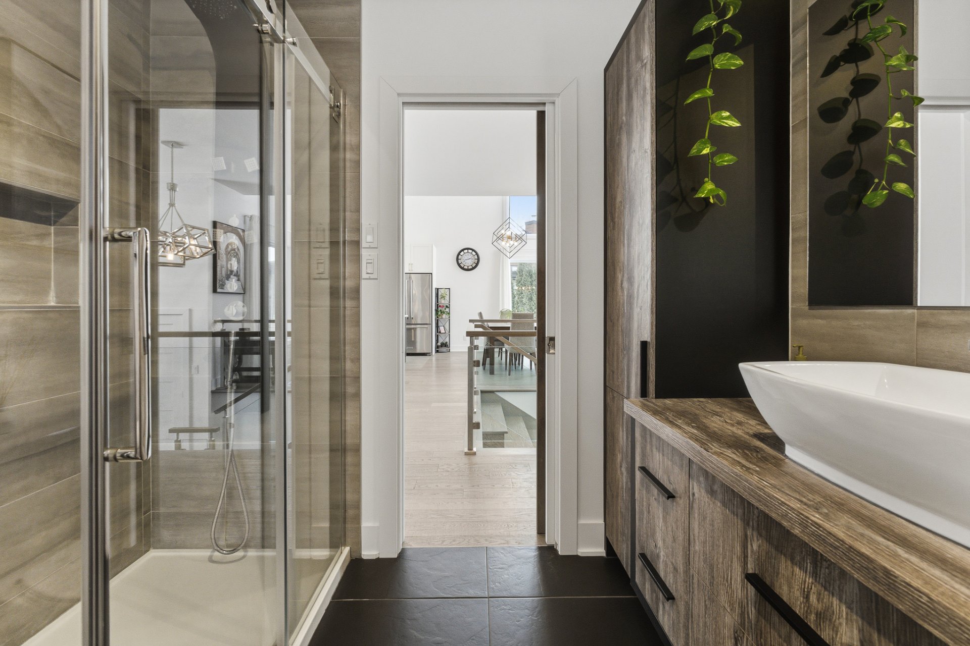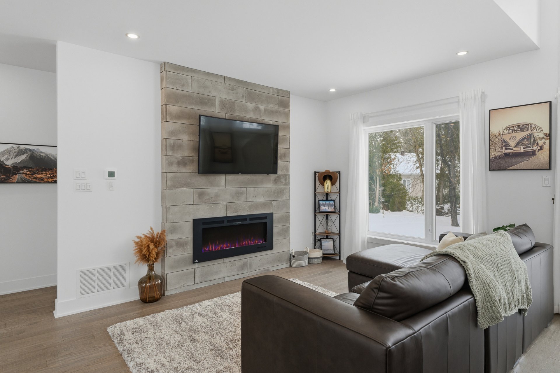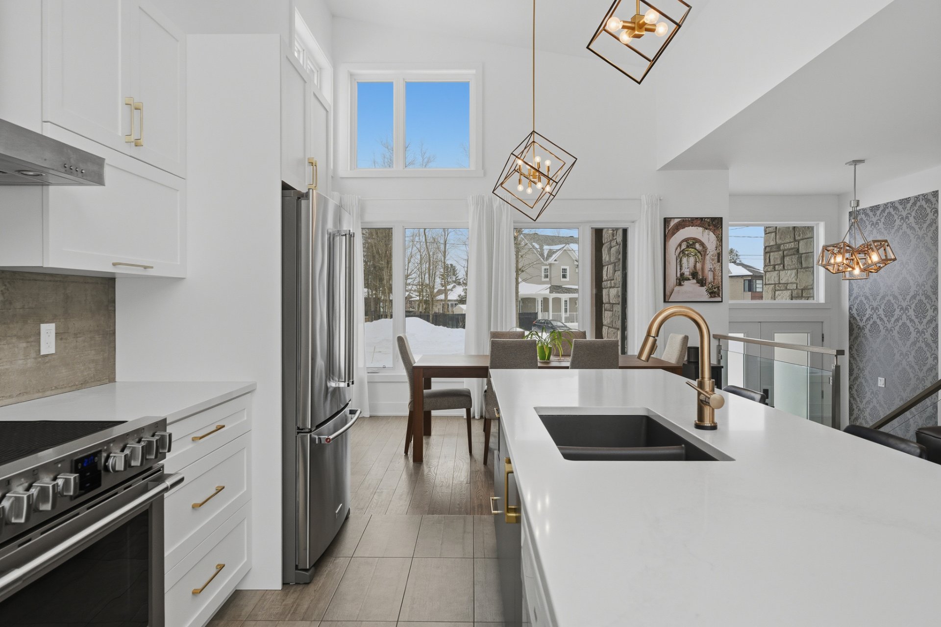 Le salon séduit par son ambiance chaleureuse, rehaussée par un foyer électrique Napoléon et une montée de cheminée au style brique bétonnée, offrant un accent décoratif distinctif. L'aire de vie, entièrement ouverte, s'harmonise parfaitement avec la cuisine et la salle à manger, toutes deux mises en valeur par le plafond cathédrale, qui confère un look chic et raffiné à ces espaces. La cuisine, avec ses poignées dorées et sa robinetterie soignée, est dotée d'un magnifique comptoir de quartz au fini marbré.