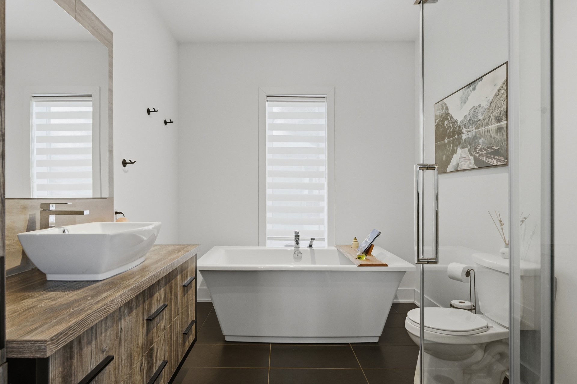 La salle de bains moderne propose un bain autoportant et une grande douche. Elle est délimitée par une porte de grange sur rail ajoutant une touche de design, tout en préservant votre intimité grâce à une porte coulissante encastrée dans le mur pouvant être verrouillée.