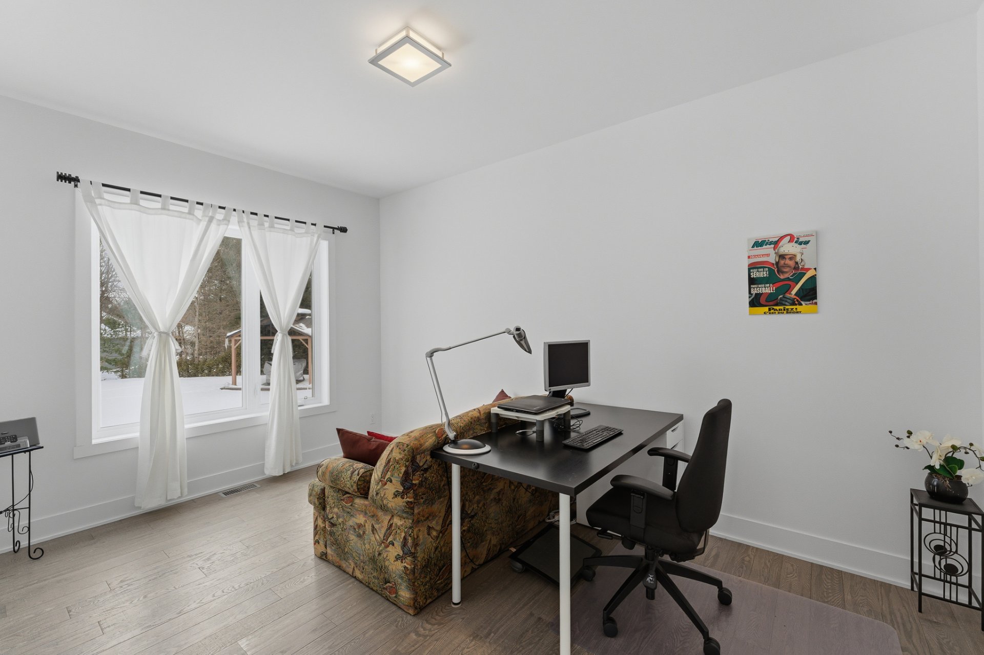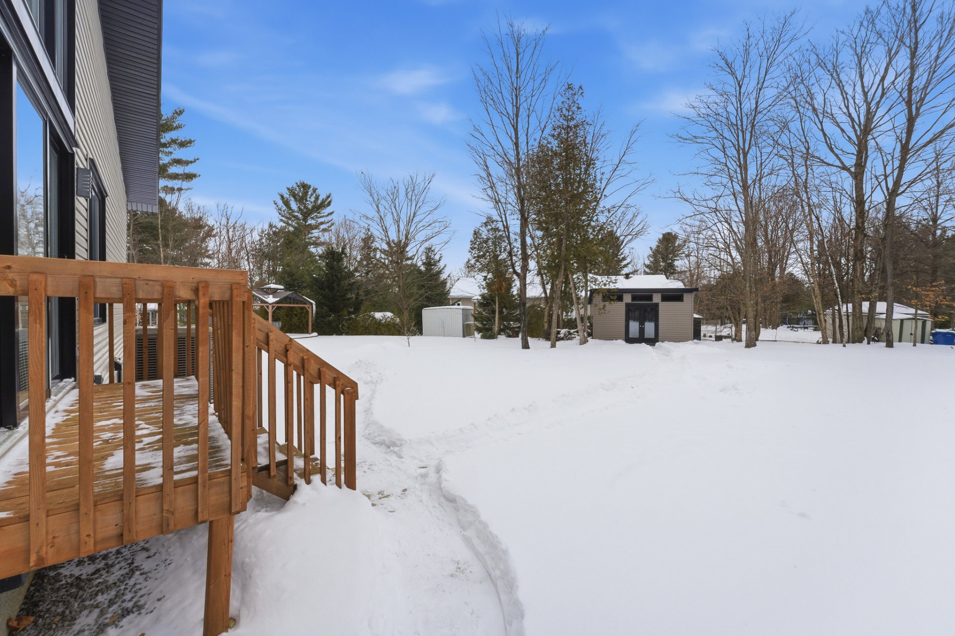 À l'extérieur, de jolies plates-bandes ont été aménagées et la vaste cour arrière, bordée de beaux arbres matures, offre un cadre des plus agréables. L'espace extérieur pourrait permettre la construction d'un garage. Il appartient toutefois à l'acheteur d'effectuer ses propres vérifications auprès de la municipalité quant à la faisabilité du projet et aux règlements en vigueur.