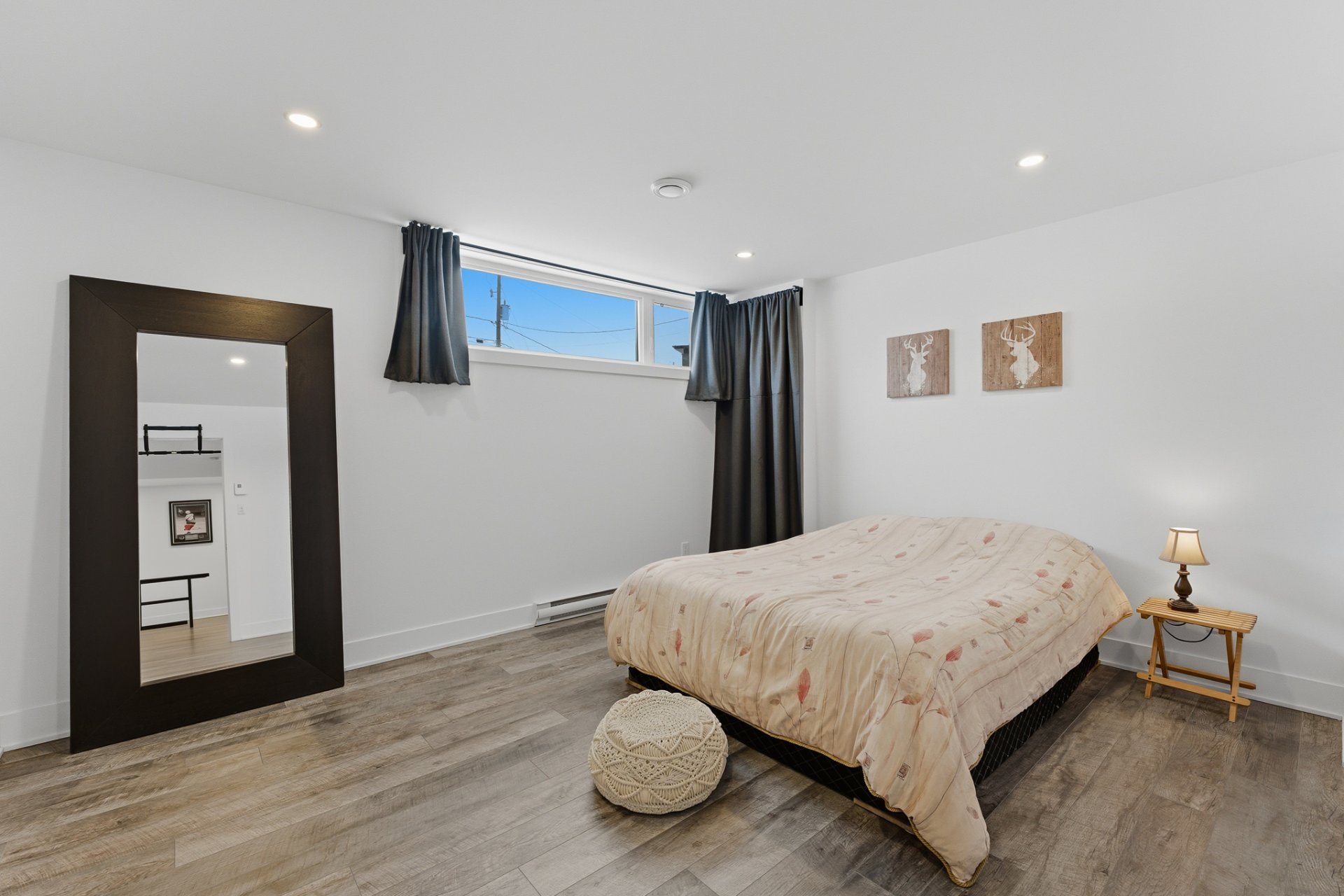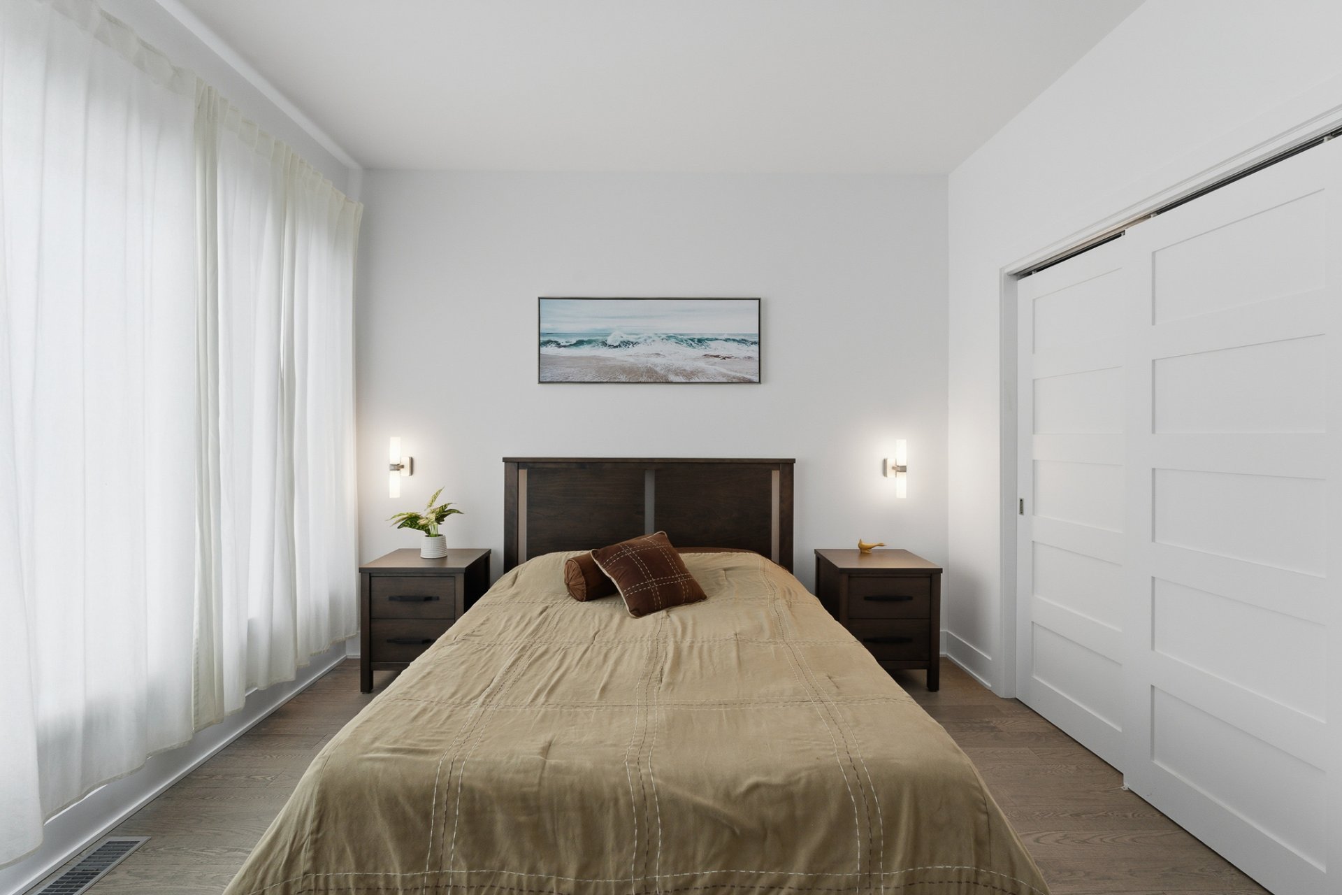 La chambre principale, située à l'avant, bénéficie également d'une belle fenestration et d'un espace de rangement appréciable. Deux appliques murales, disposées de part et d'autre du lit, créent une ambiance douce et feutrée.
