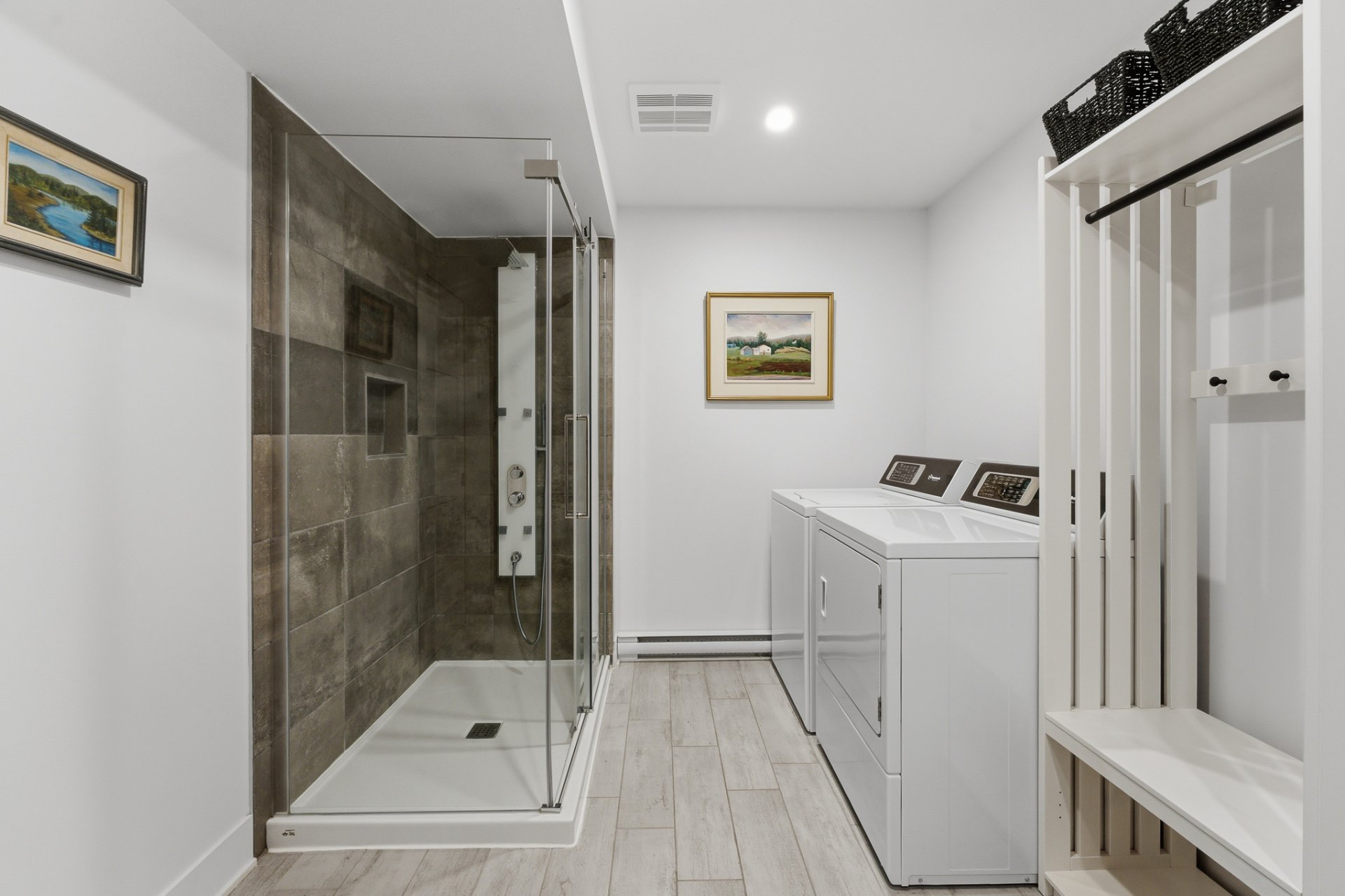 On y retrouve également la 3ième chambre, la 2ième salle de bains ainsi qu'un bel espace de rangement mesurant 14,8 x 10,7, muni de tablettes fixées au mur - une véritable valeur ajoutée au quotidien.
