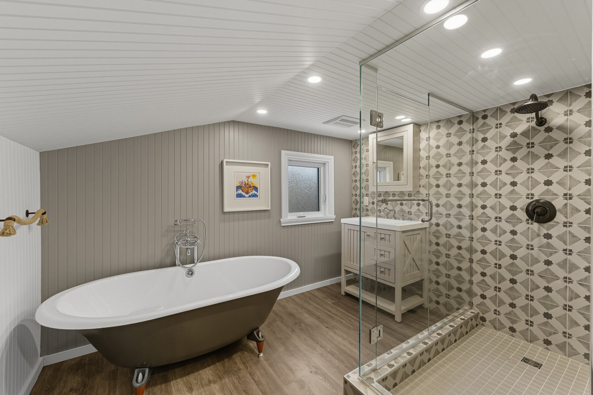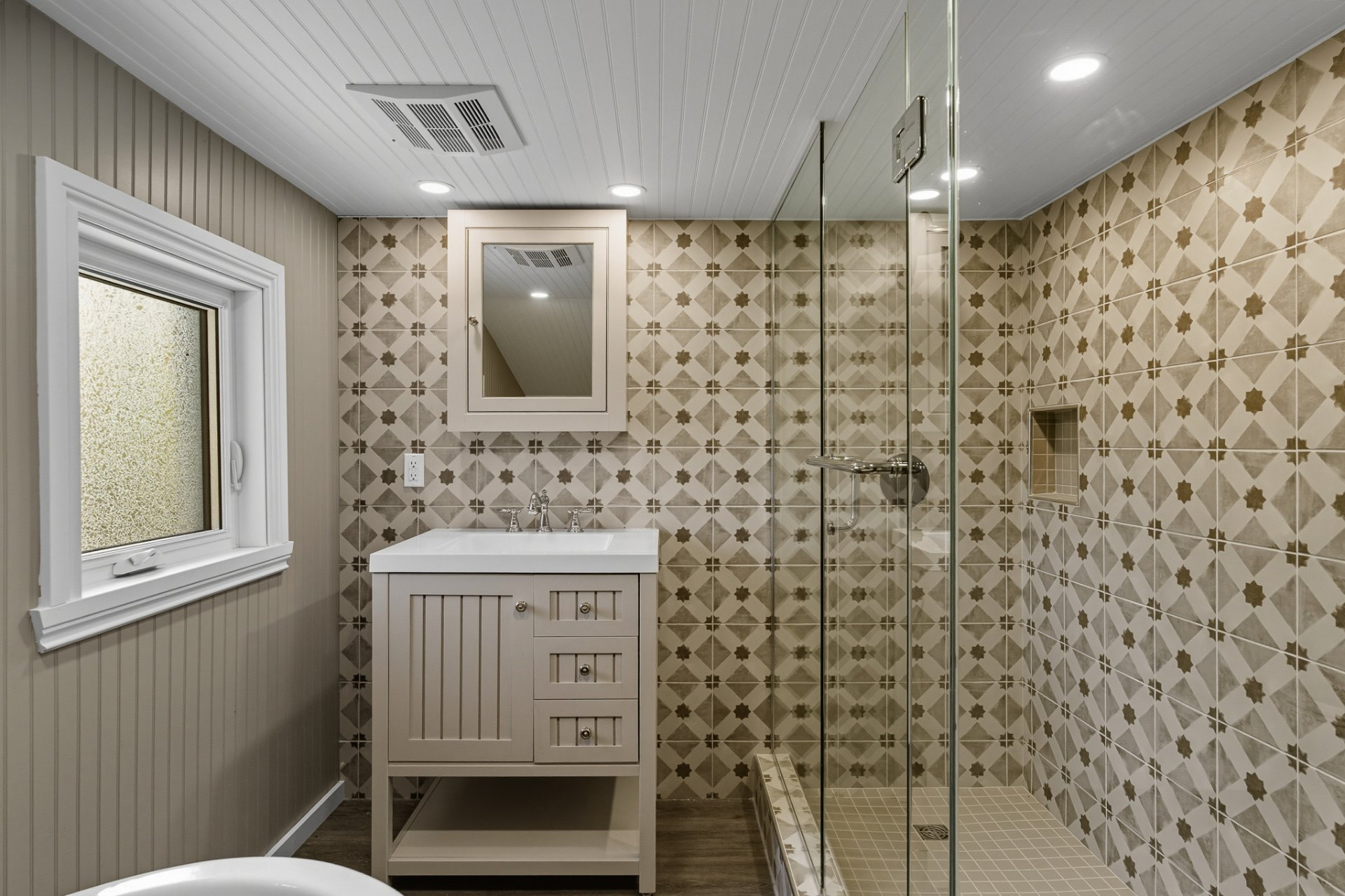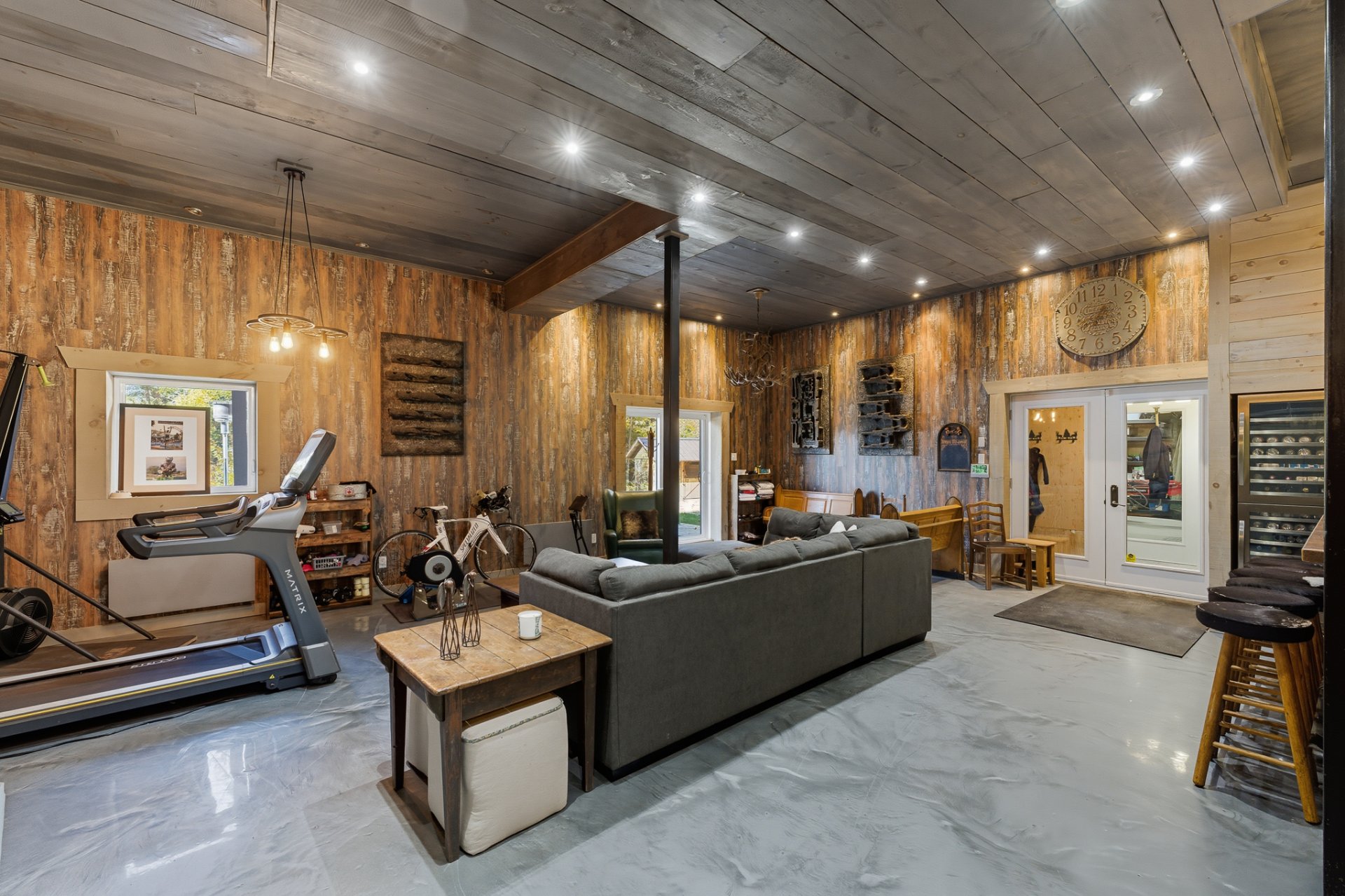 Une très grande salle familiale baignée de lumière naturelle s'ouvre sur la nature environnante, offrant une atmosphère apaisante et chaleureuse. Le rez-de-jardin, avec ses plafonds majestueux de 12 pieds, propose de multiples possibilités d'aménagement : une vaste salle familiale avec coin bar, une salle de bains équipée d'une douche vapeur, et des espaces parfaitement pensés pour le confort moderne.