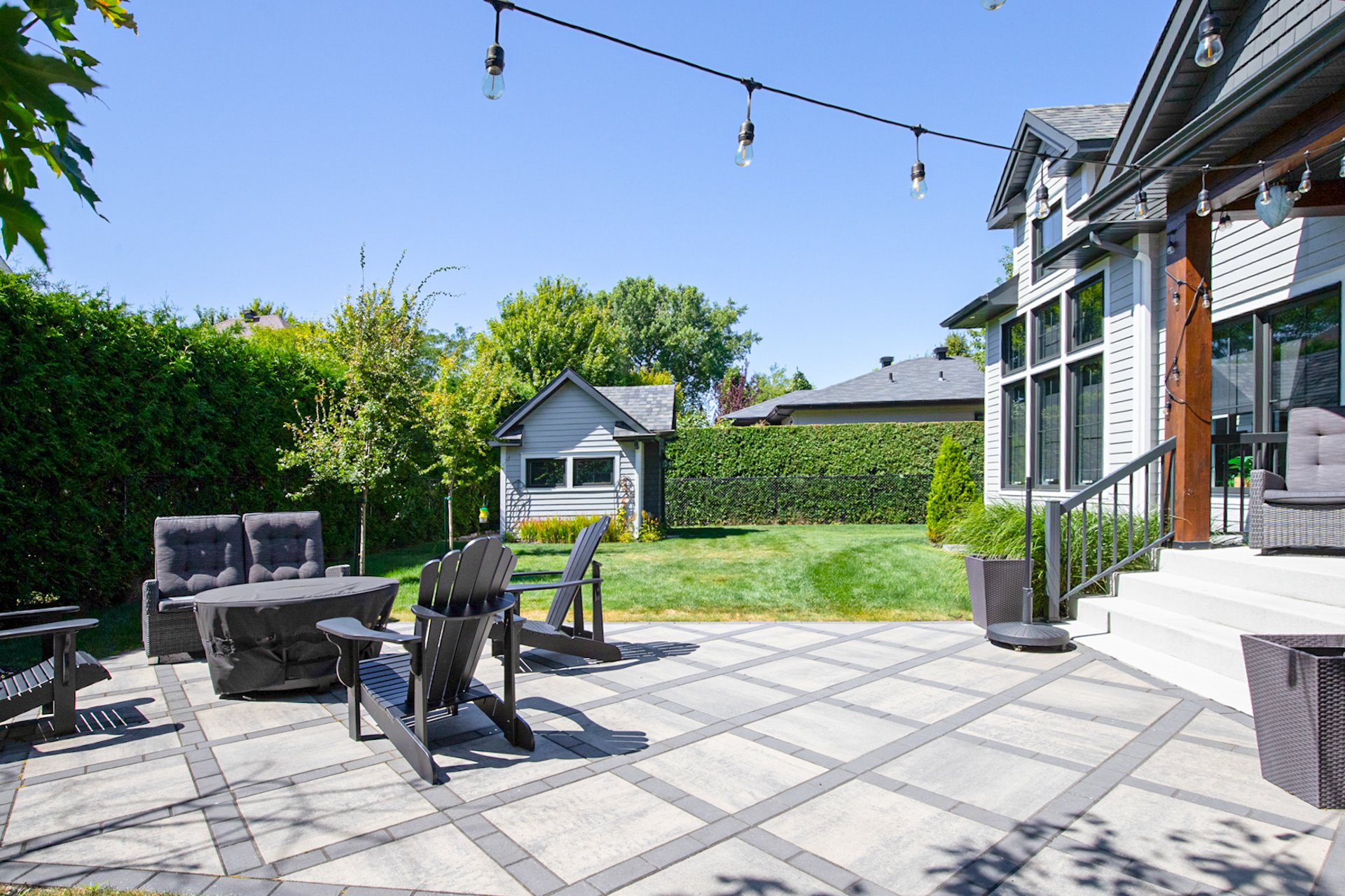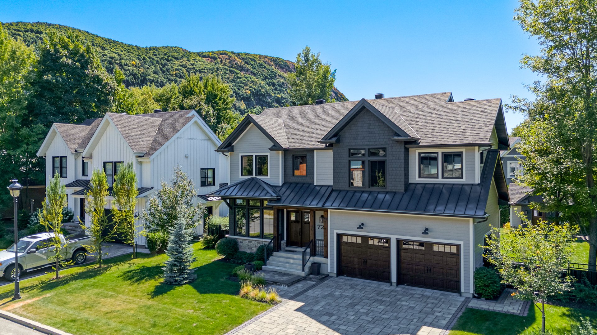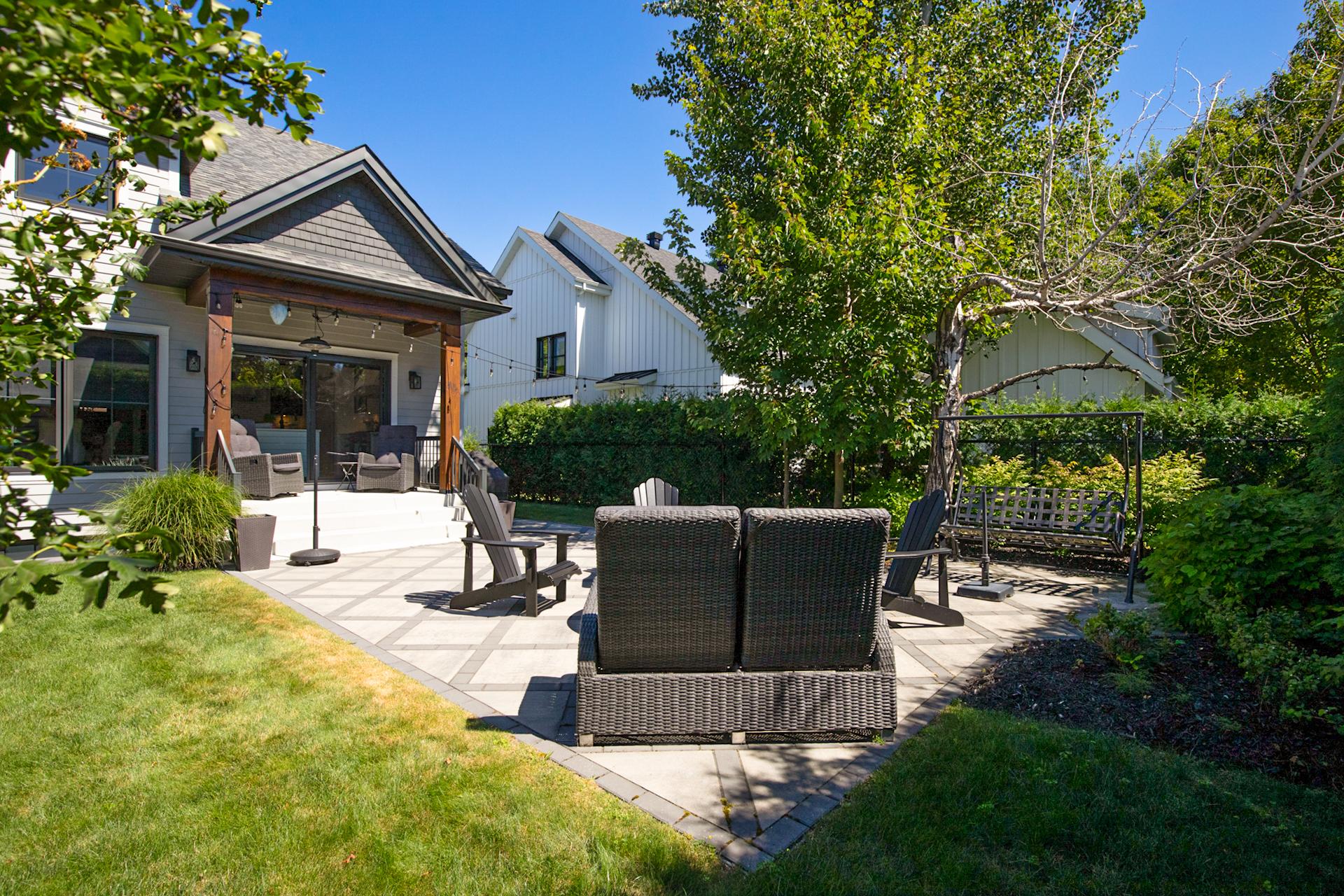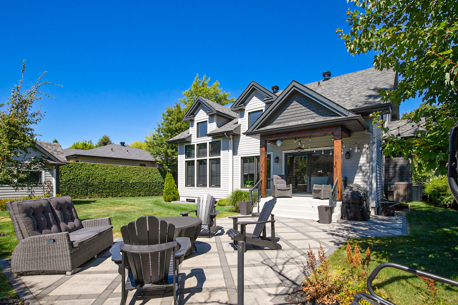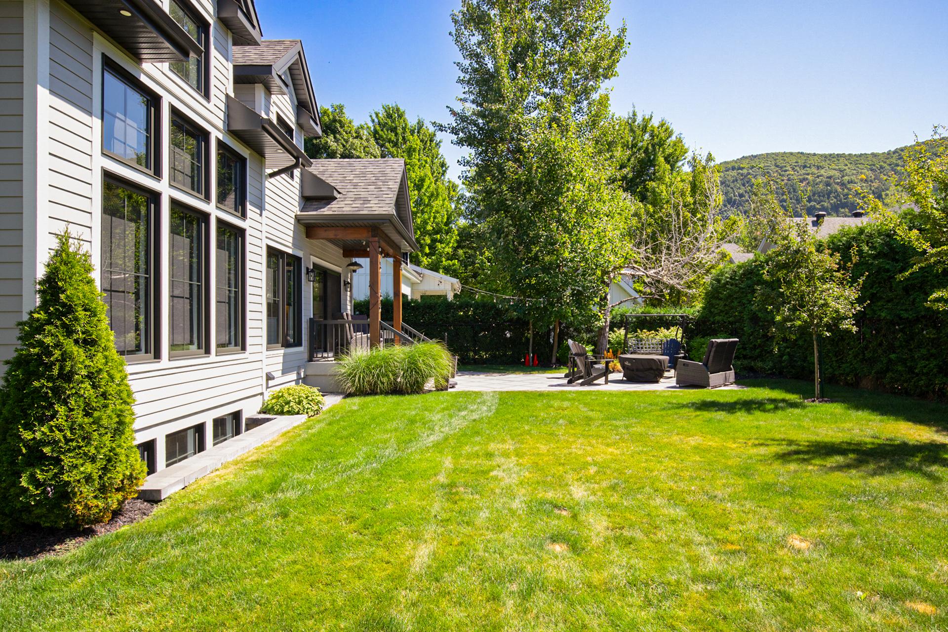À l'extérieur, la cour arrière bien orientée pour capter le soleil toute la journée constitue un véritable havre de paix, intime et verdoyant, au pied de la montagne.