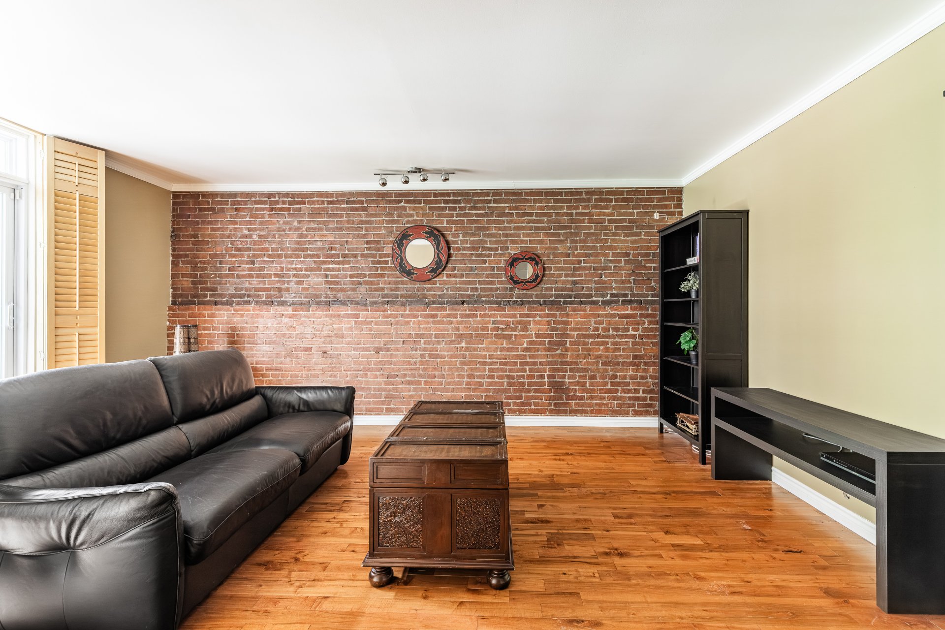*Salon lumineux avec mur de brique apparent et grandes fenêtres.