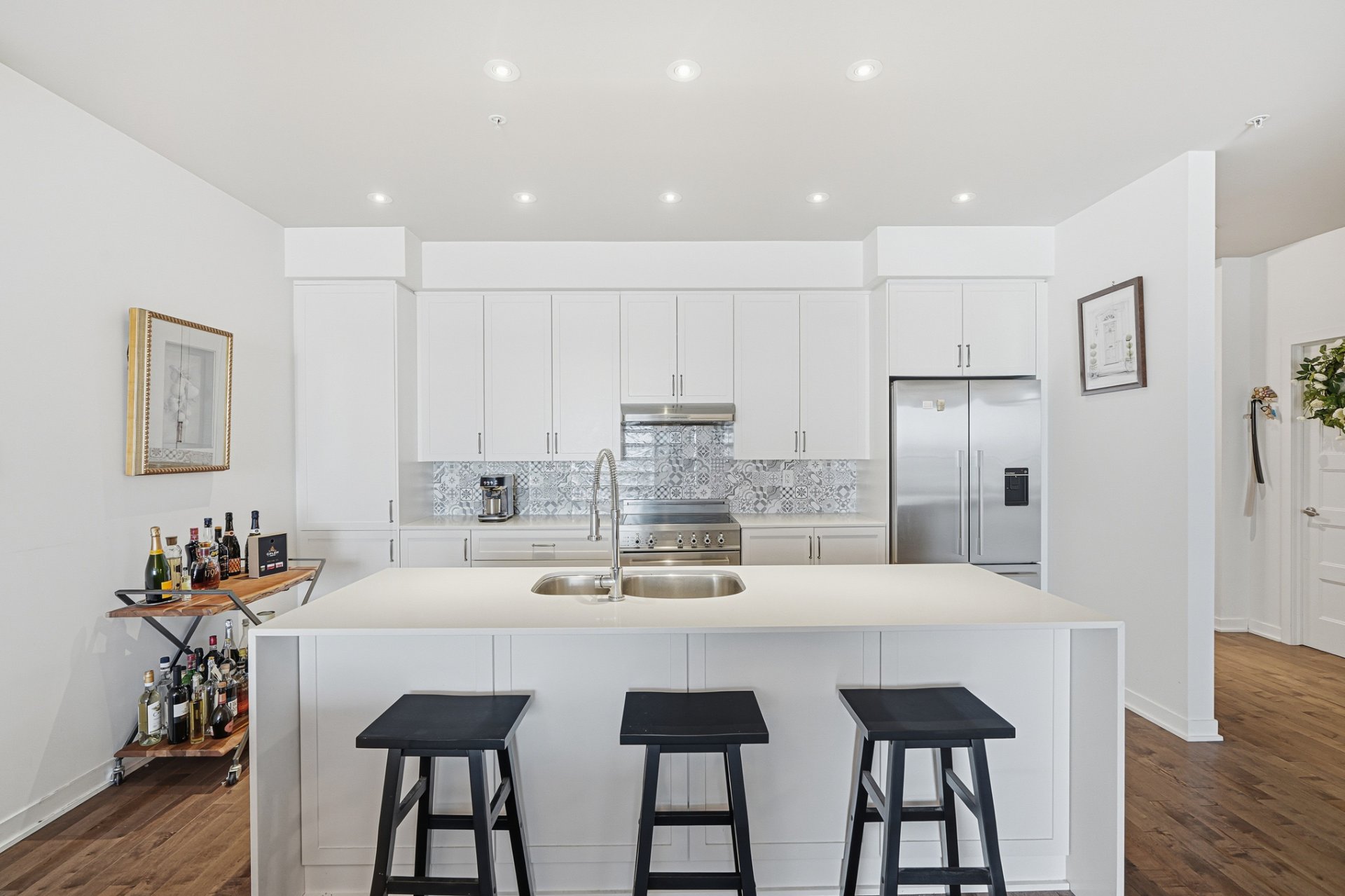 + Cuisine contemporaine avec îlot central et comptoir de quartz