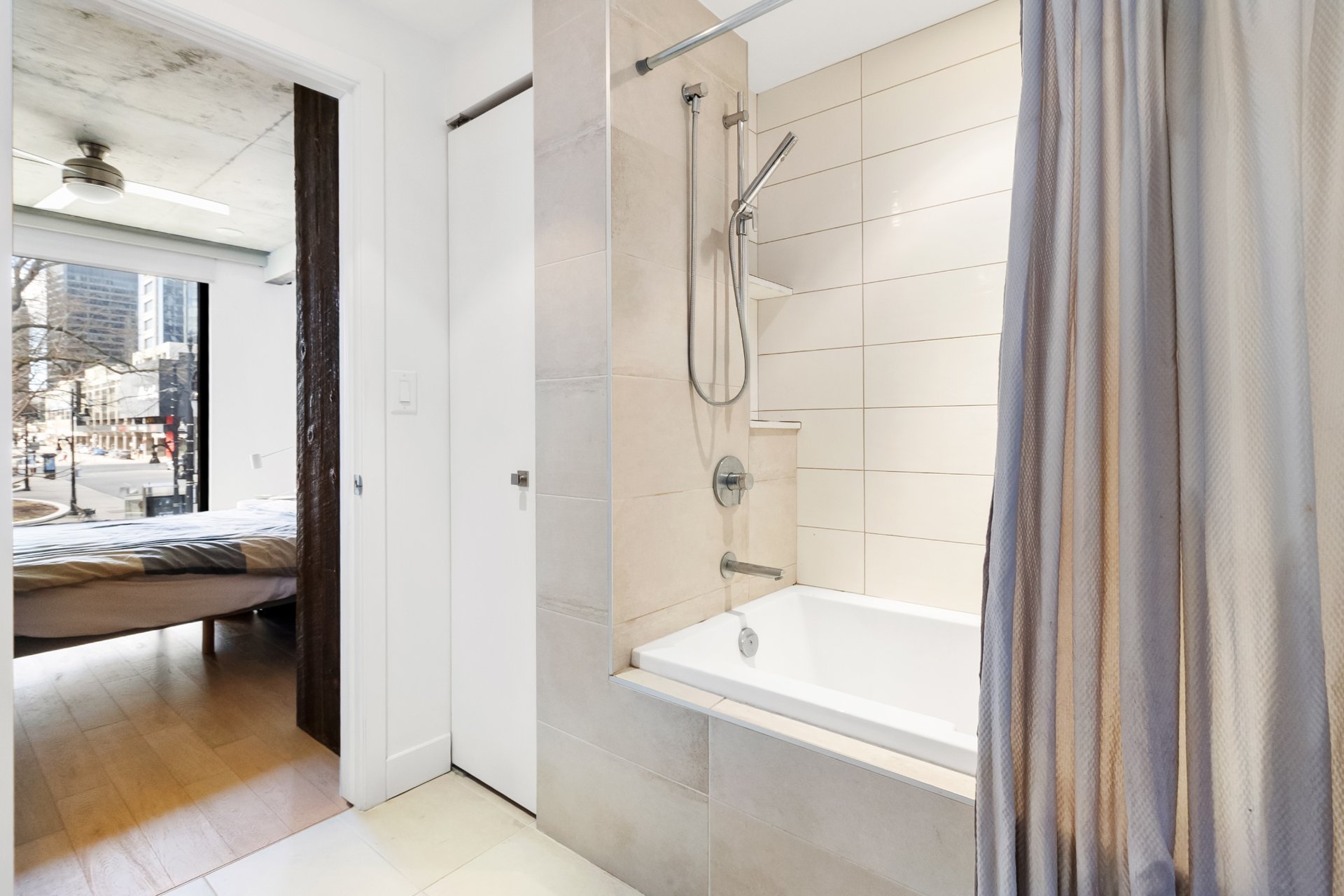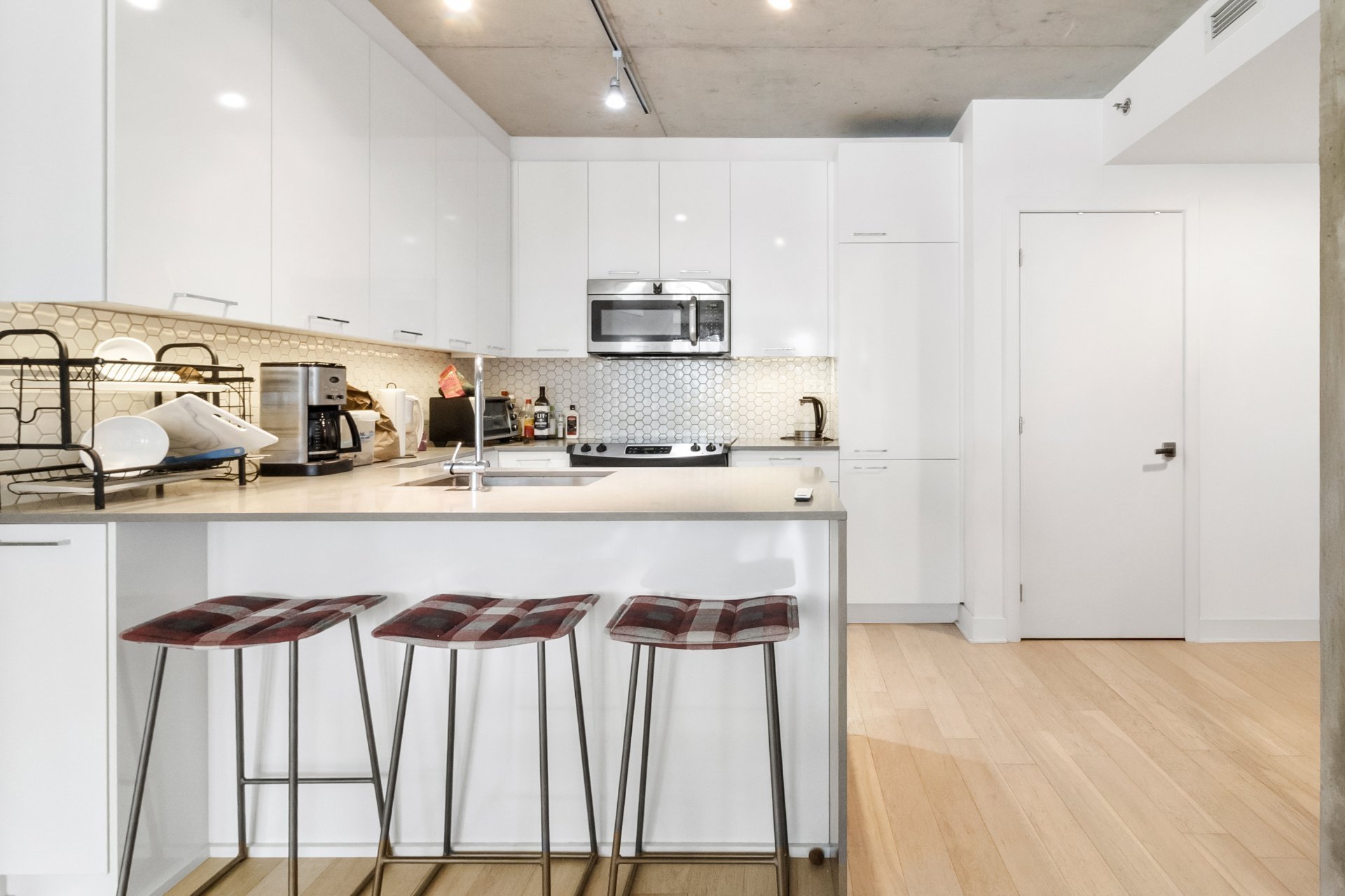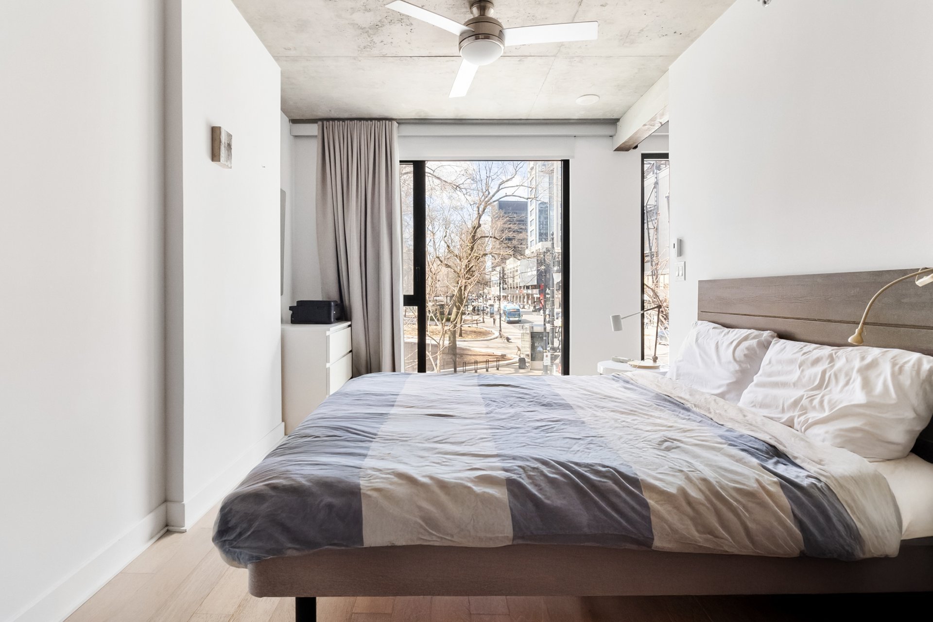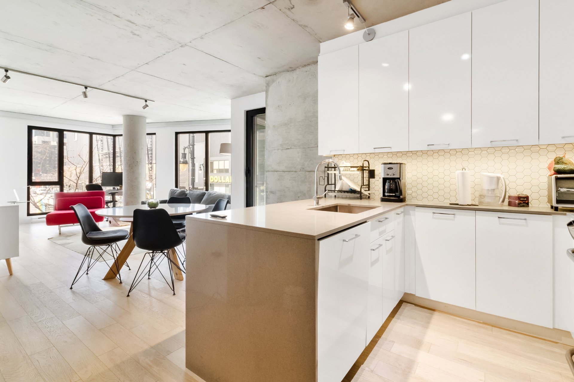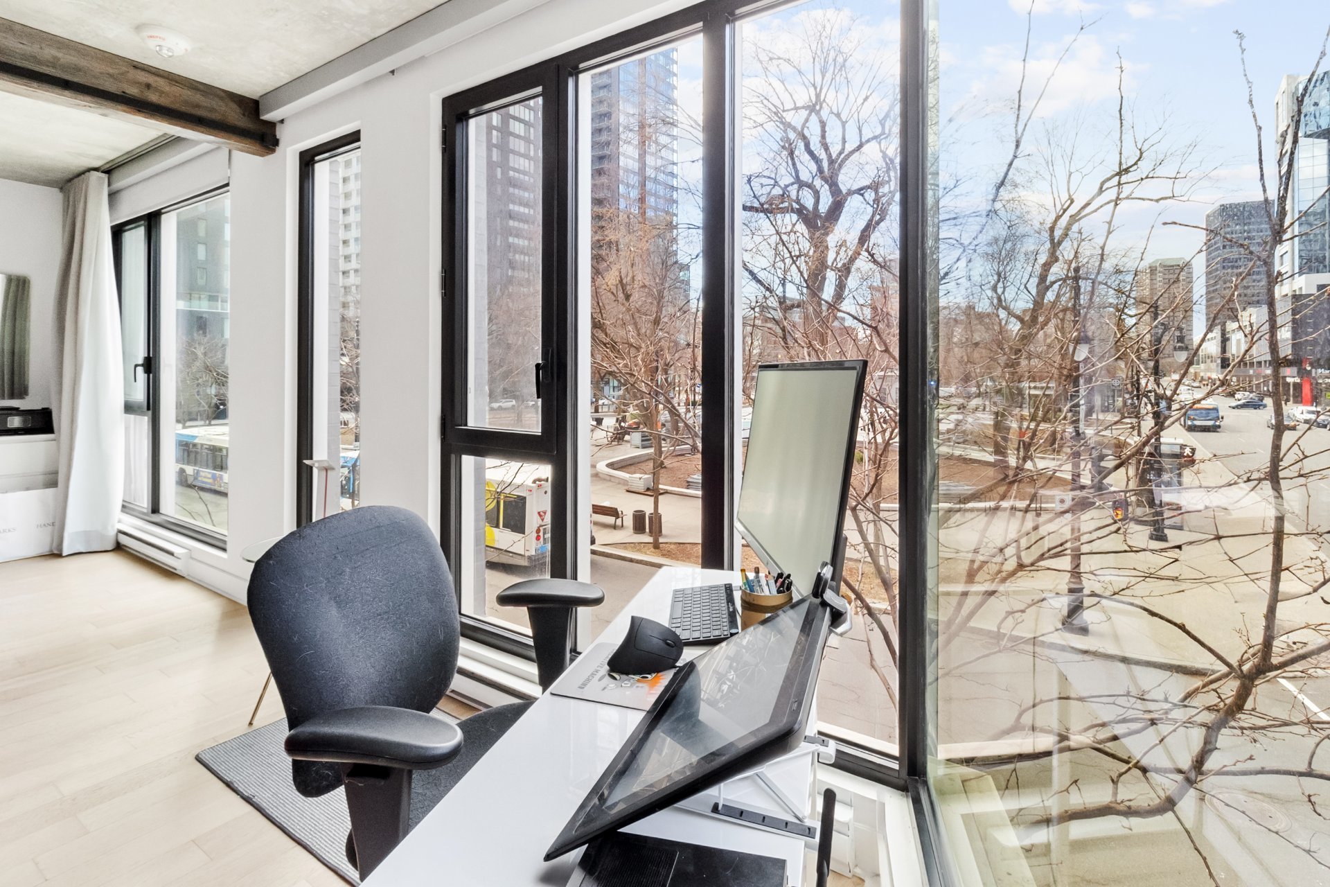 S sur le Square | Unité de coin lumineuse au coeur du village Shaughnessy, à deux pas des services (SAQ, Adonis, Supermarché PA, Complexe Alexis-Nihon), du métro Atwater et des accès rapides. Aire de vie à concept ouvert, cuisine moderne, 1 chambre fermée, climatisation centrale, balcon privé. Inclus : 1 casier, espace vélos. Espaces communs : salle d'exercice, terrasse au 4e étage, toit-terrasse avec piscine et vue sur la ville.