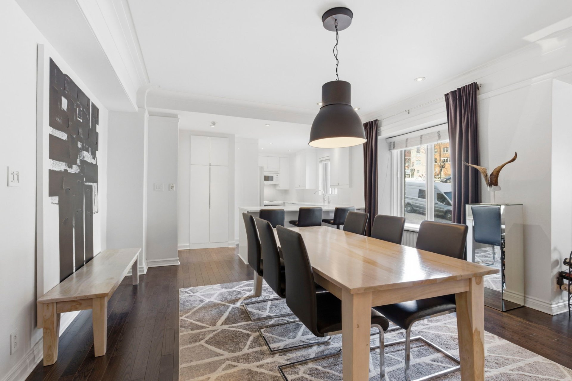 Aire de vie : Vaste aménagement à aire ouverte agrémenté de nouveaux planchers de bois (2023) et d'une fenestration généreuse inondant l'espace de lumière naturelle.