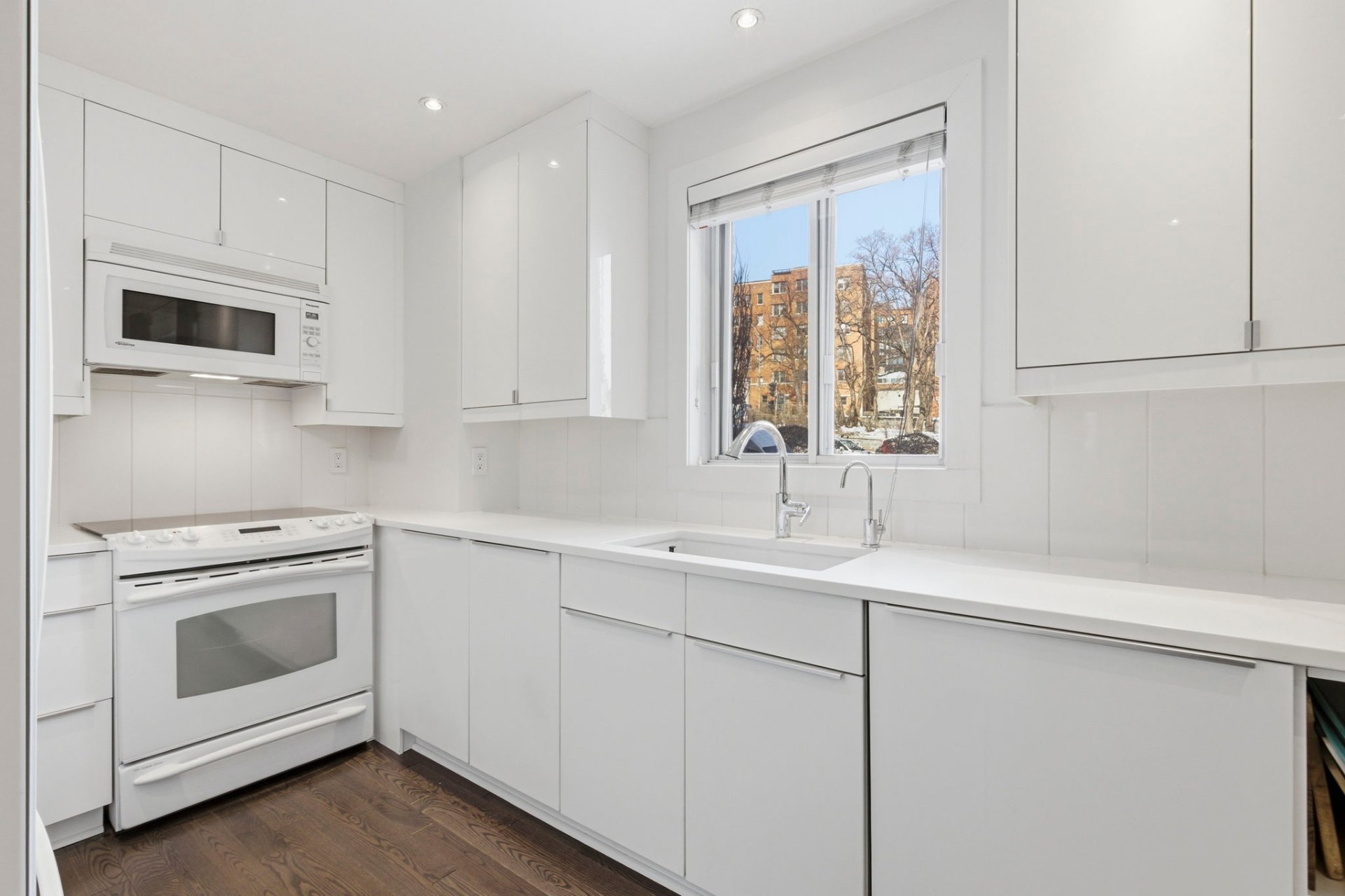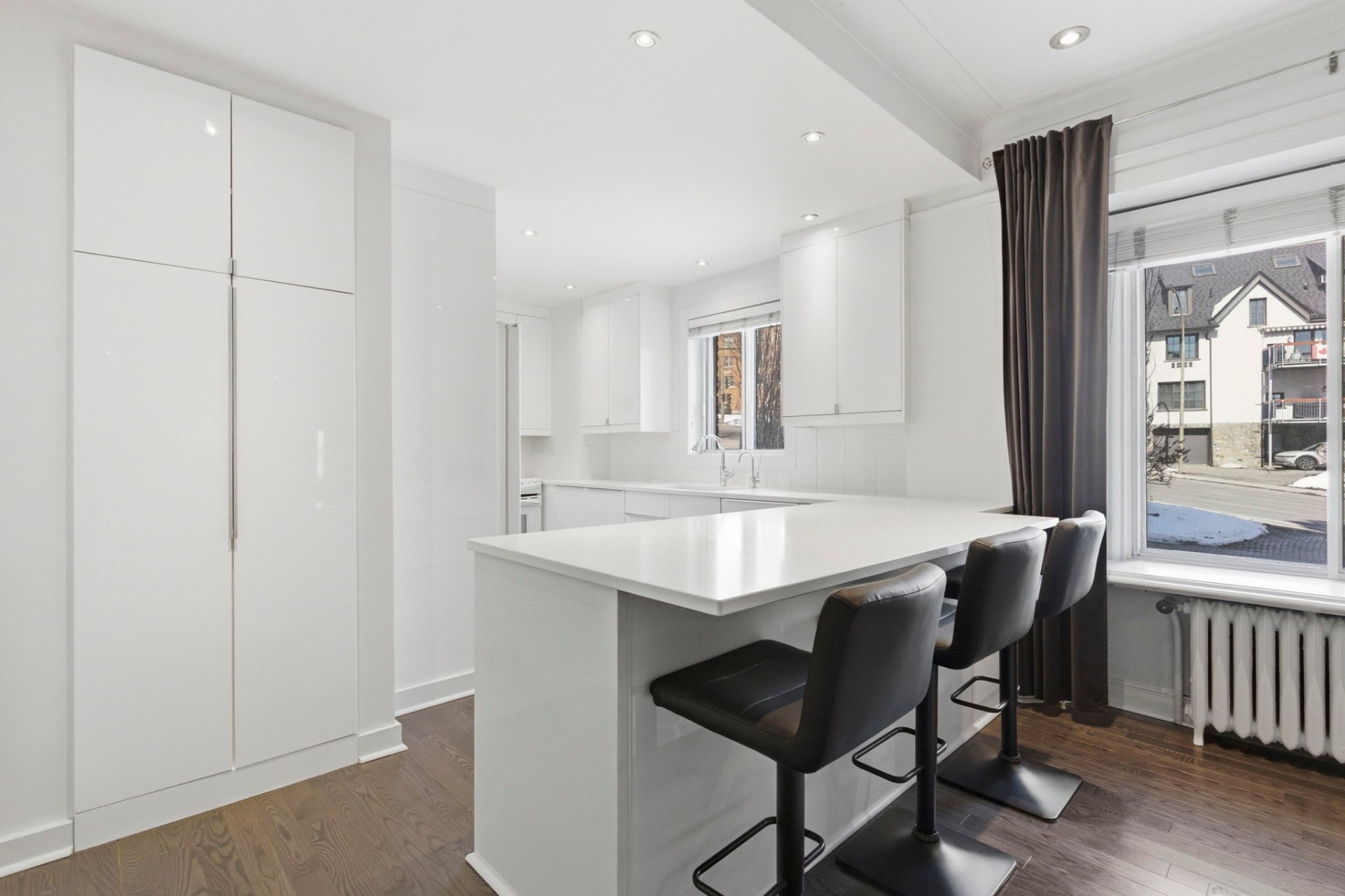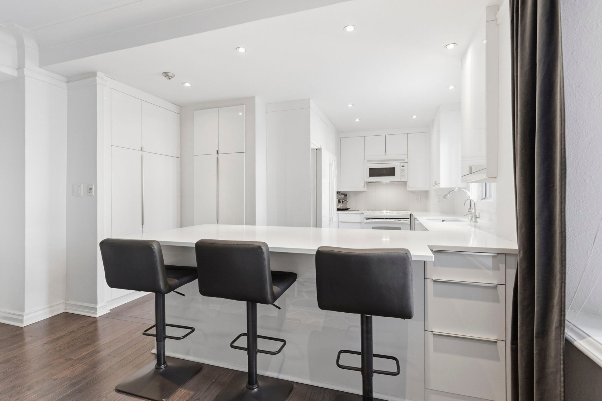 La Cuisine : Design minimaliste « tout blanc » optimisé par des armoires pleine hauteur sur mesure offrant un rangement massif et un comptoir-lunch intégré.