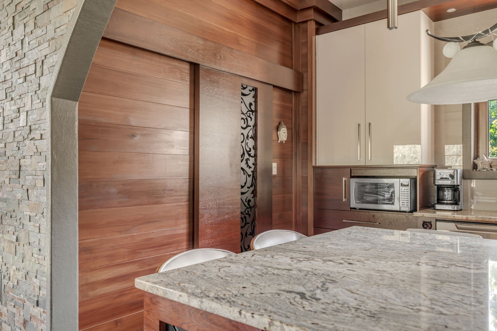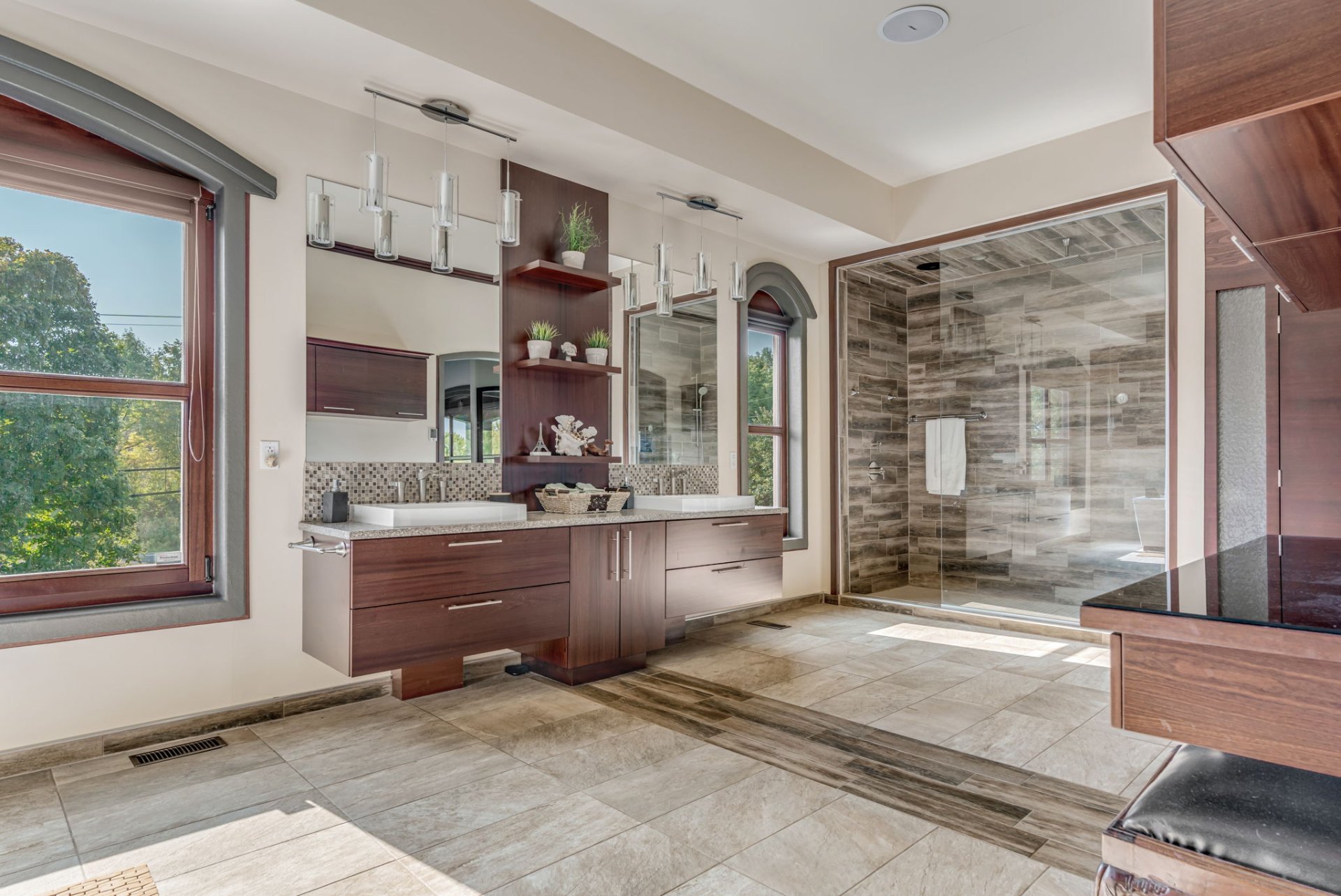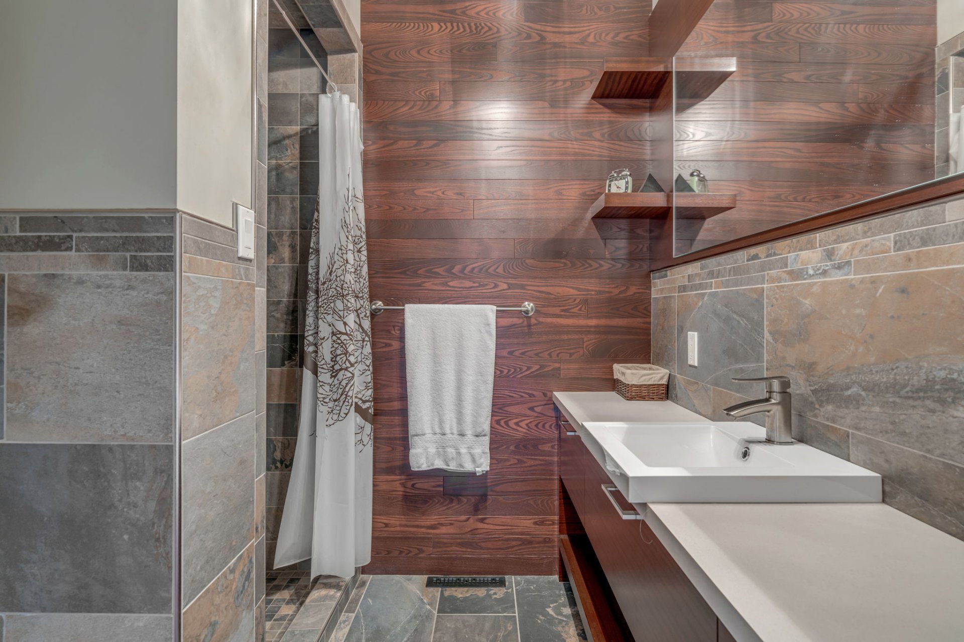 - Salle d'eau luxueuse avec murs en acajou et lavabo italien assorti à l'escalier.