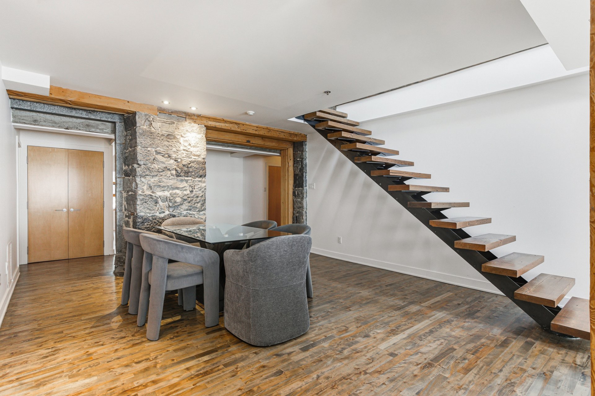 PENTHOUSE DEUX ÉTAGES Découvrez le charme unique de ce bijou d'antan situé au coeur du Vieux-Montréal. RDC (3e): Salon et salle à manger à aire ouverte avec portes-fenêtres françaises, poutres en bois d'origine, murs en pierre et en brique, planchers de bois franc et en IPE brésilien, hauts plafonds, cuisine gastronomique avec cuisinière à gaz, grandes fenêtres donnant sur une cour luxuriante, buanderie et salle d'eau. Dernier étage (4e) : Den ensoleillé avec cheminée au gaz et bar, suite parentale avec salle de bains attenante, deuxième chambre avec salle de bains attenante. Frais mensuels faibles. 2 parkings vignette, 1 location à côté.