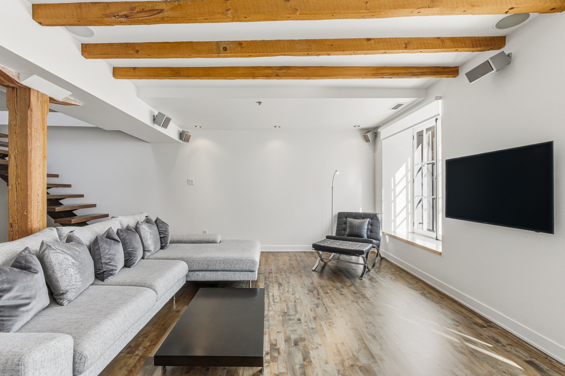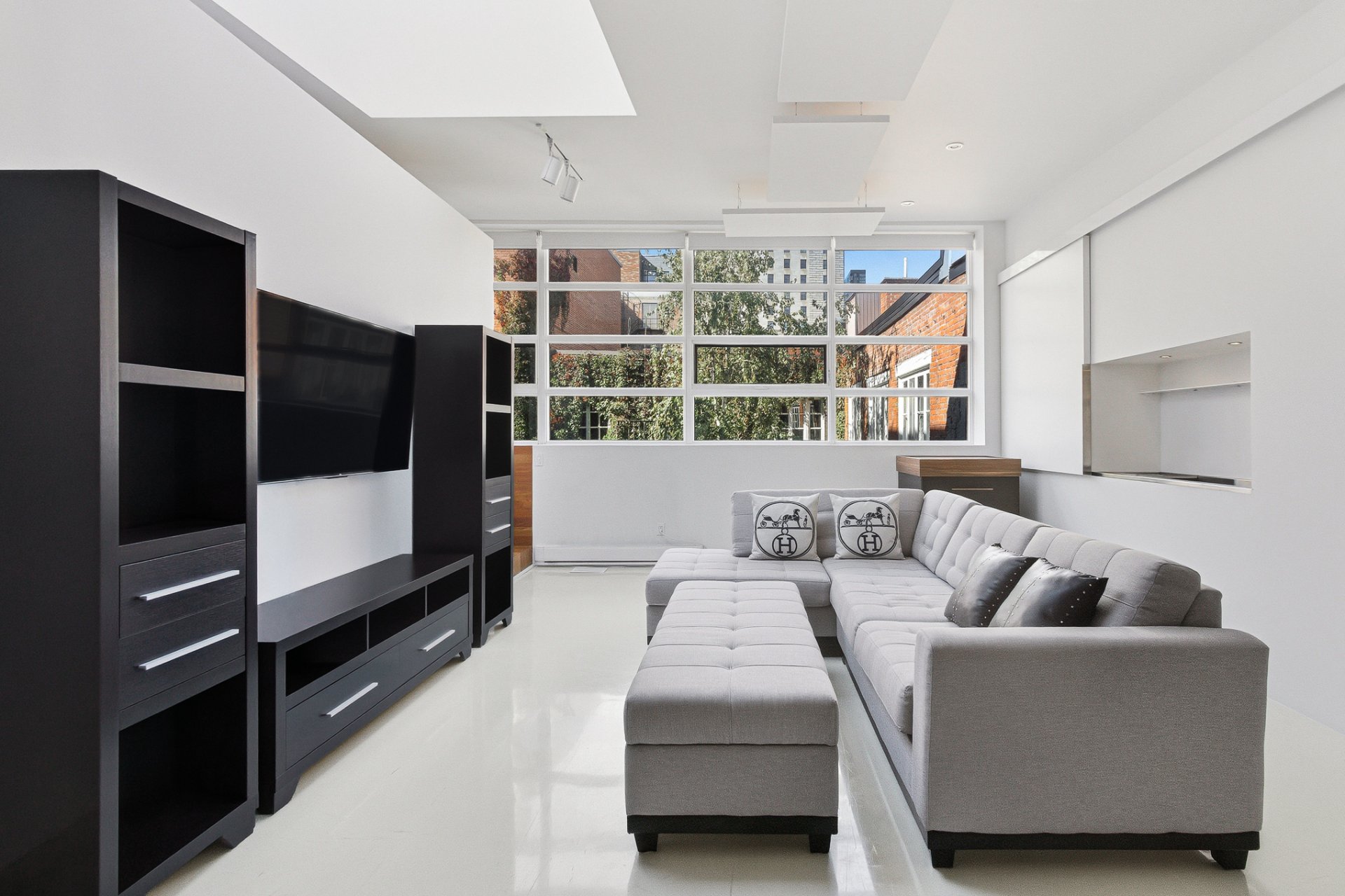 * Salle familiale avec TV, planchers époxy blanc, grandes fenêtres