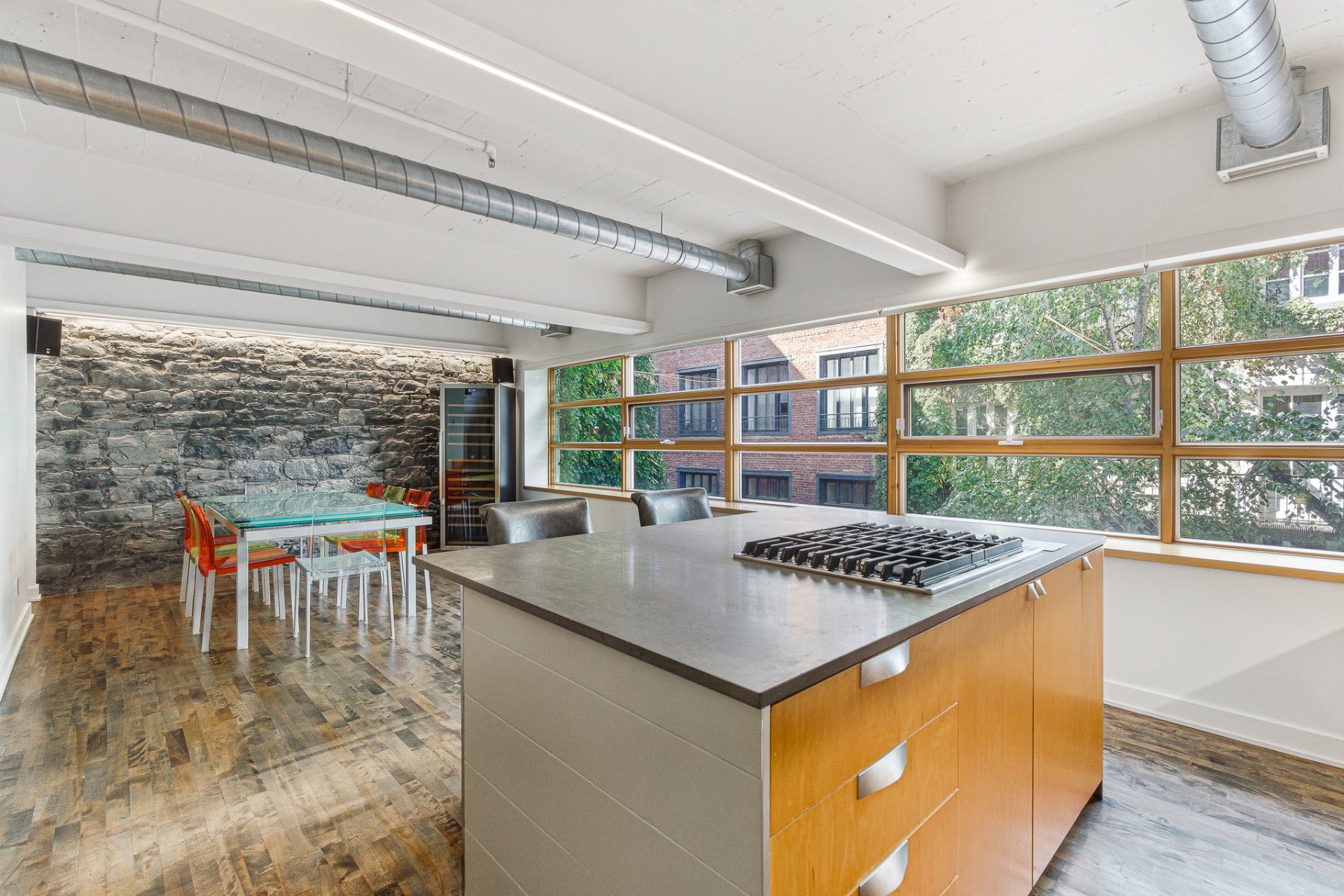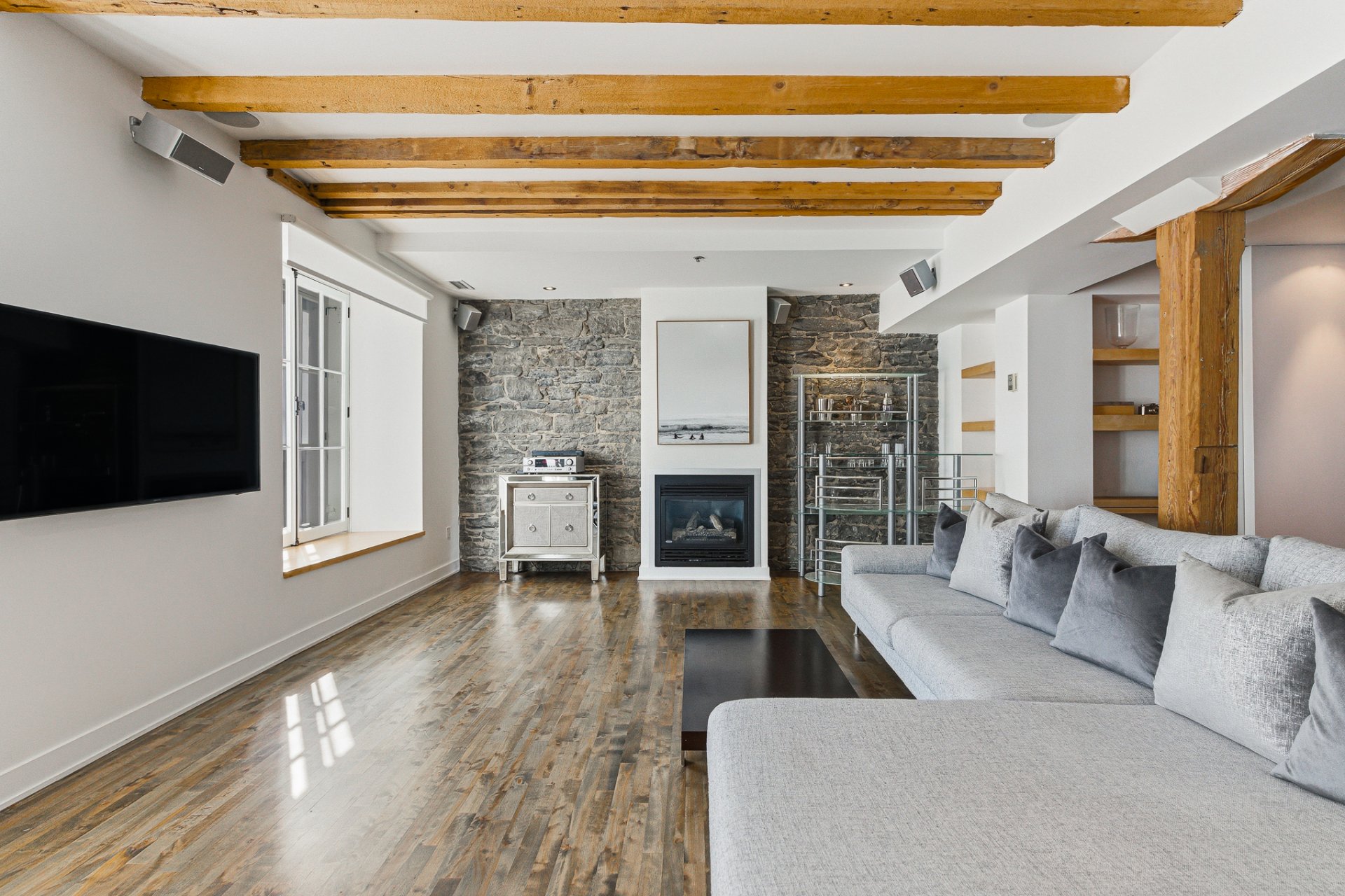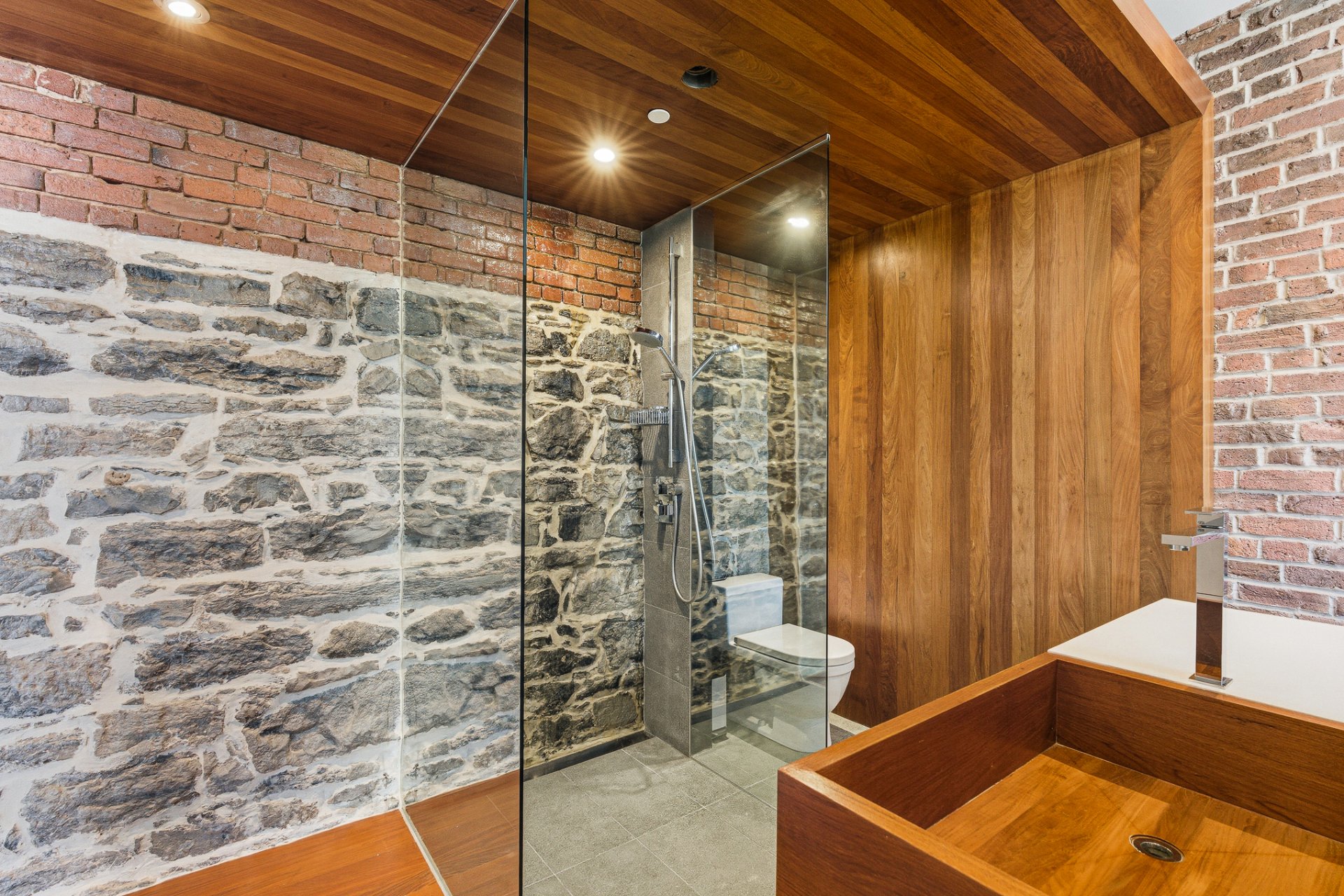 * Grandes portes-fenêtres permettant une abondance de lumière naturelle, poutres en bois d'origine partout, murs en pierre et brique, planchers de bois franc et IPE brésilien, hauts plafonds.