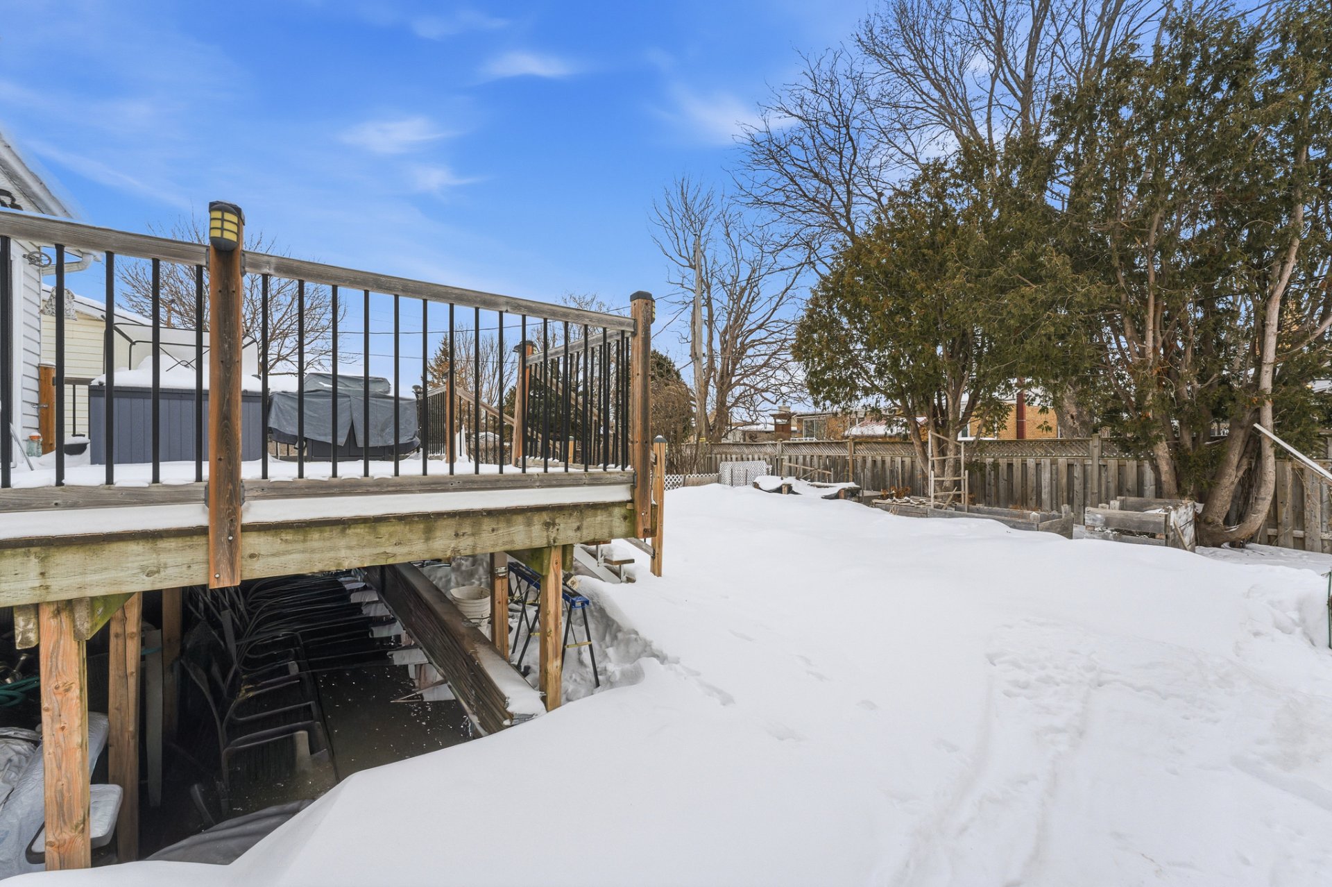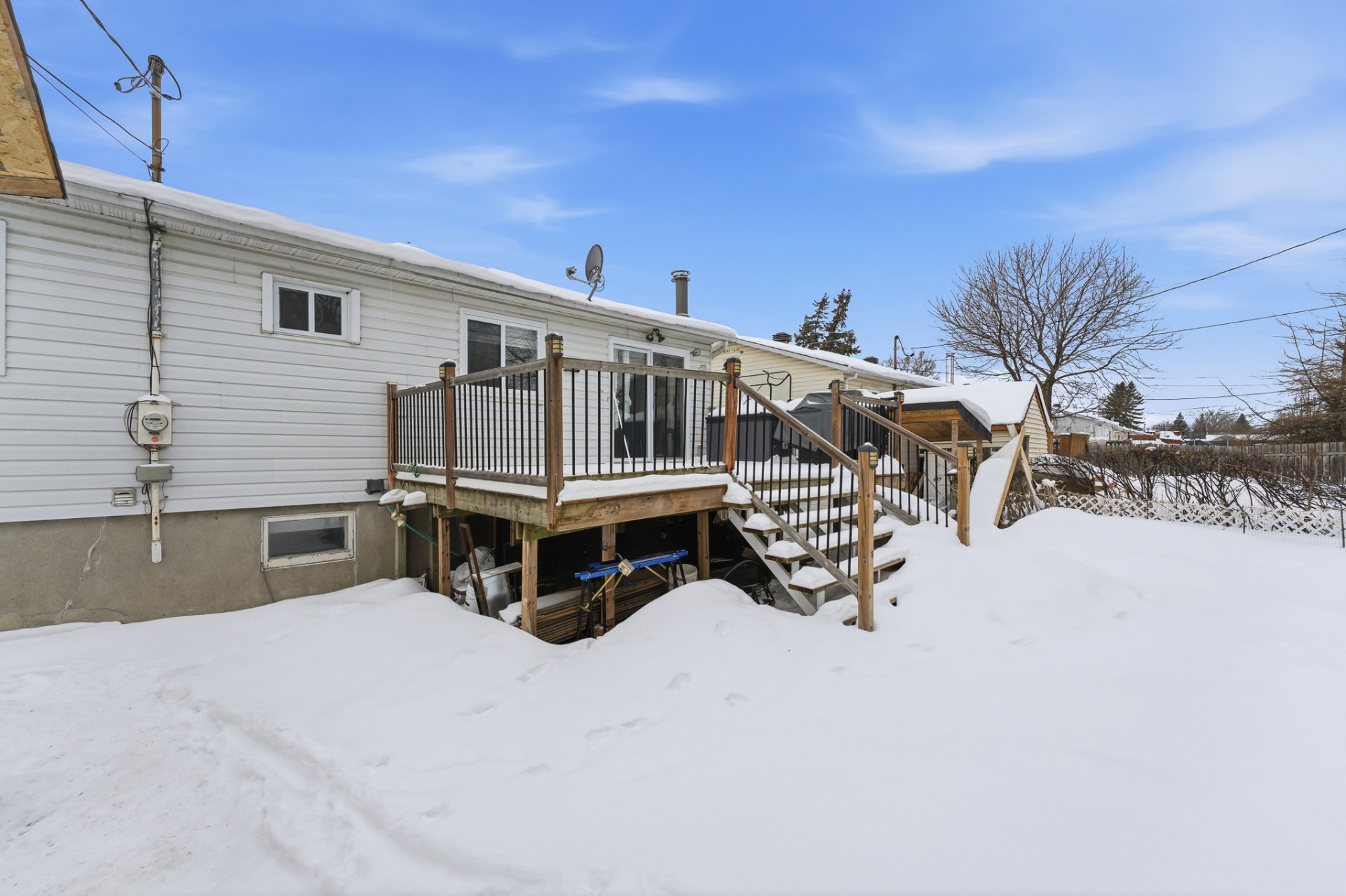 À l'extérieur, le terrain offre un environnement agréable pour profiter des saisons, avec un grand cabanon permettant un rangement supplémentaire pratique.