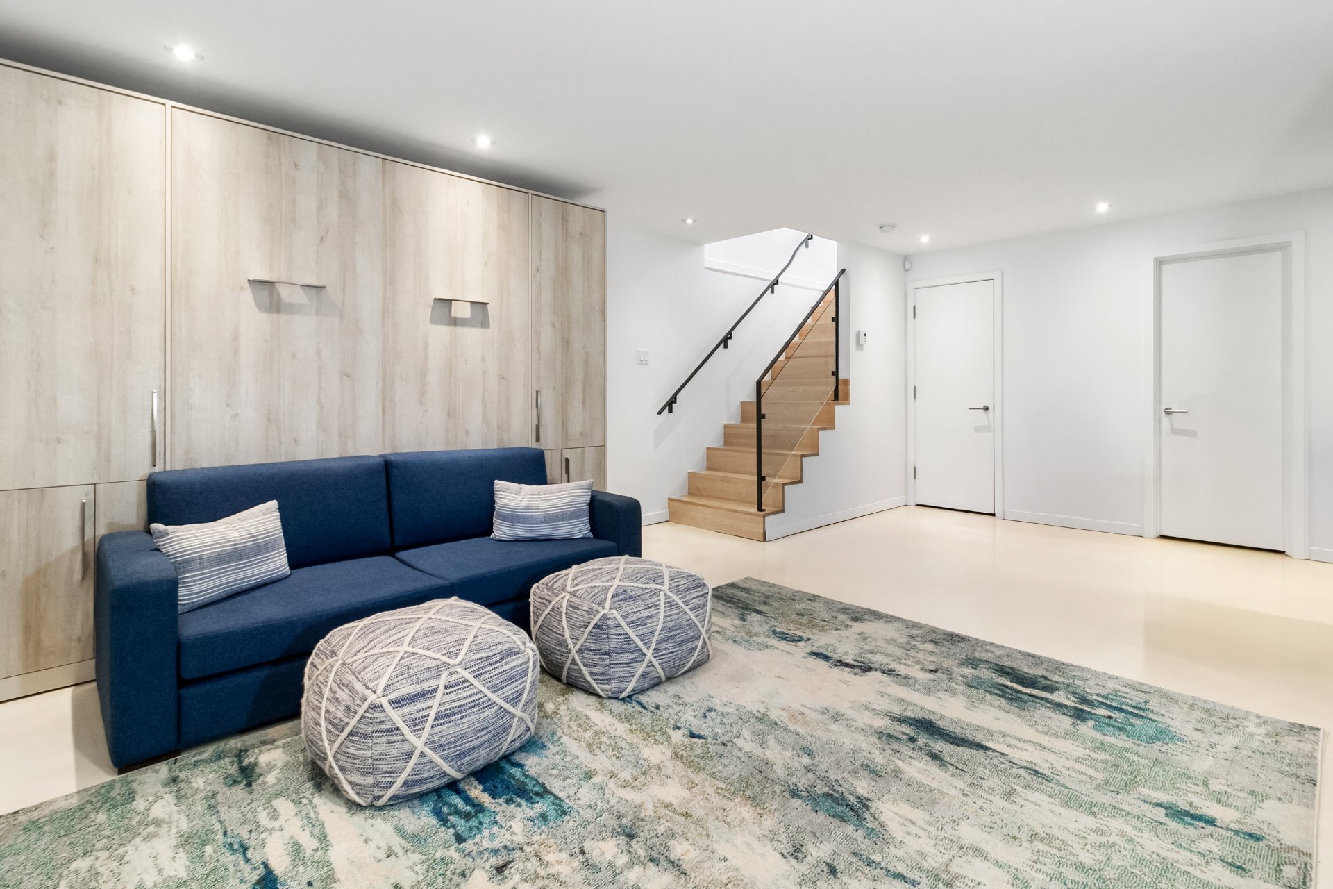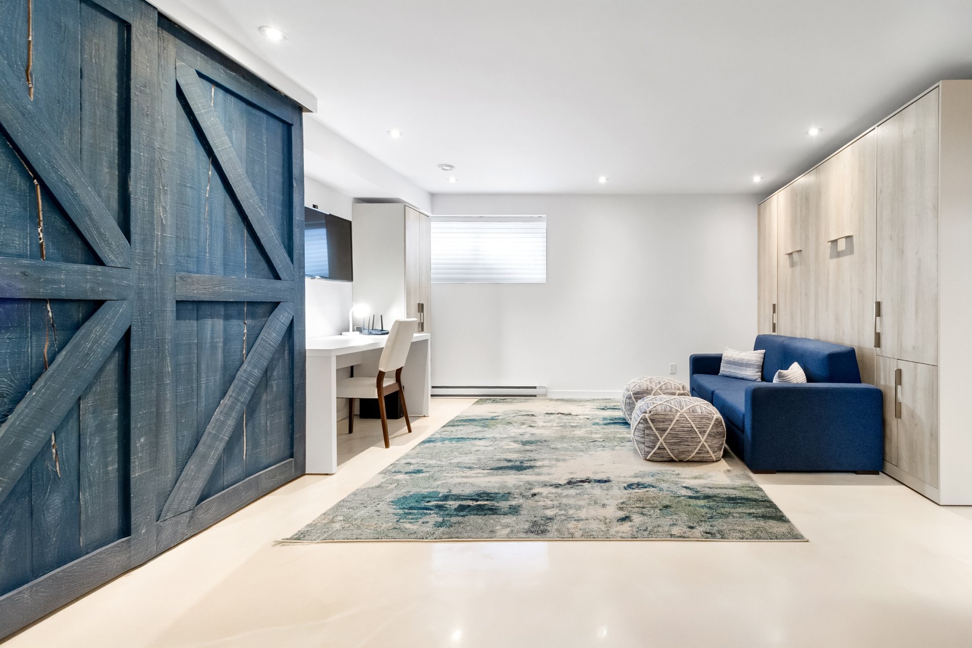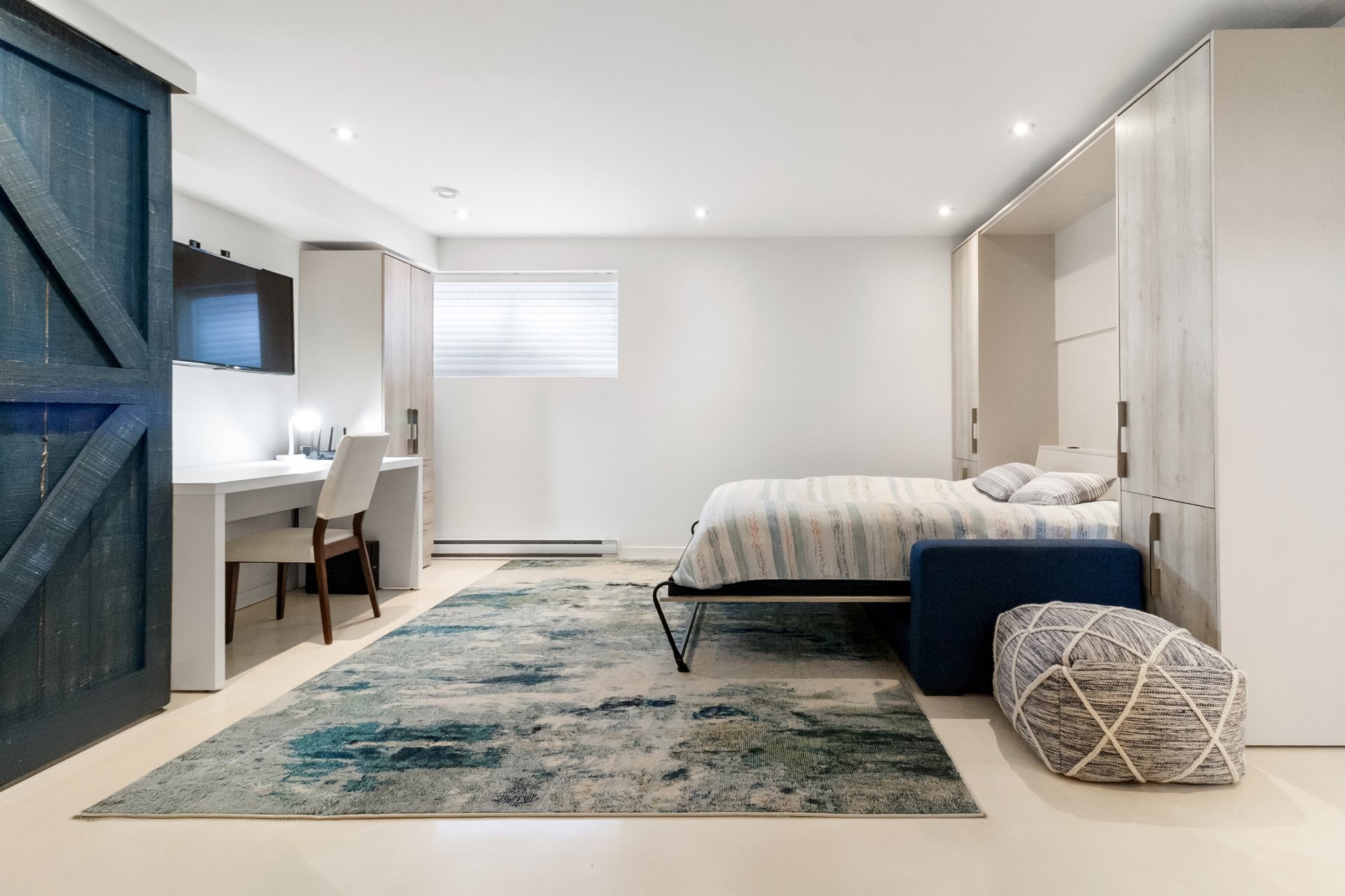 - Réfrigérateur, cuisinière, lave-vaisselle, laveuse, sécheuse, habillage fenêtres, luminaires, mobilier encastré, lit mural et fauteuil bleu, patère murale, rangement chaussures.