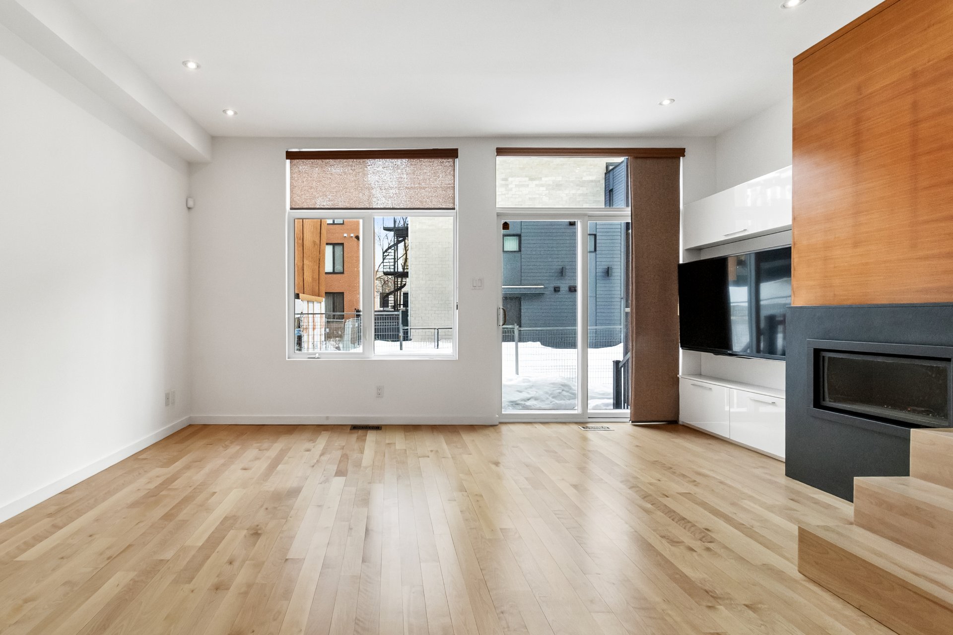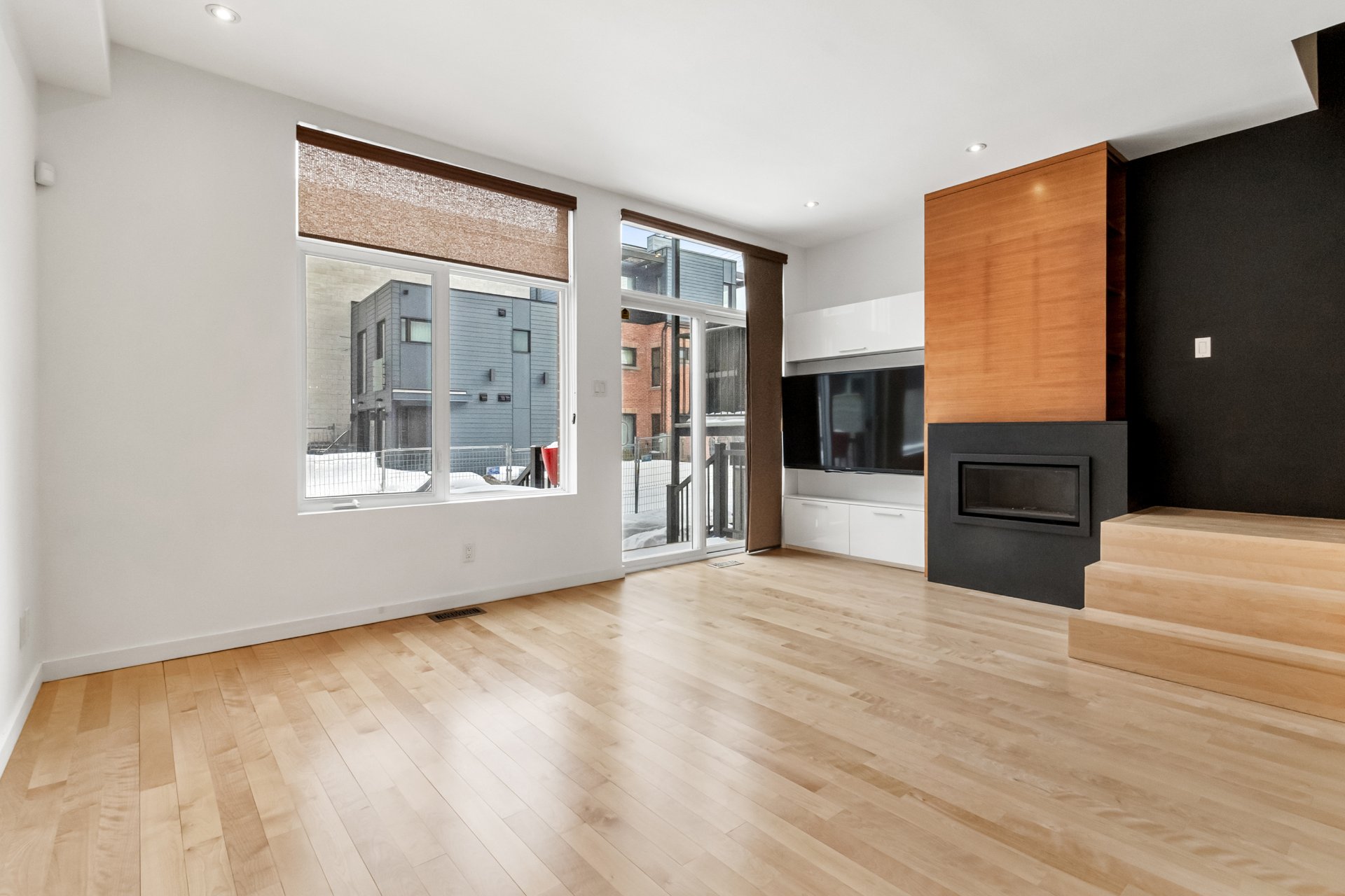 - Aire ouverte cuisine, salle à manger, salon avec foyer au gaz