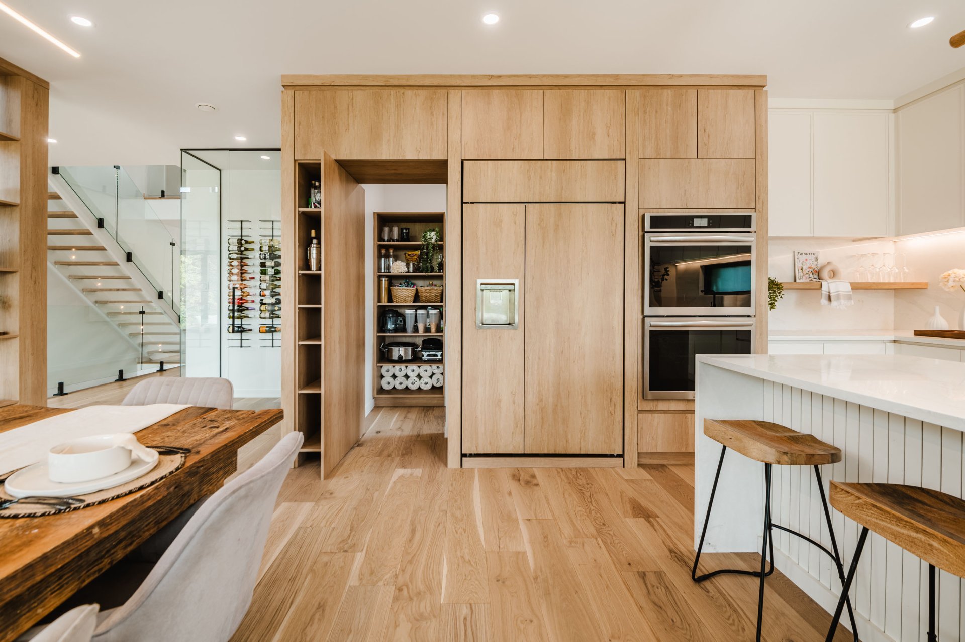 Un cellier vitré pleine hauteur ajoute une touche sophistiquée à l'espace.