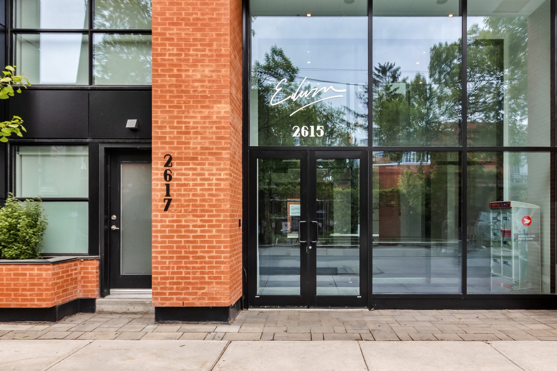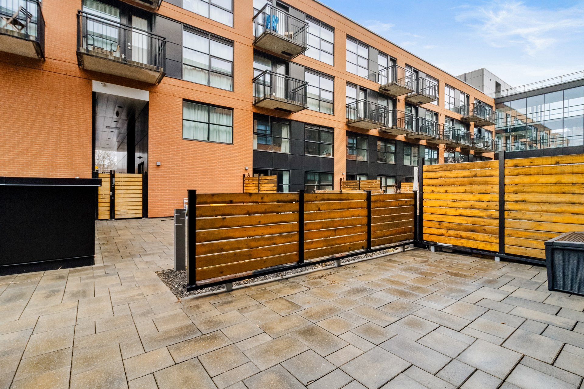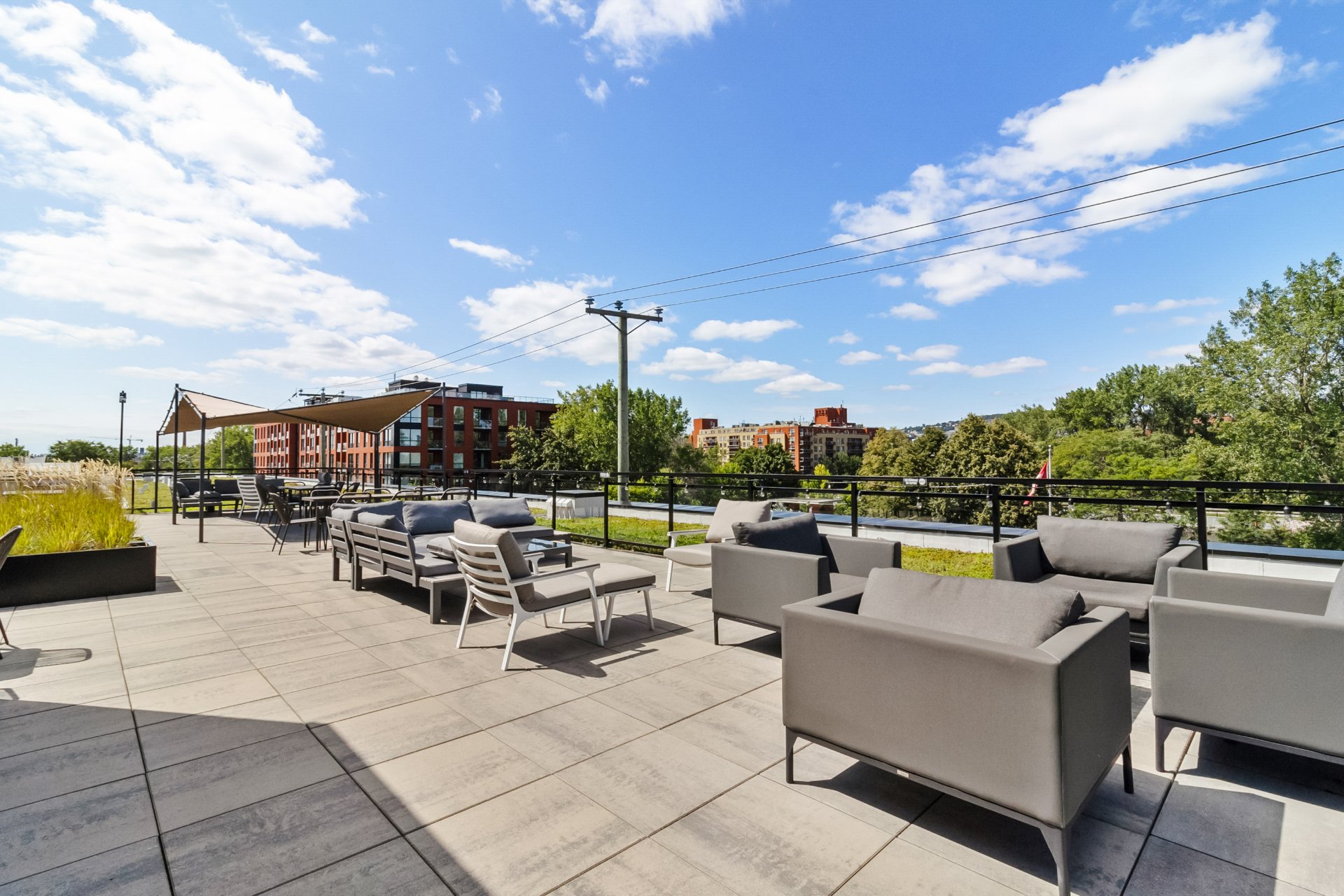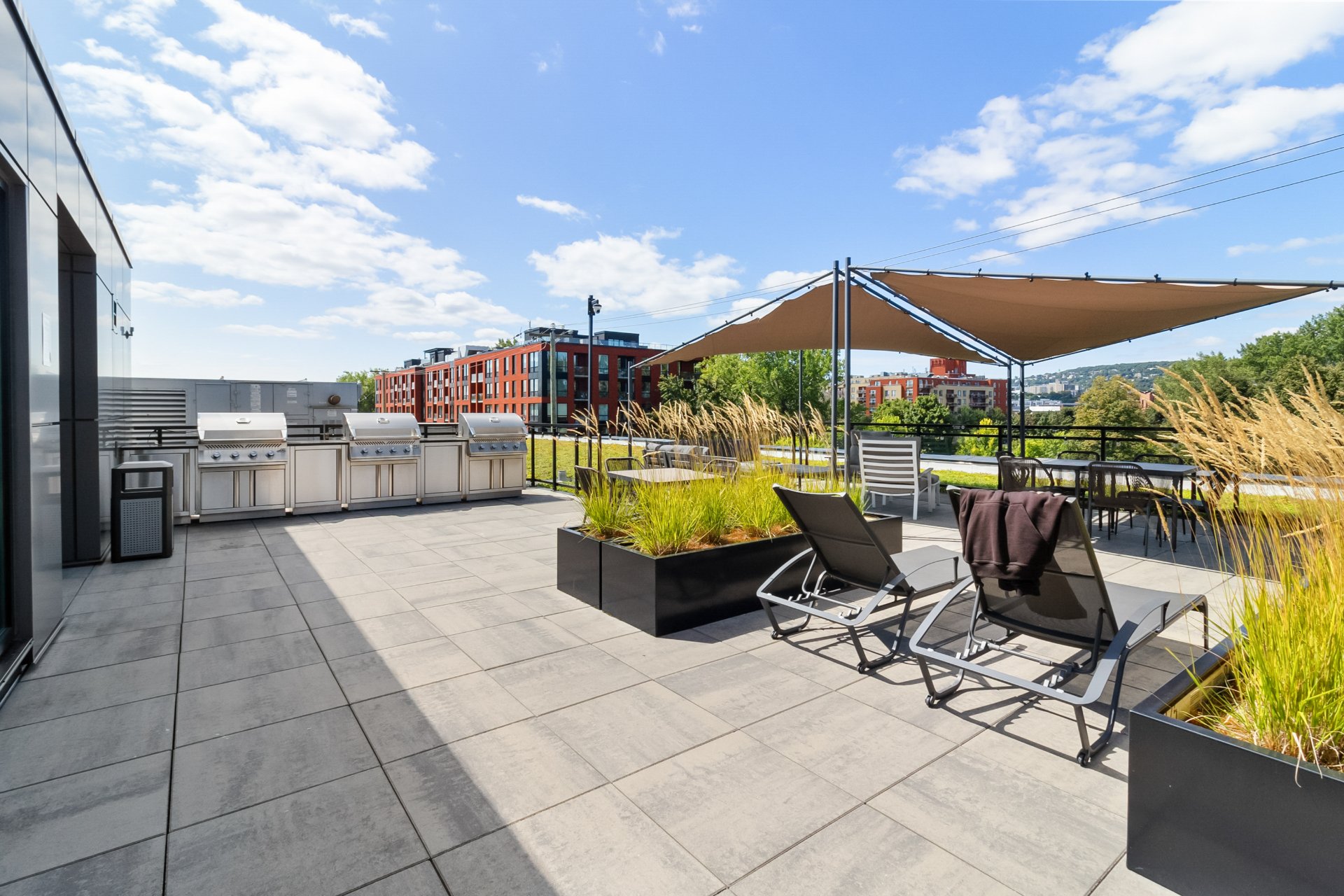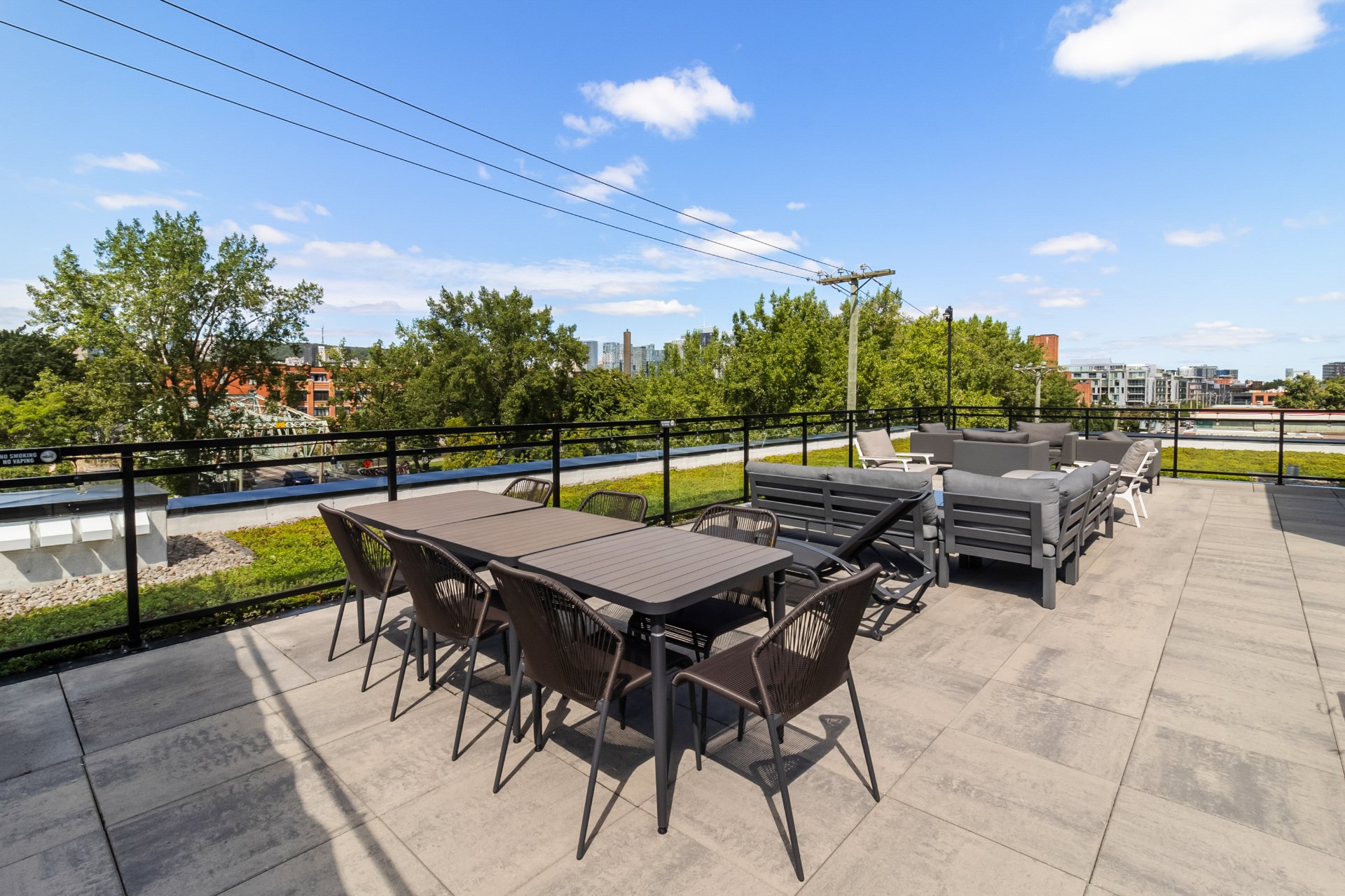 EDWIN | Immeuble de construction 2021 avec ascenseur. Terrasse commune sur le toit avec BBQ et vues panoramiques sur le canal, le centre-ville et le mont Royal. Salon lounge, salle d'exercice, chute à déchets à chaque étage, rangement à vélos, système de détection de fuites et interphone à l'entrée.
