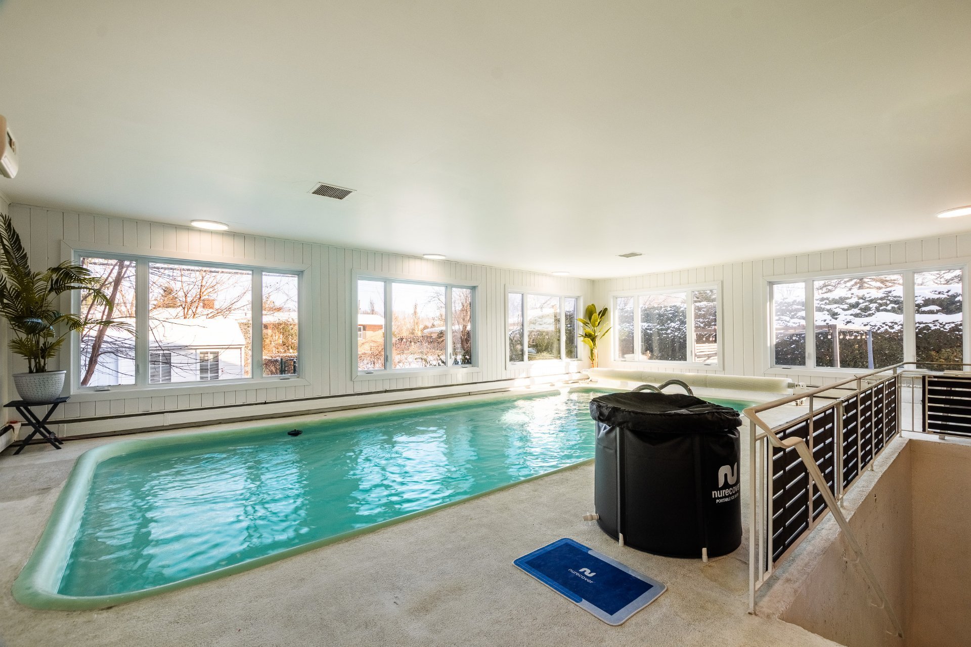 On y retrouve aussi trois chambres de bonnes dimensions, une salle de bain complète avec bain et douche séparés, ainsi qu'une salle d'eau. S'ajoutent à cela, un véritable coup de coeur, la piscine intérieure chauffée, entourée de larges fenêtres, et permet une utilisation en toute saison.