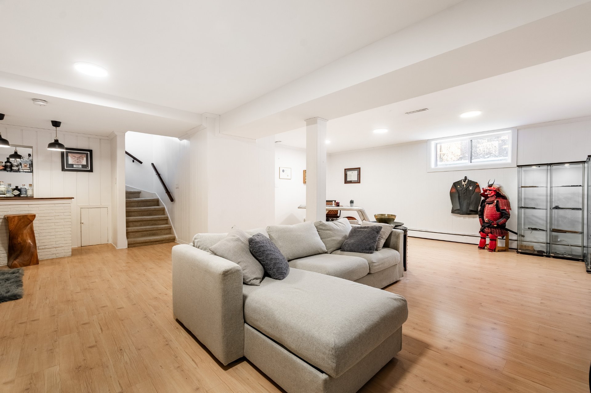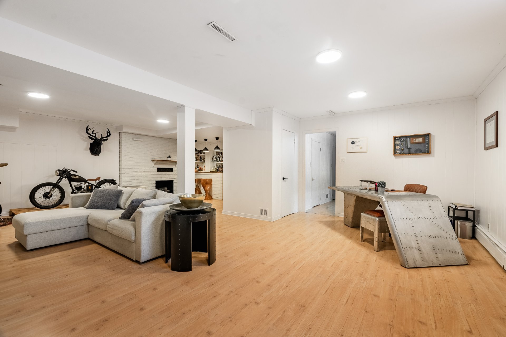 Le sous-sol, entièrement aménagé, offre une vaste salle familiale avec foyer, parfaite pour les moments en famille, accompagnée d'un coin bureau, d'un espace bar, une chambre supplémentaire, une salle d'eau ainsi que des pièces de rangement.