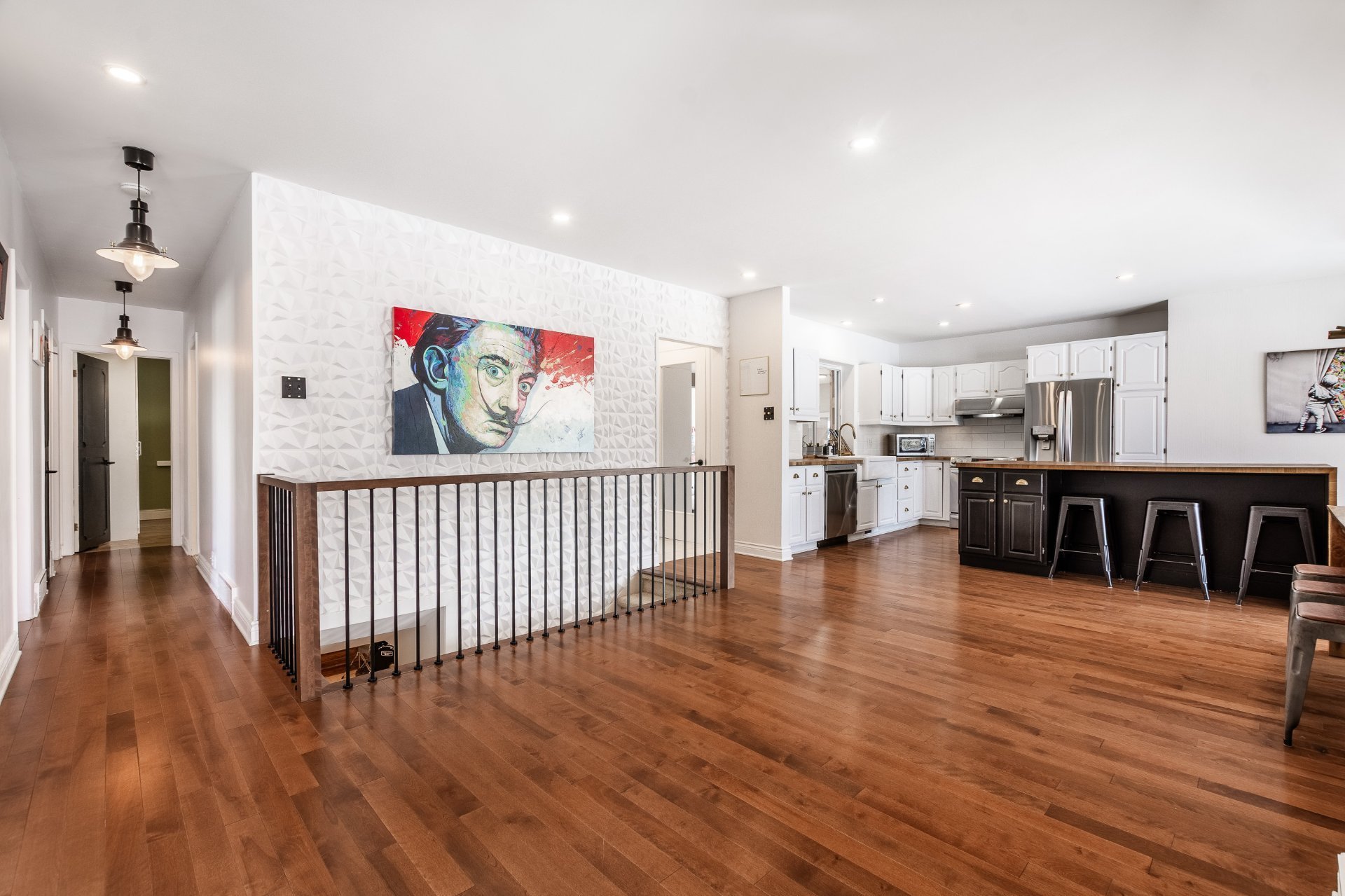 Dès l'entrée, elle vous séduira par son espace accueillant et ouvert. Le rez-de-chaussée propose une aire de vie conviviale, où la cuisine ouverte, dont la division a été repensée, s'harmonise parfaitement avec la salle à manger, idéale pour recevoir. Le salon, situé dans le prolongement de l'espace de vie à aire ouverte, bénéficie d'une belle luminosité et offre un espace chaleureux.