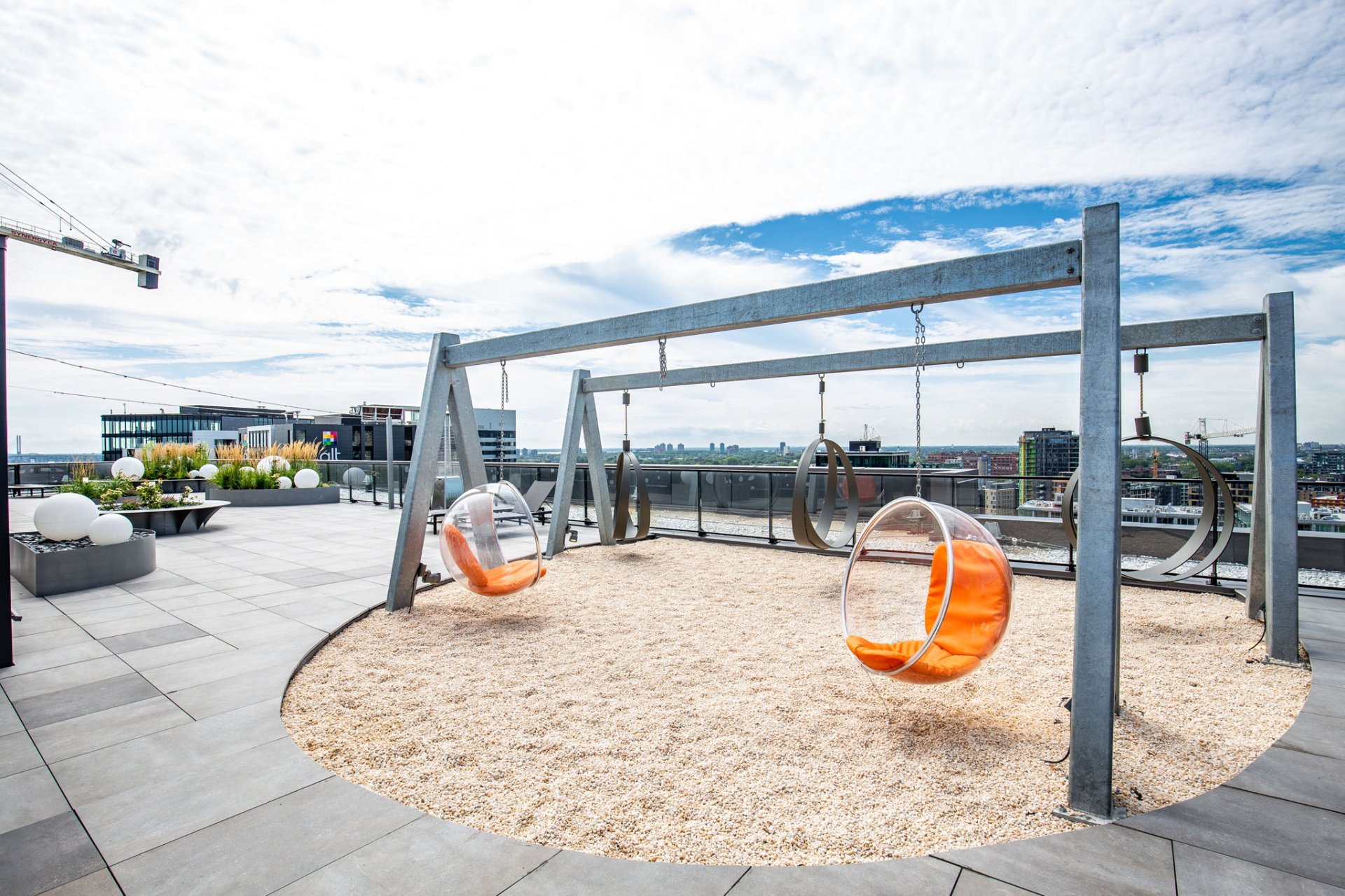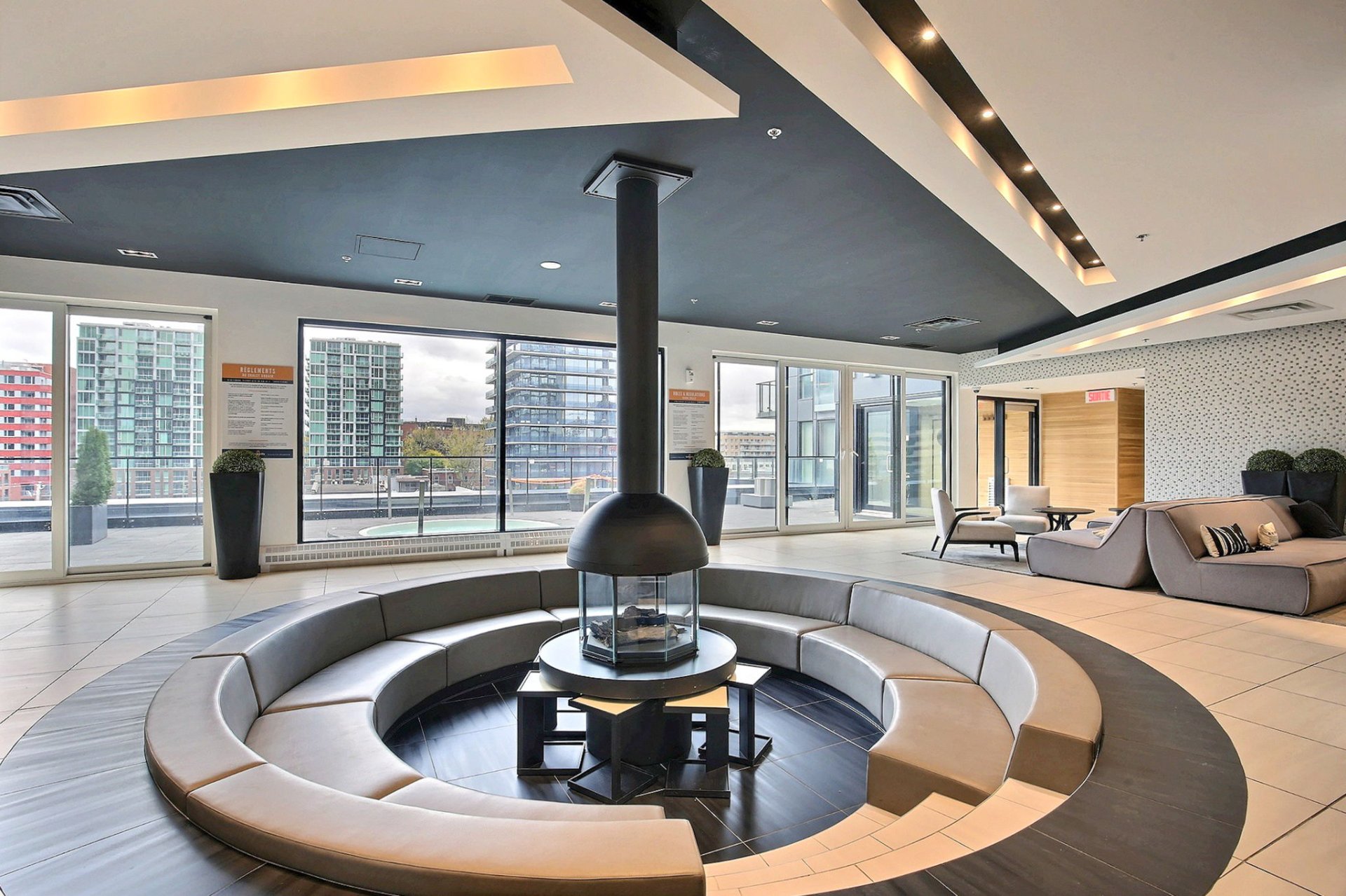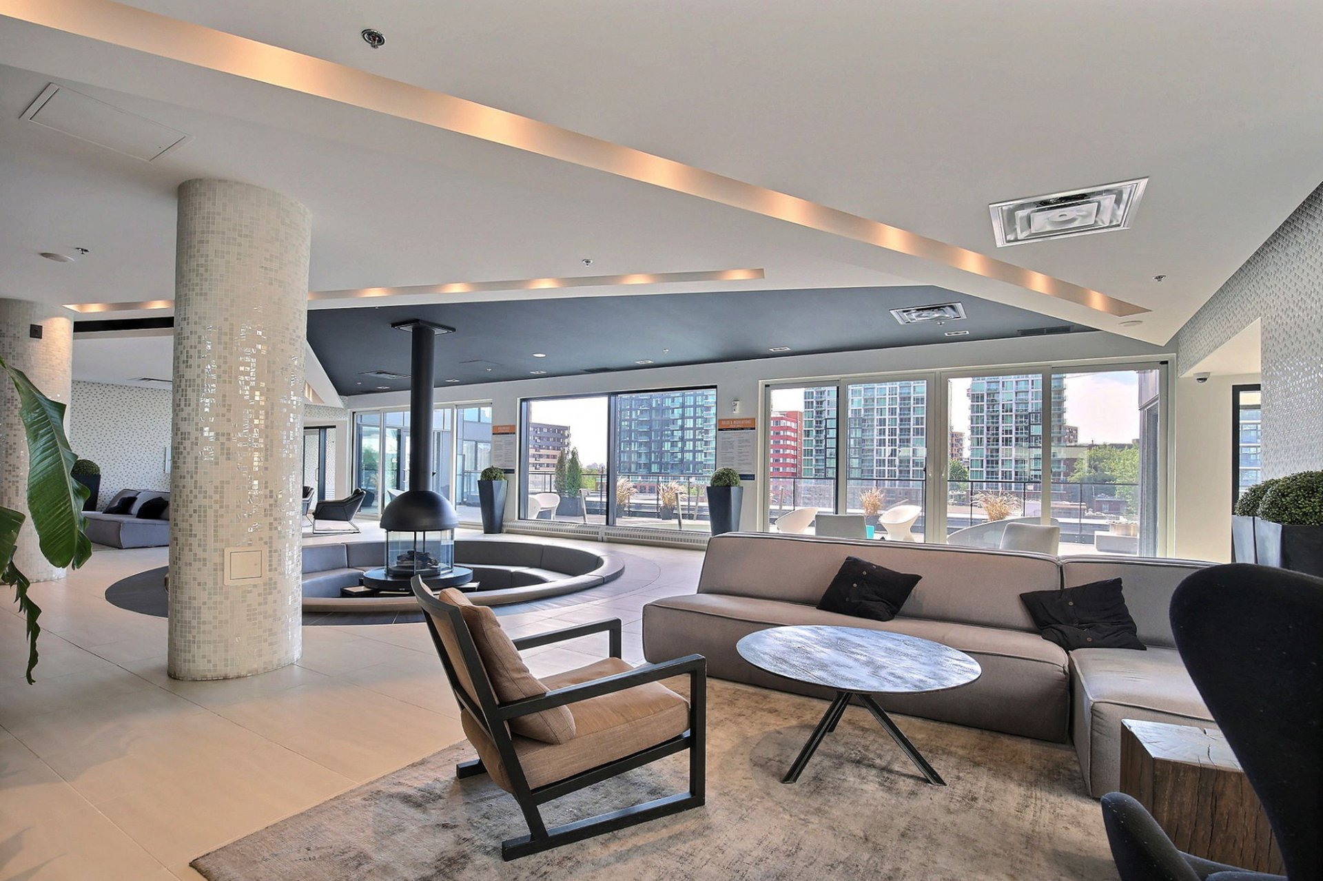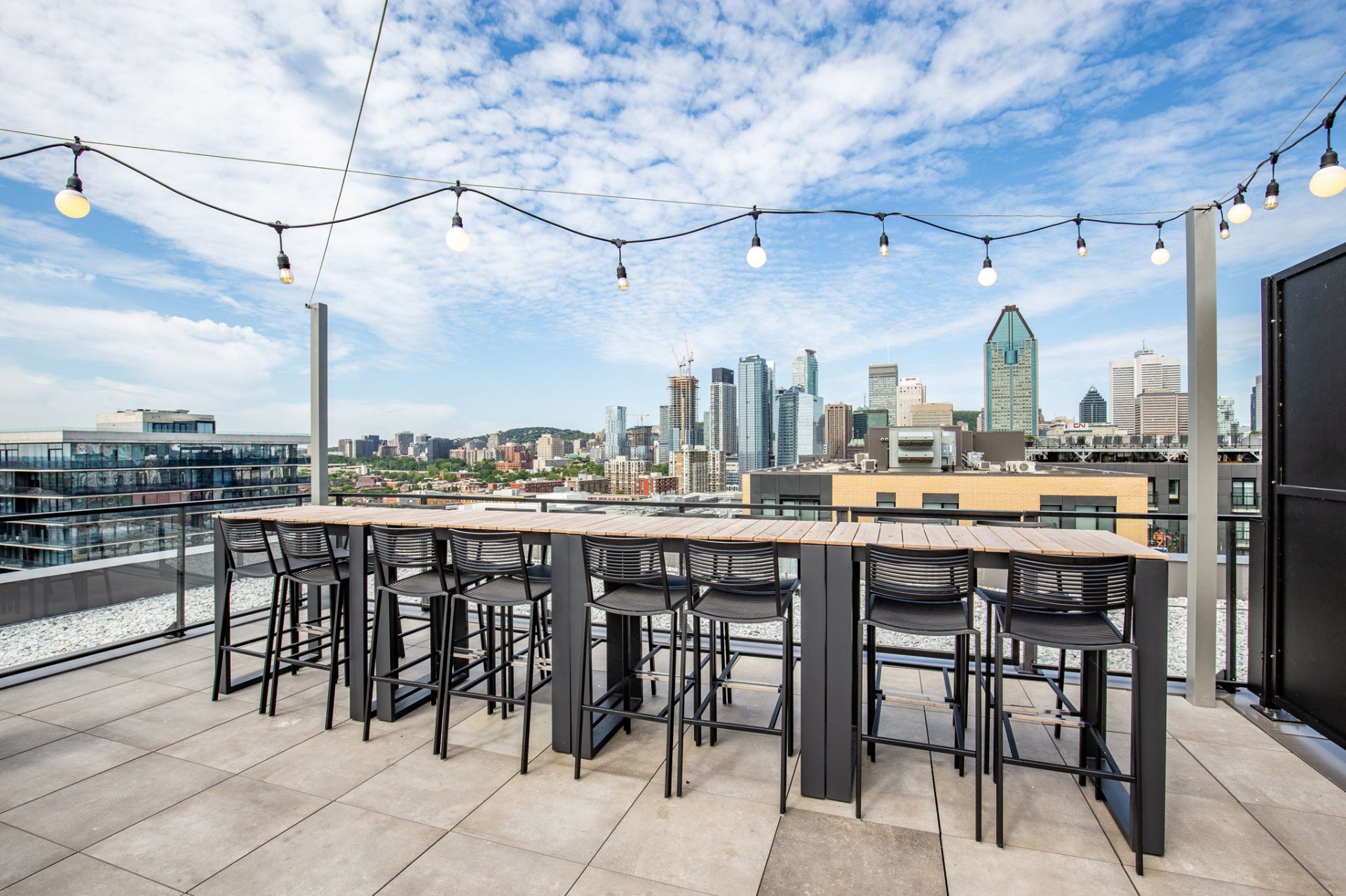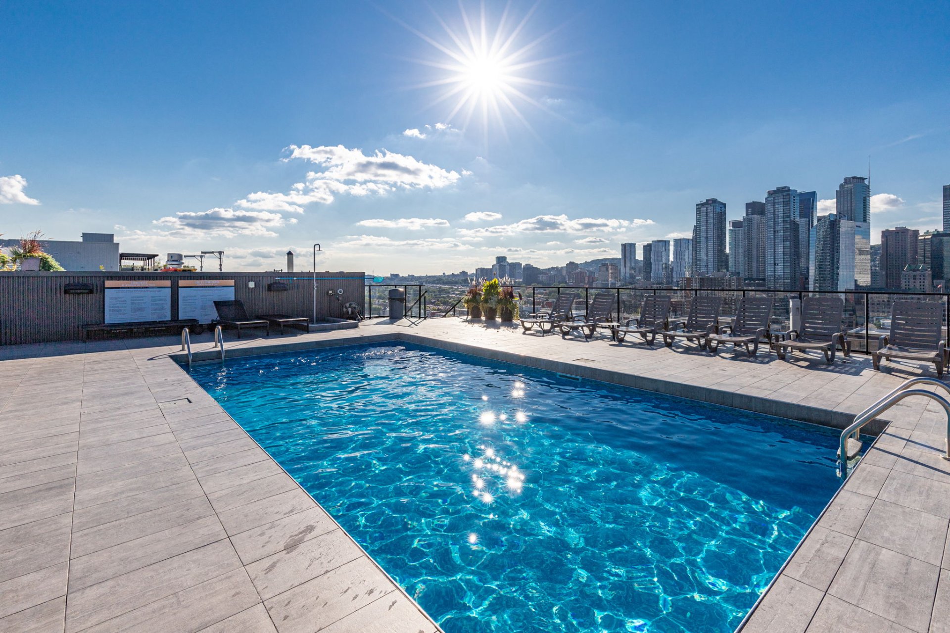 * Terrasse sur le toit aménagée avec piscine, espace BBQ, solarium et vues panoramiques sur la ville