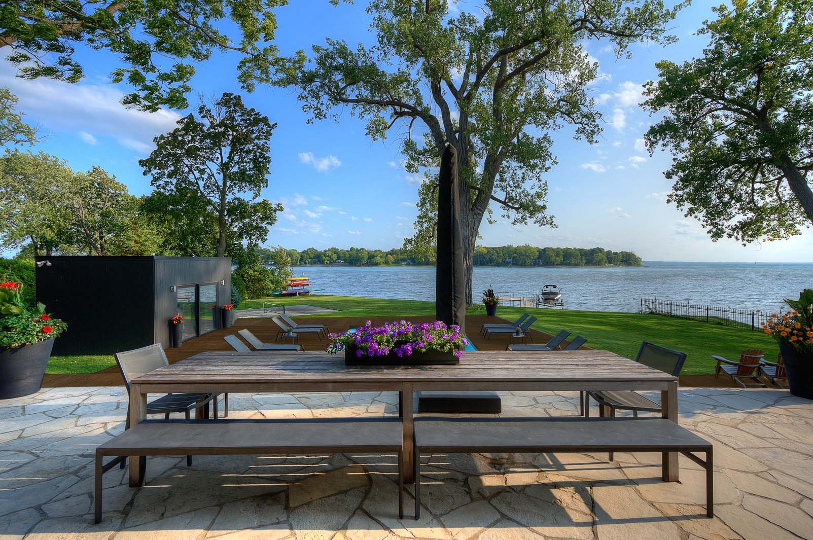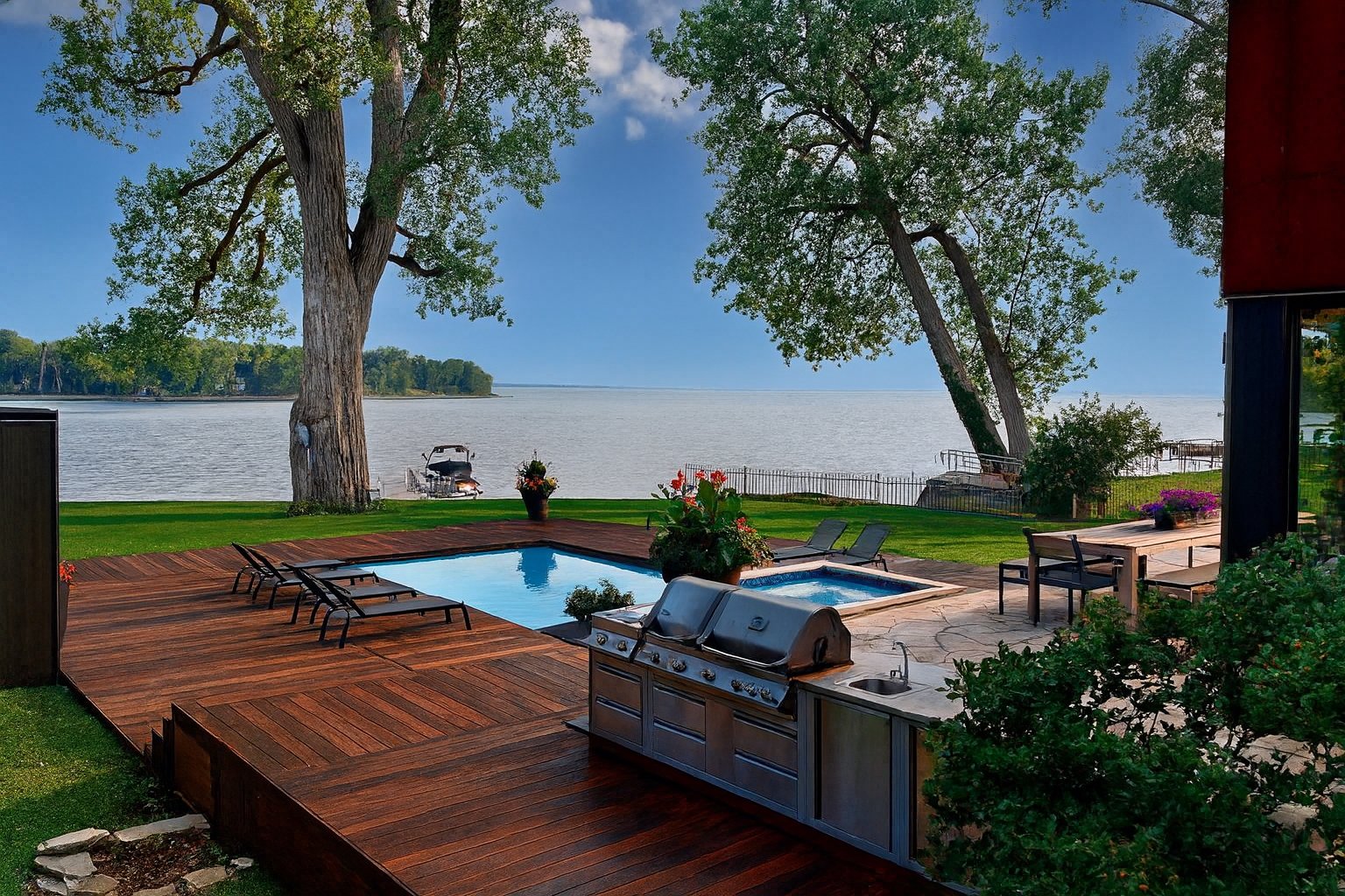 BBQ, gradins et filet de ballon panier, accessoires de piscine, chauffe-eau de la piscine, chauffe terrasse, quai et support à petites embarcations et système d'irrigation avec eau du lac.