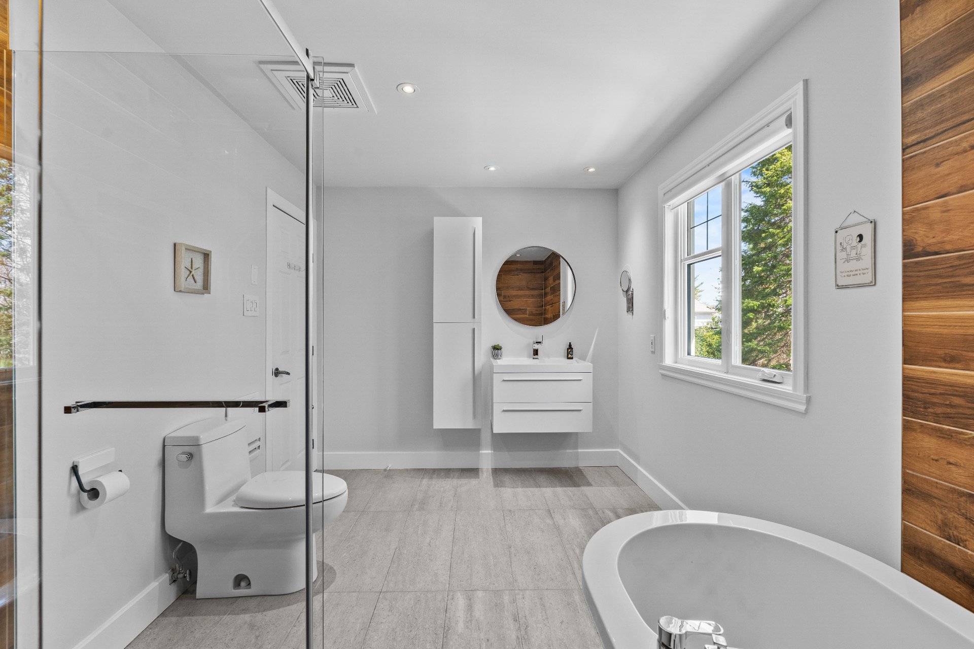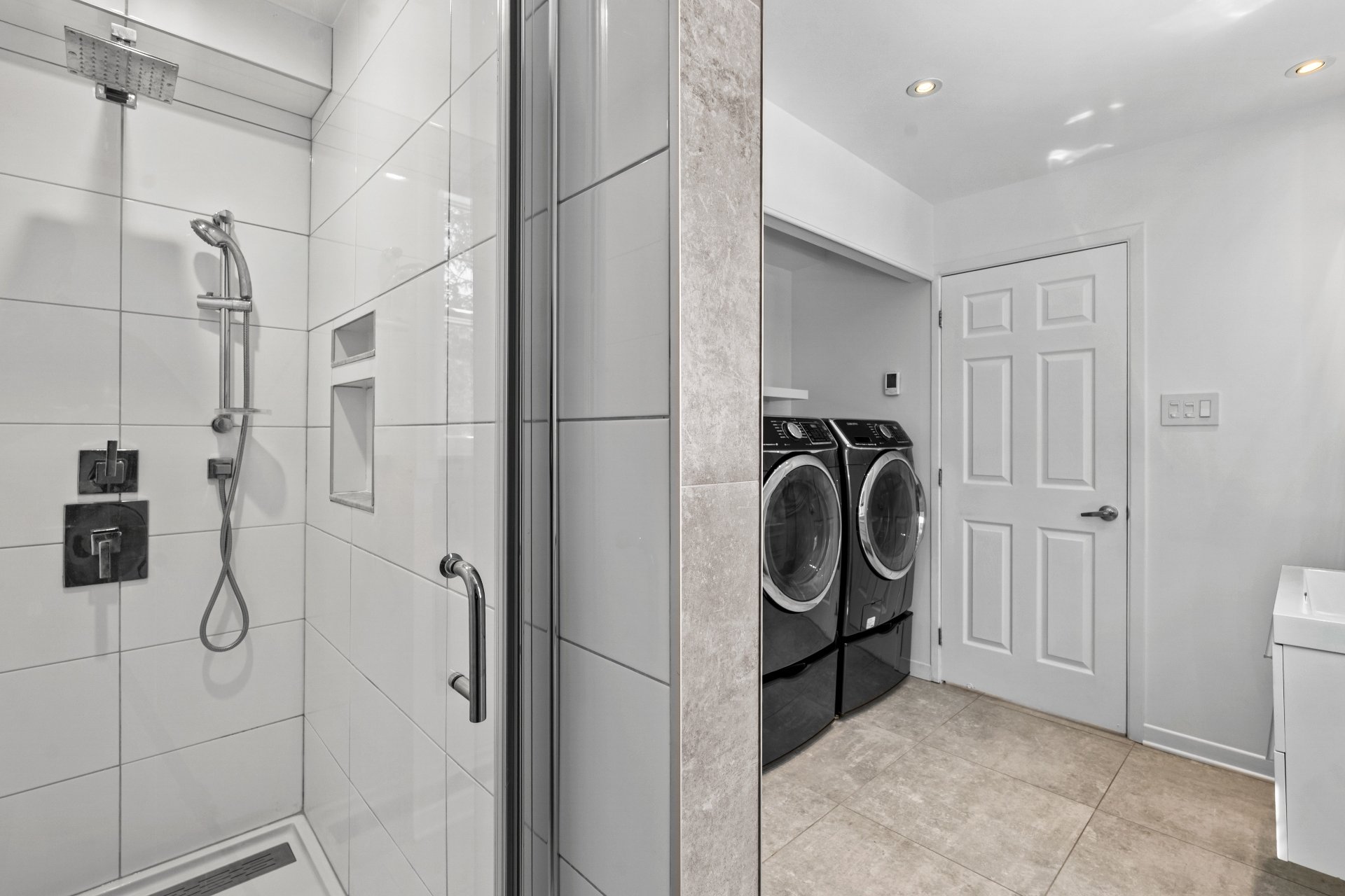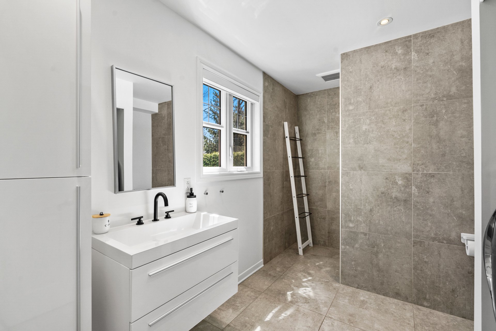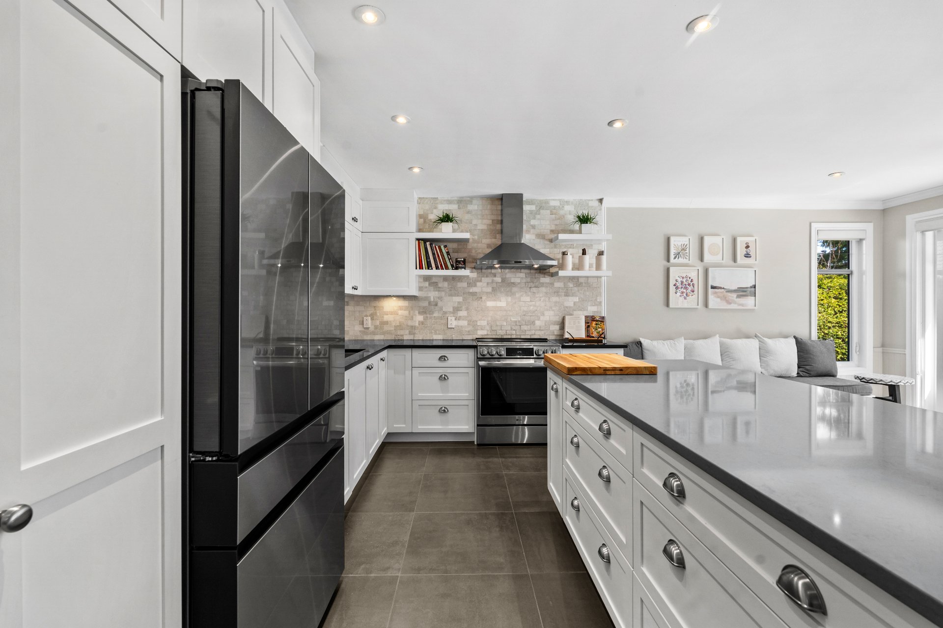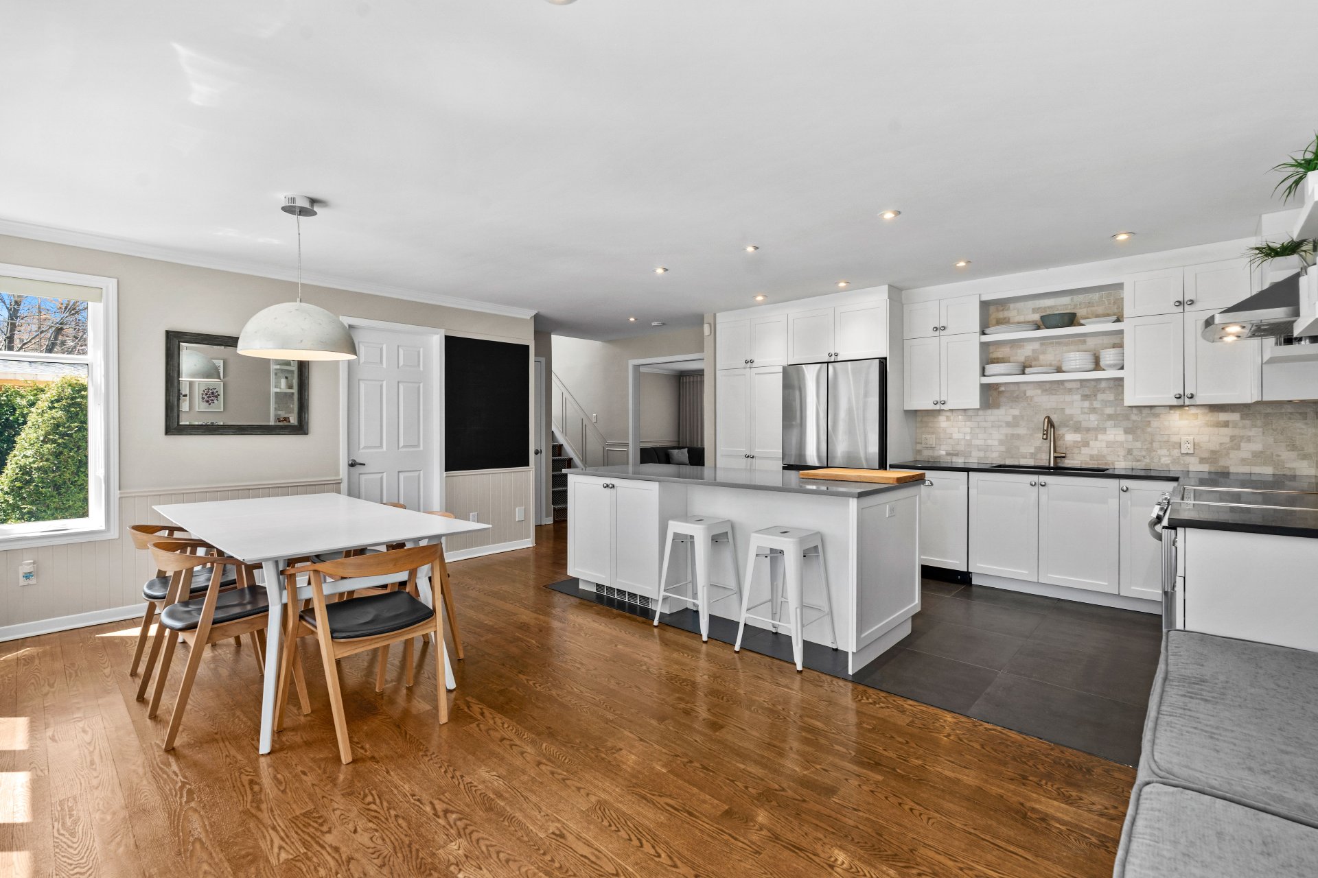 Le rez-de-chaussée, entièrement reconfiguré en 2013, offre un espace de vie moderne et convivial. La cuisine, fonctionnelle et élégante, est dotée d'armoires de bois, de comptoirs de quartz et d'électroménagers récents, et s'ouvre harmonieusement sur la salle à manger. Une salle de bain combinée à la salle de lavage, avec plancher chauffant, complète parfaitement ce niveau.
