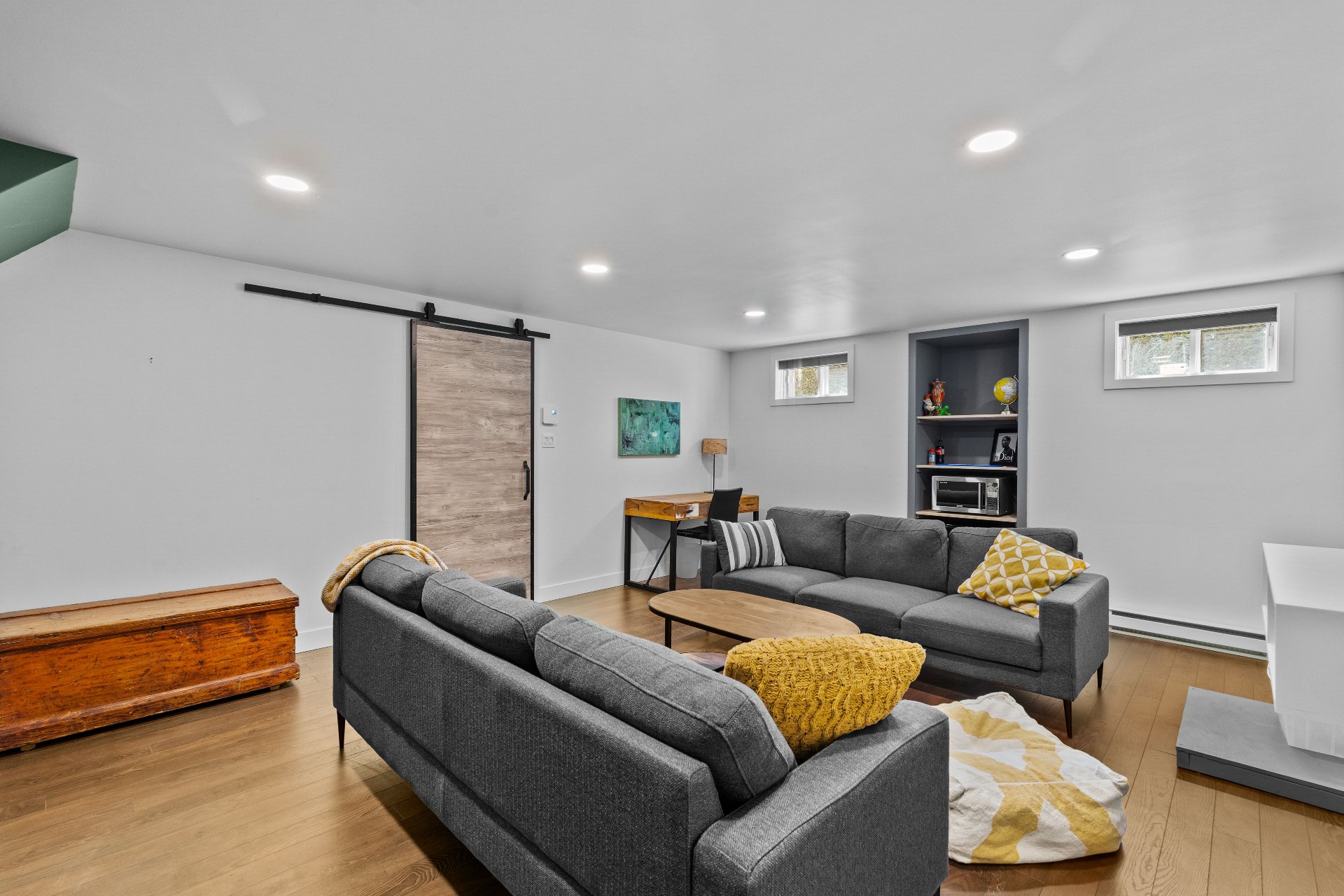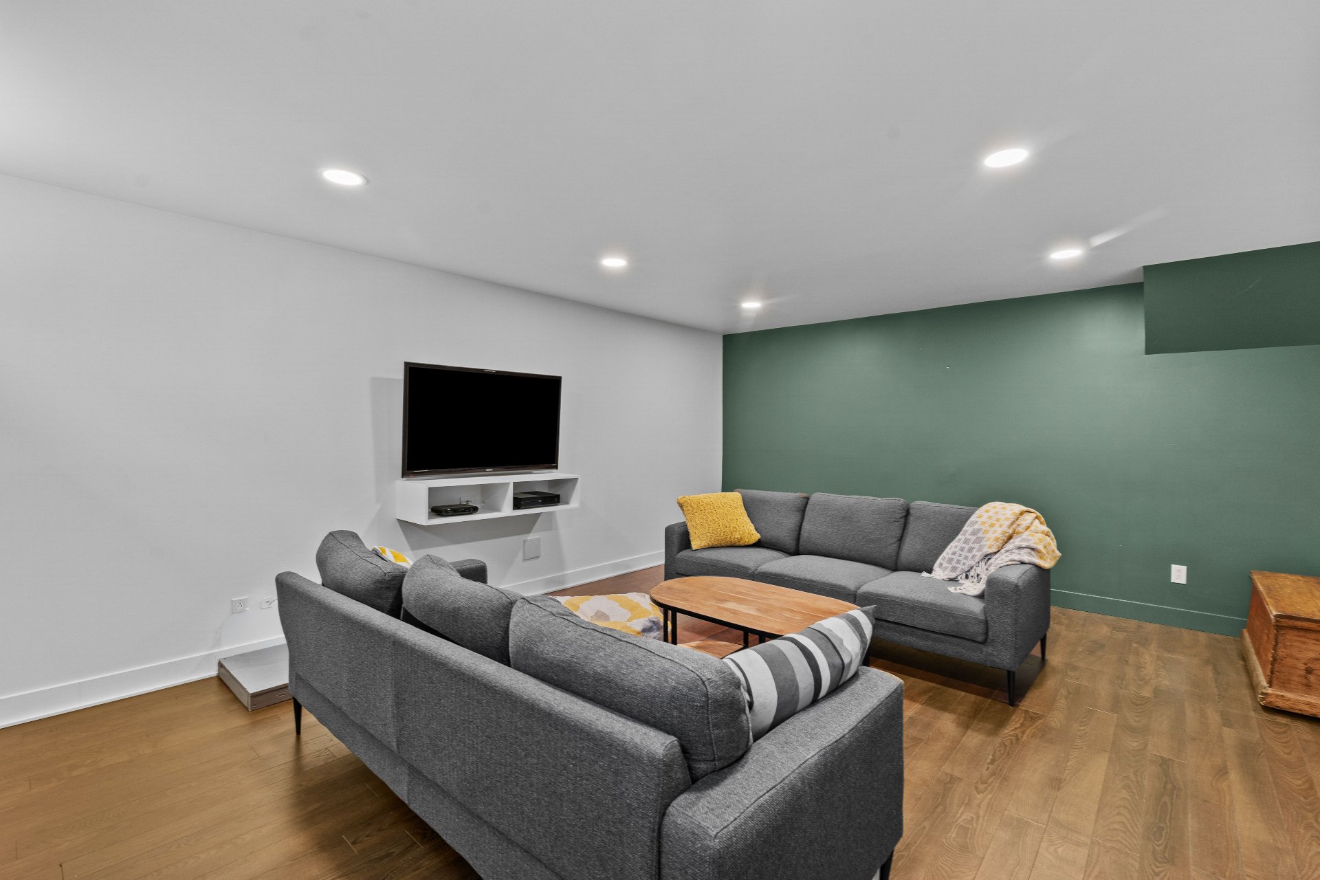 Le sous-sol propose des espaces polyvalents qui sauront s'adapter à vos besoins. Vous y trouverez une salle de cinéma maison récemment aménagée, pouvant également servir de quatrième chambre, une salle familiale ainsi qu'une pièce idéale pour un bureau ou un espace détente (yoga, entraînement, etc.).