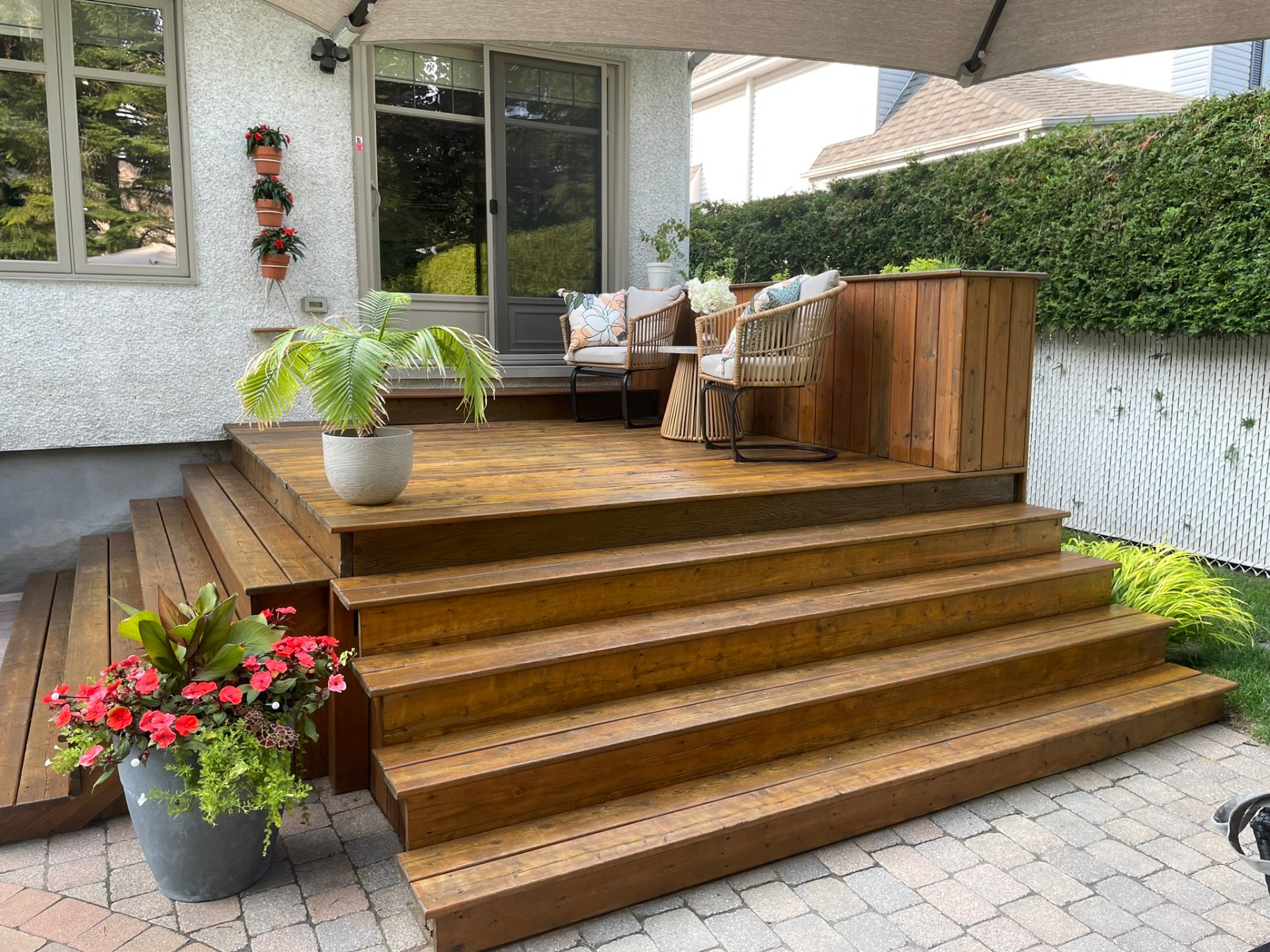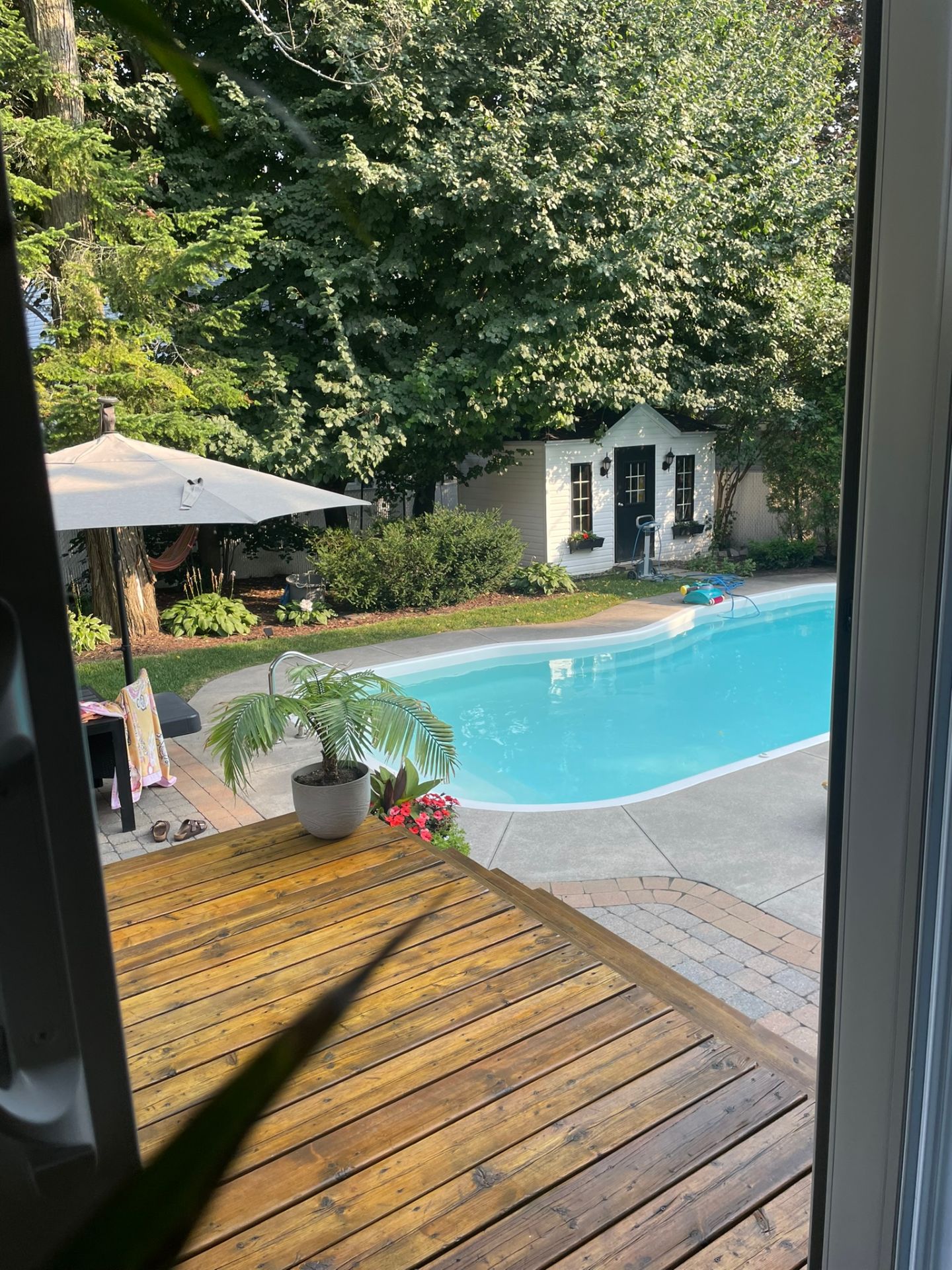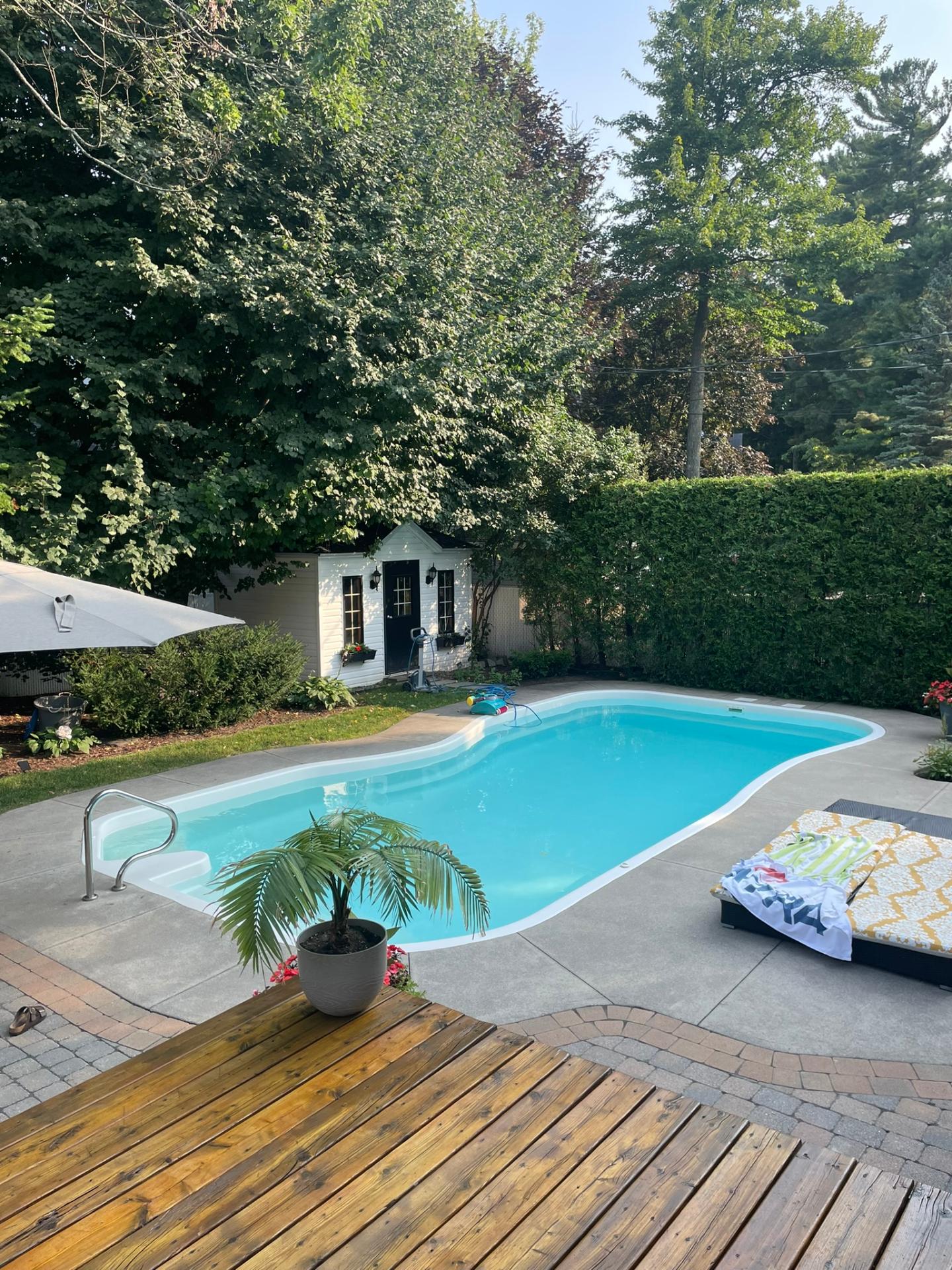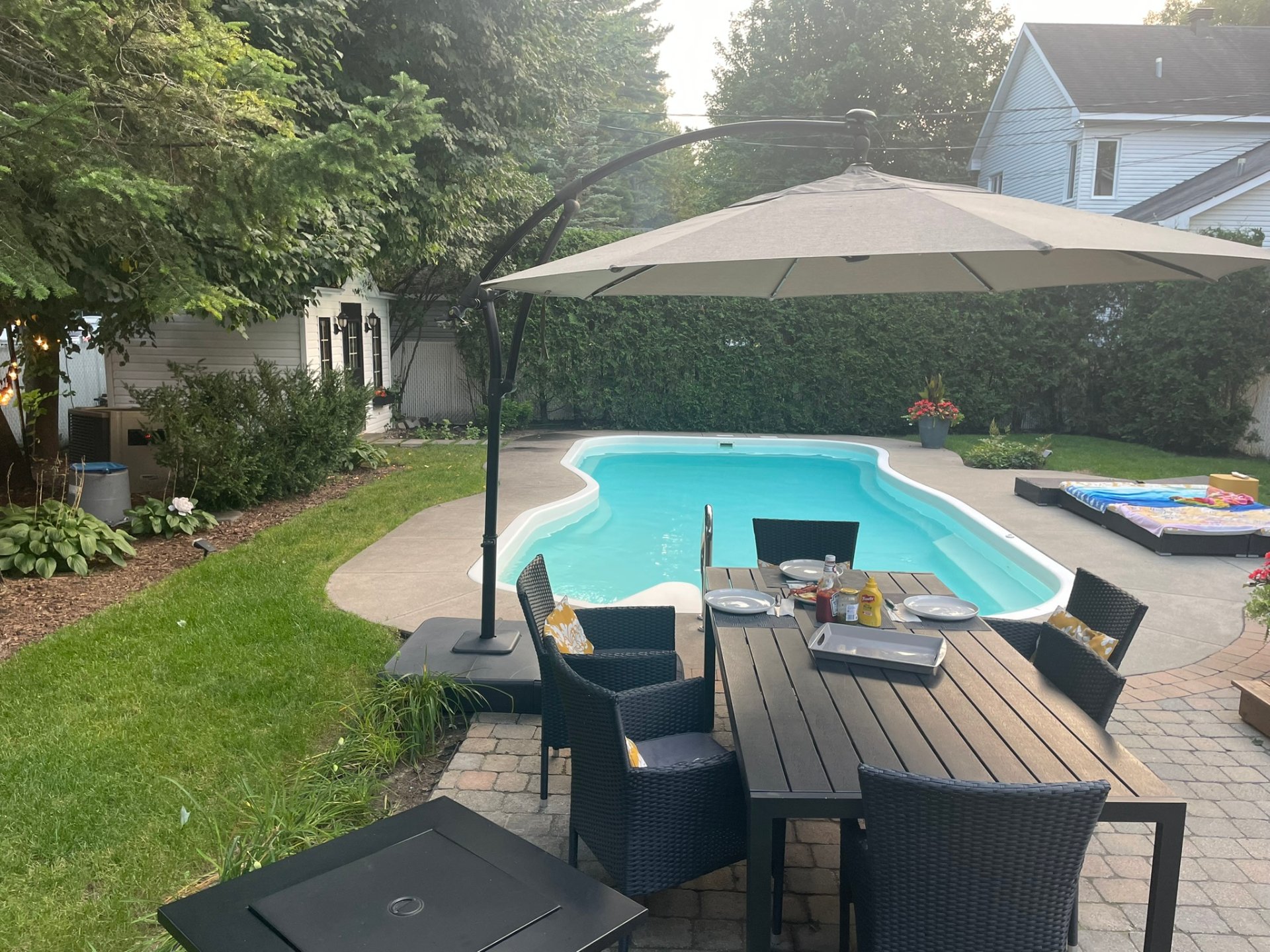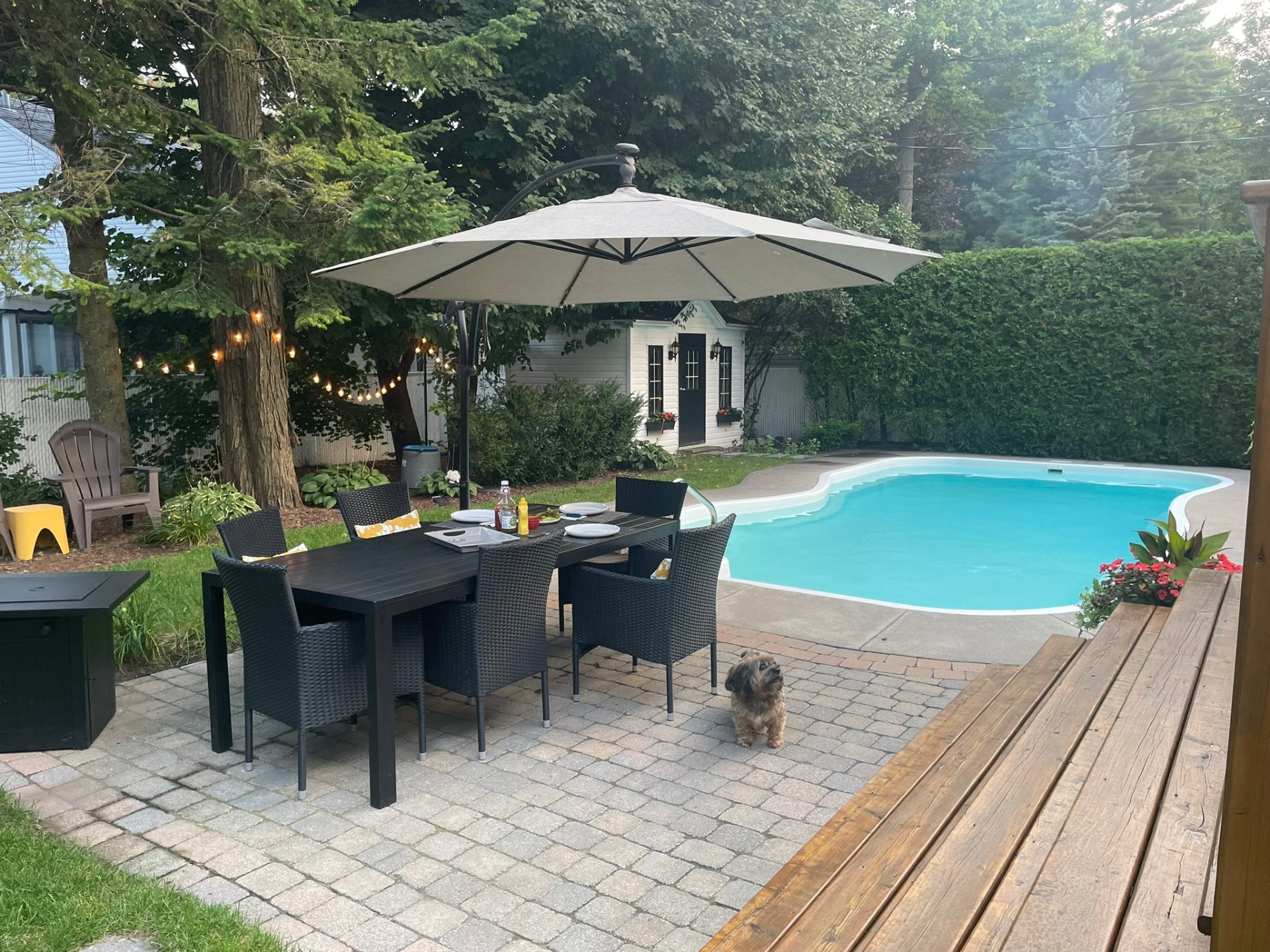 À l'extérieur, la cour intime, ensoleillée,du matin au soir est un véritable coup de coeur avec sa piscine creusée et chauffée et son aménagement paysager soigné, parfaite pour profiter pleinement de la belle saison.