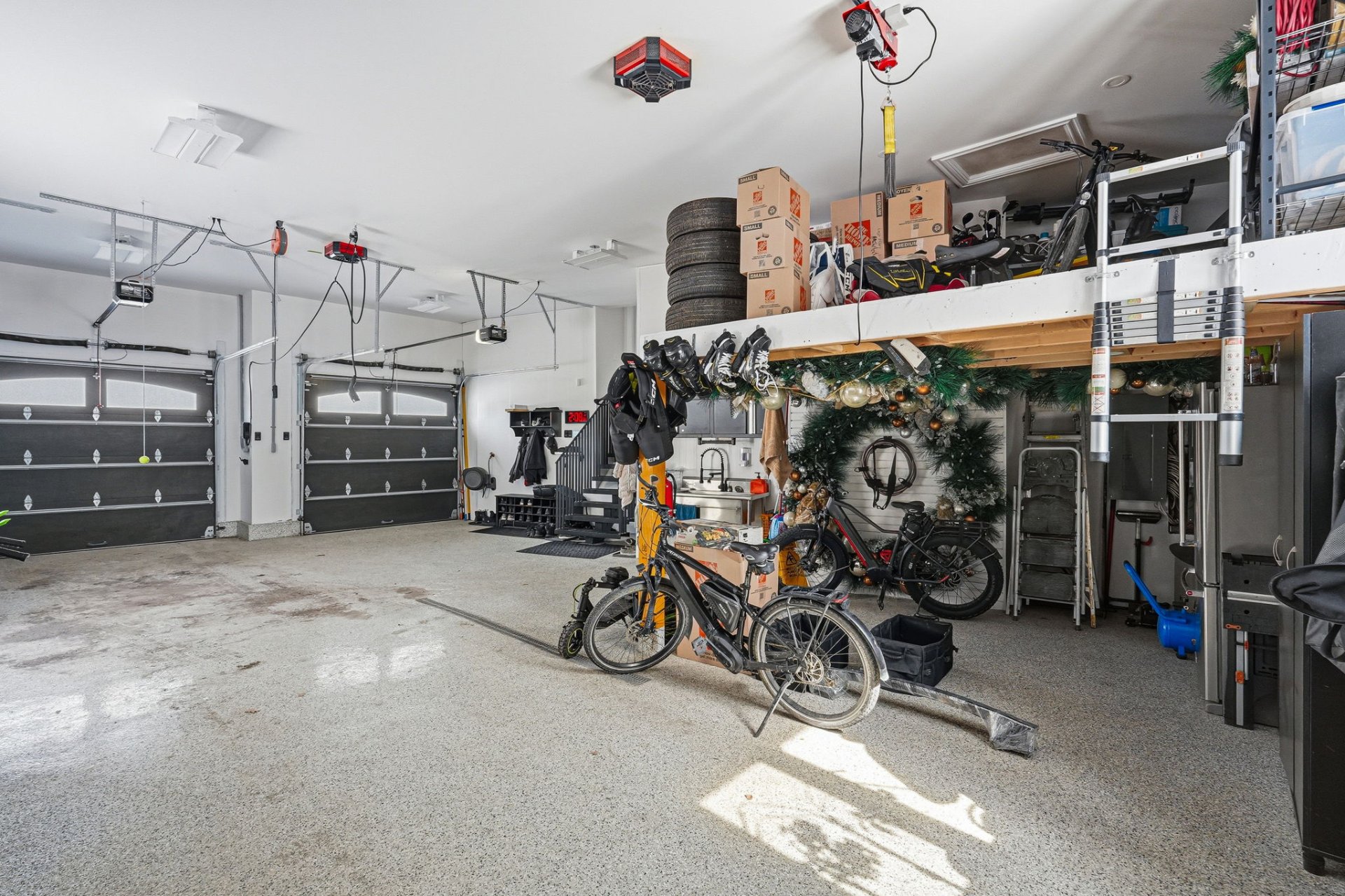 - Vaste garage de largeur double parfaitement organisé pouvant accueillir jusqu'à 4 voitures (si on enlève le rangement suspendu).