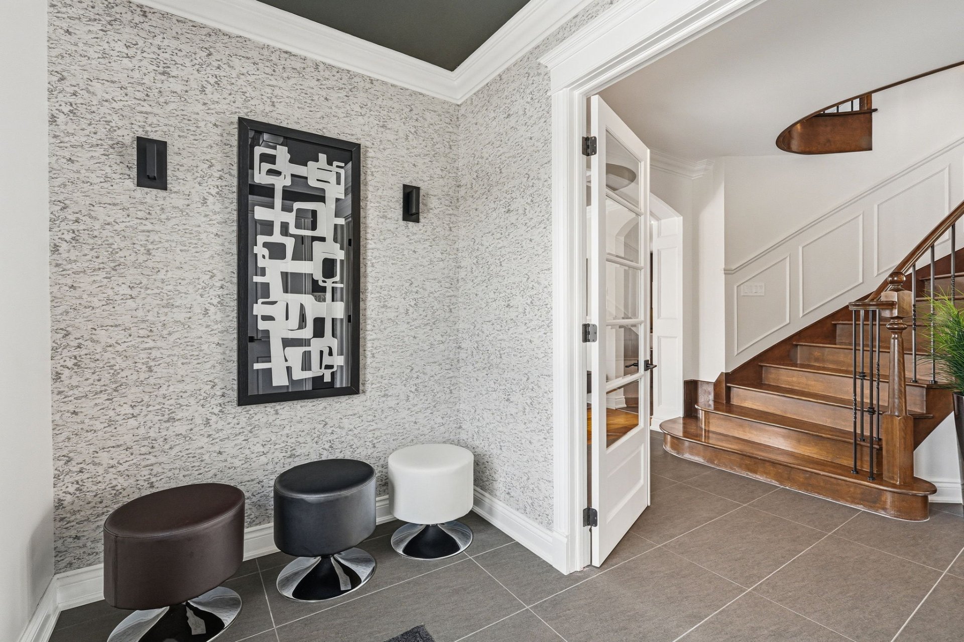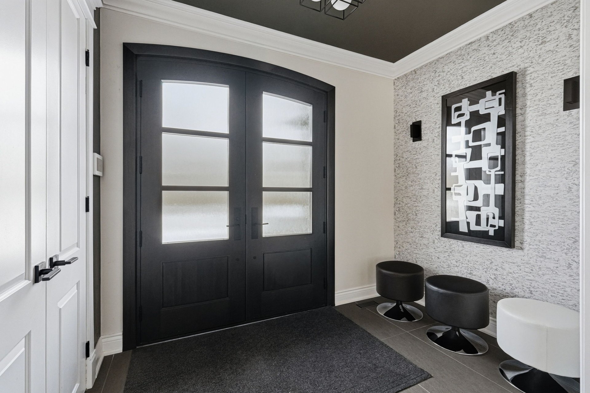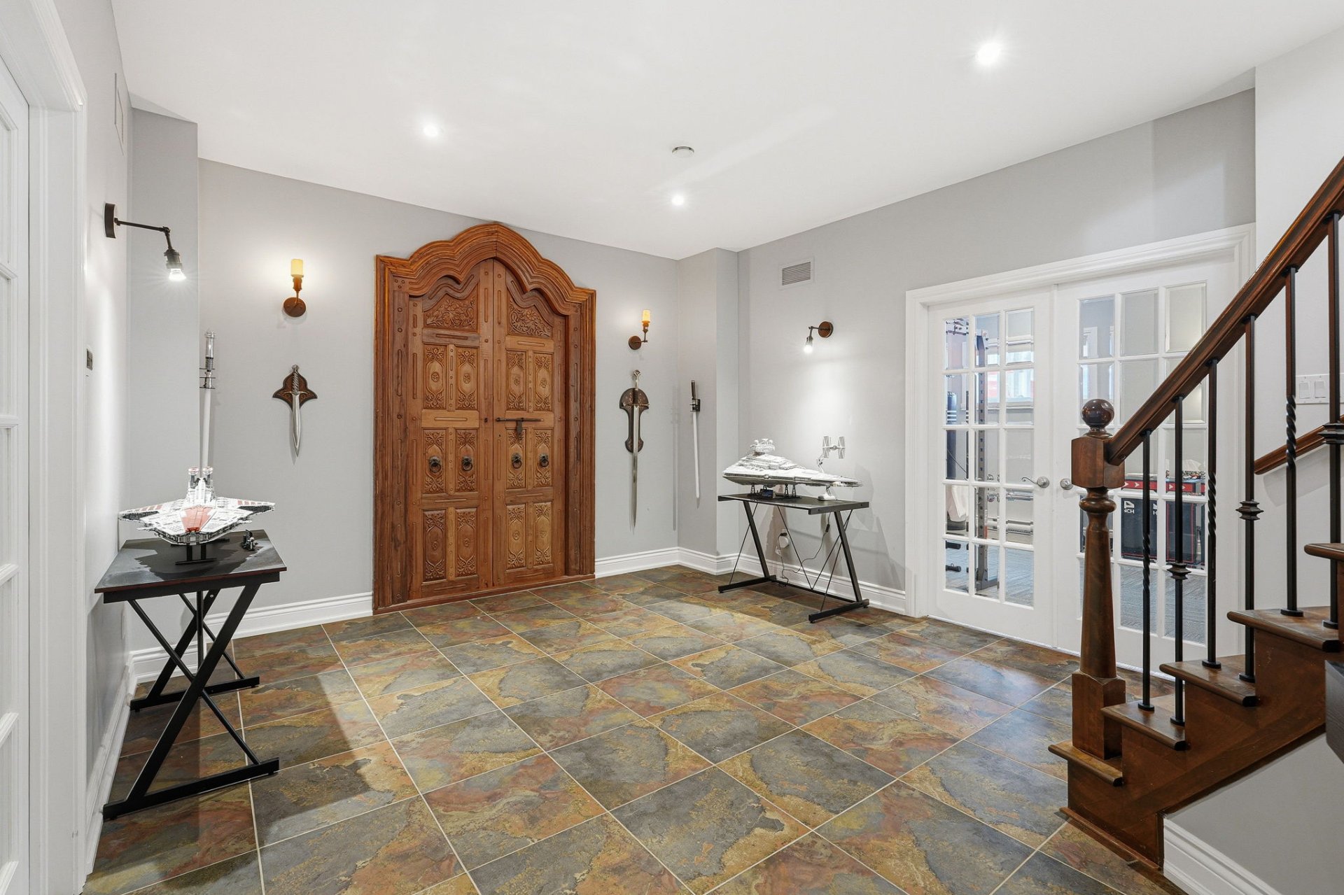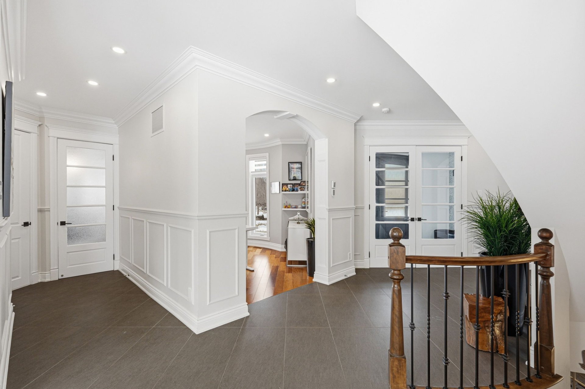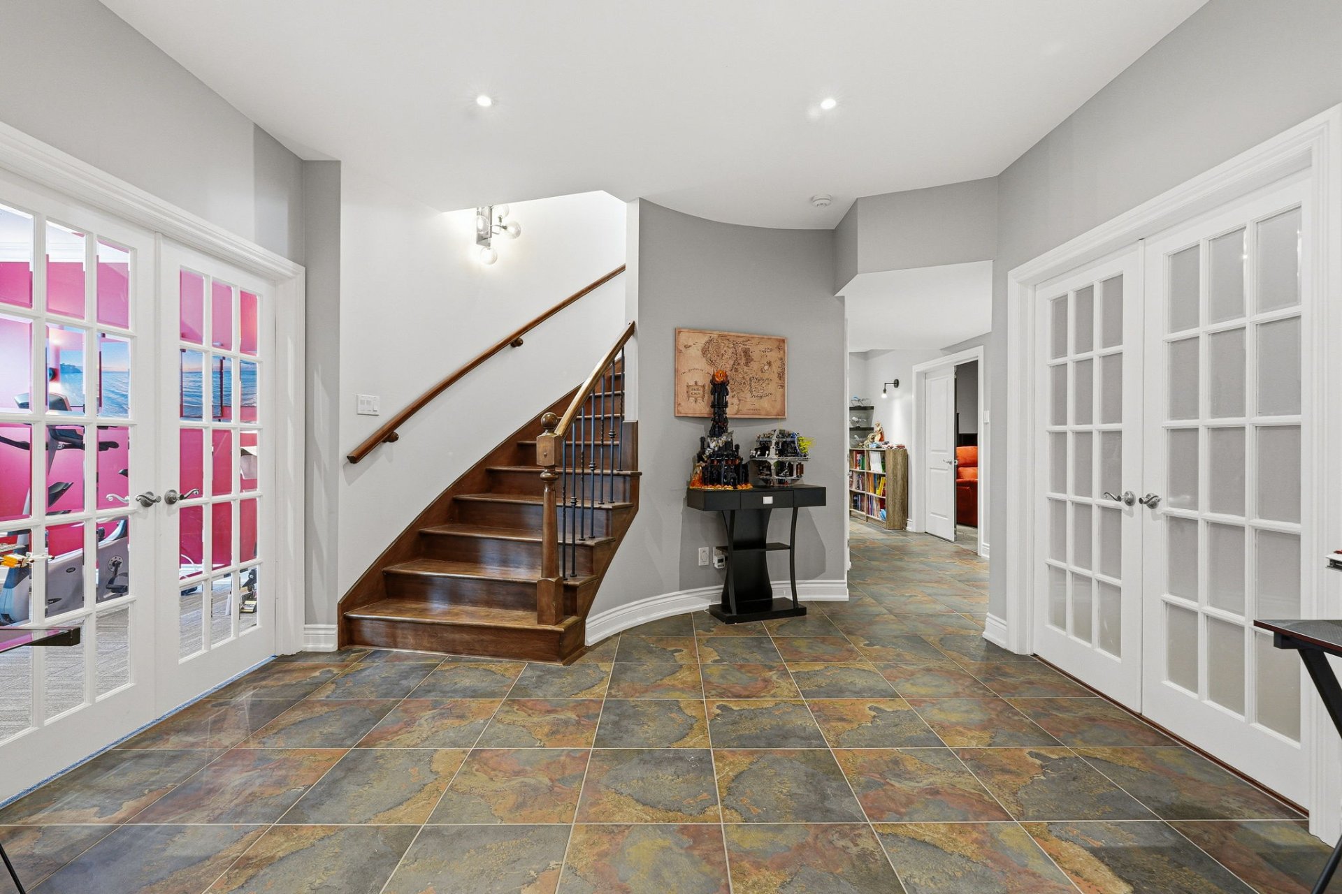 - Vestibule avec rangement et portes françaises menant au hall d'entrée.
