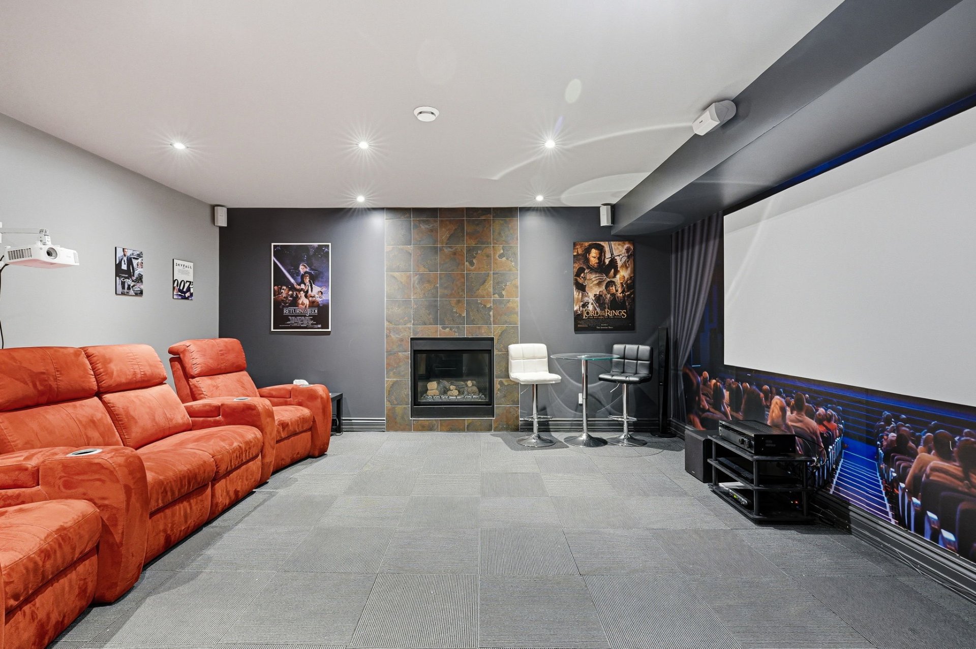 - Impressionnante salle de cinéma avec foyer au gaz accentuant l'ambiance chaleureuse et tamisée de celle-ci.